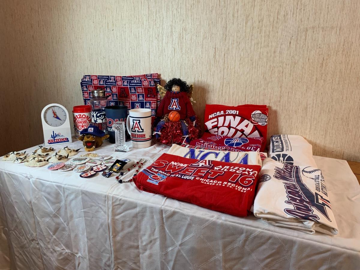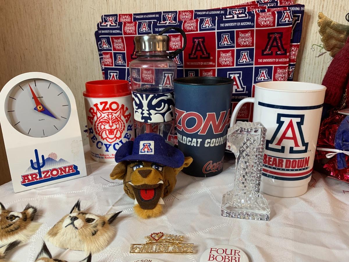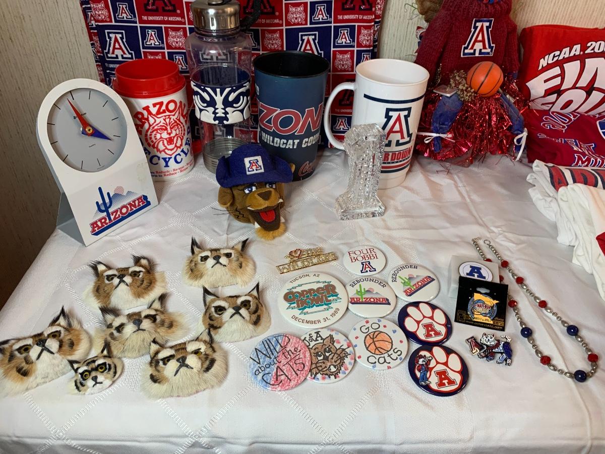 Placemats, Cups, Pins, Jewelry, Shirts (of all sizes), UofA Angel, and more Wildcat Memorabilia.