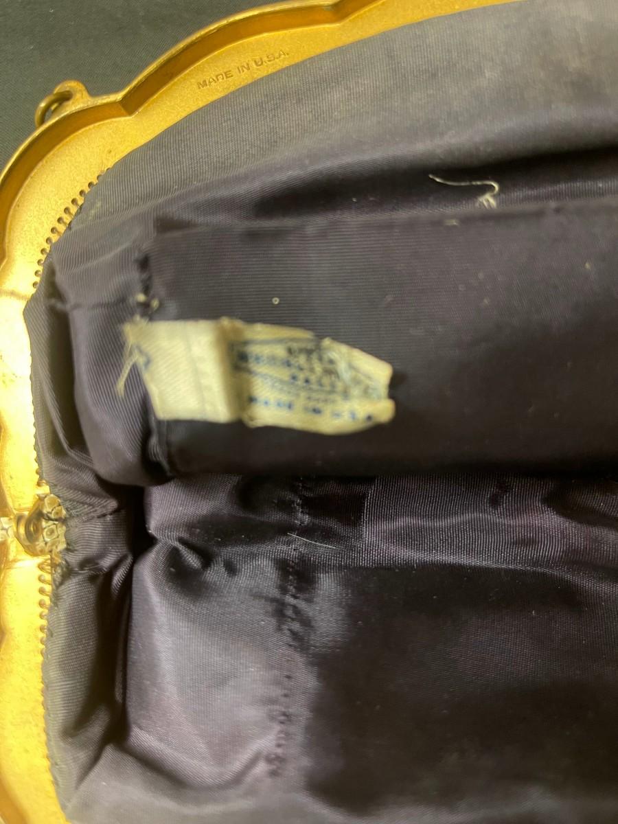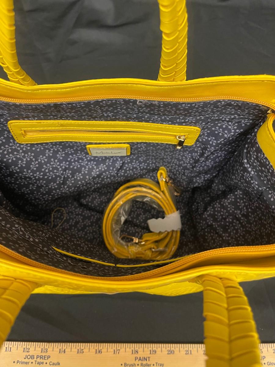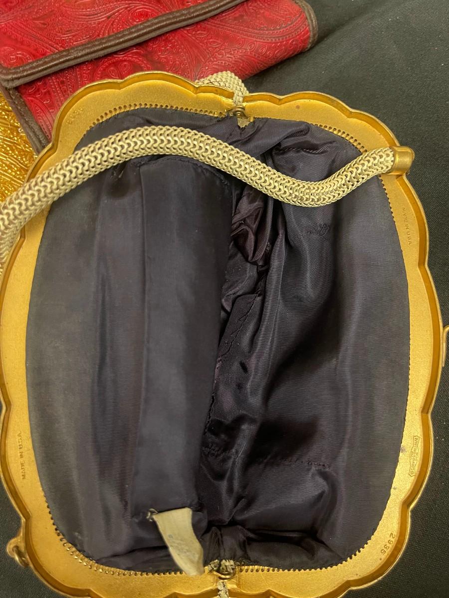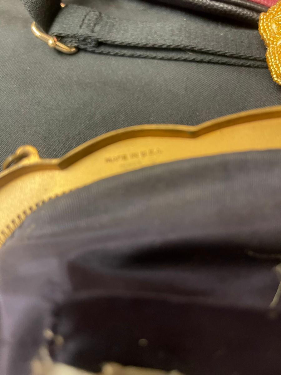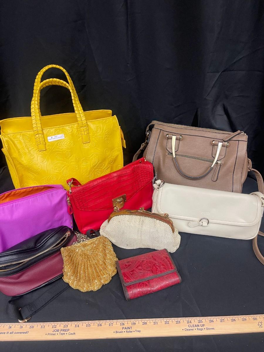 Purses / Handbags:9 La Regale, Whiting & Davis, Lulu, Relic, Mona Luxe, et al Lot of 9 assorted handbags. La Regale vintage gold beaded purse; Red Lulu purse, small ink spot as shown; Relic tooled wallet- red & brown; Purple cosmetic bag; burgundy and black leather like fanny pack; Moda Luxe yellow tote w/ long strap, new; Vintage Whiting & Davis, white mesh handbag; Patty white leather shoulder bag, Taupe purse w/ gold accent hardware, has shoulder strap;