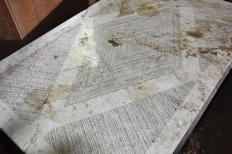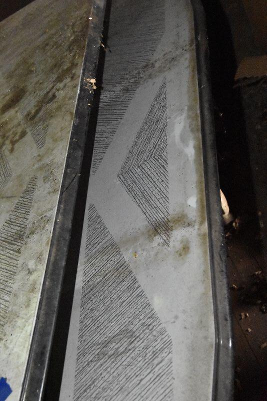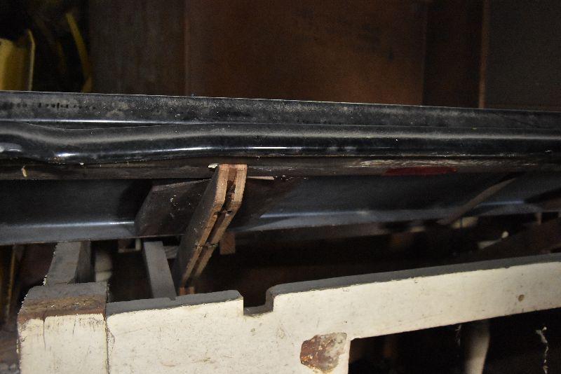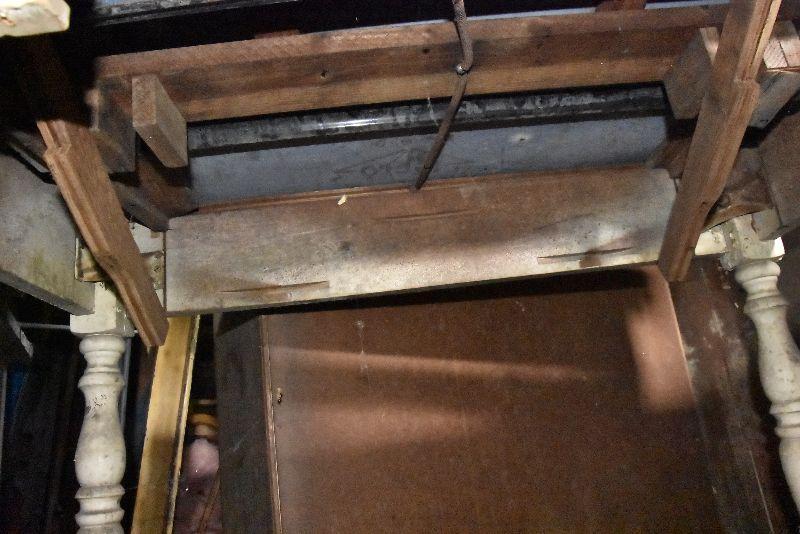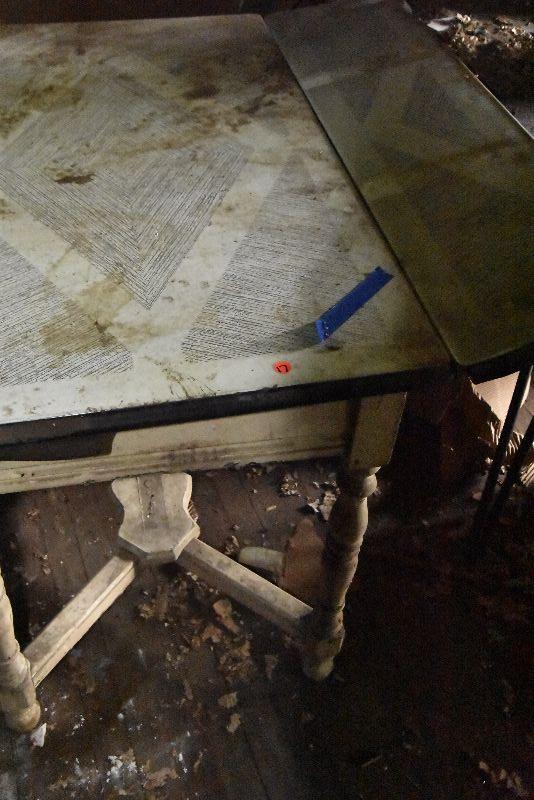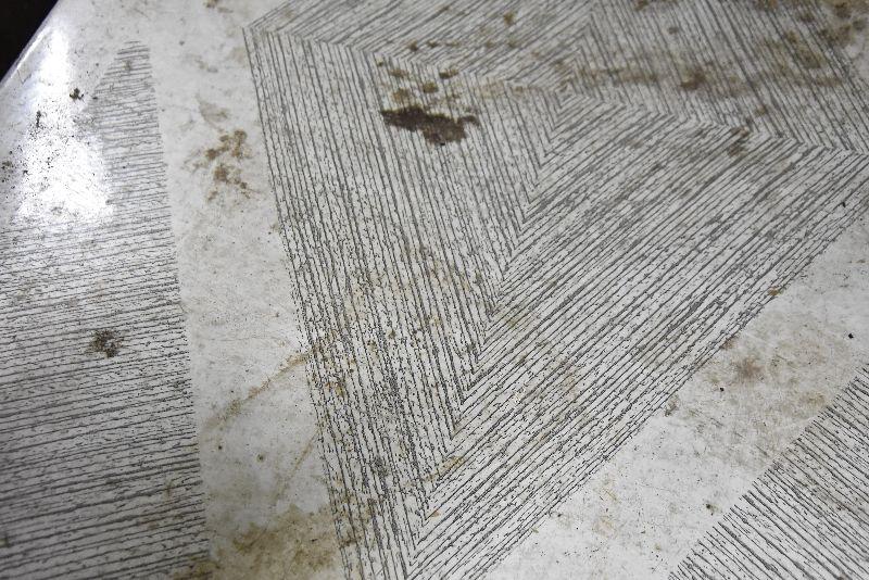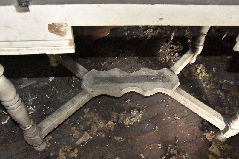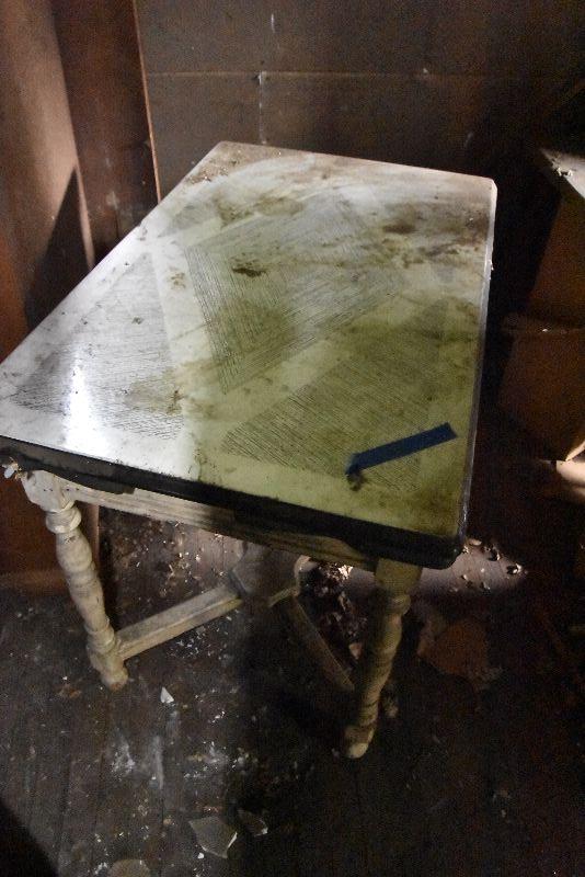 Enamel is in great shape, but the table mechanics are not. This lot is in the second story of the garage and must be retreived from there. Things are quite dirty and there was evidence of mouse droppings. Please clean all items before bringing into your home.