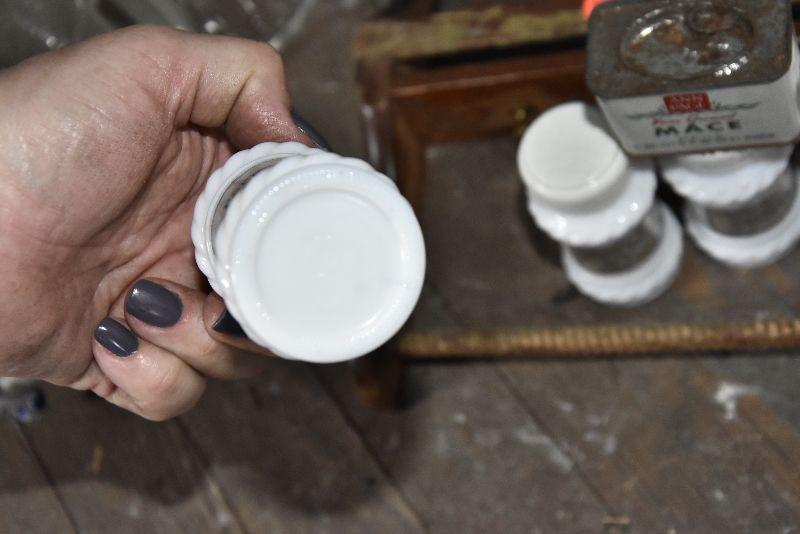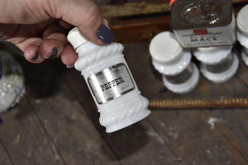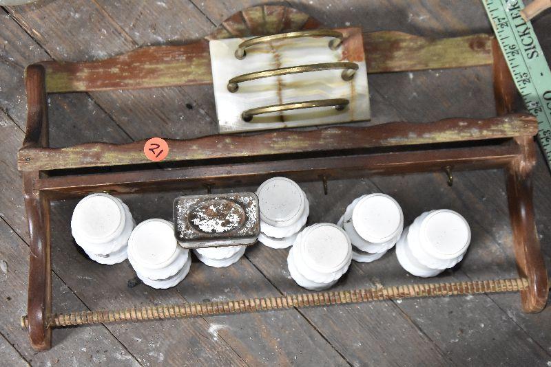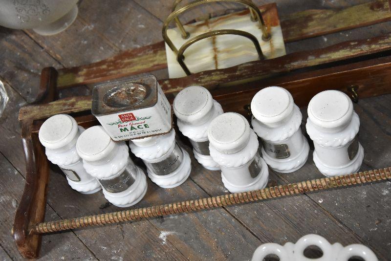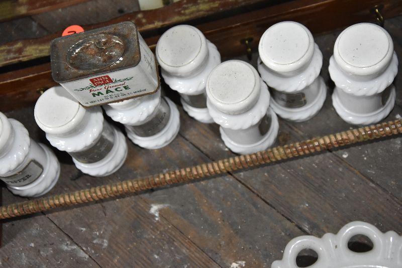 Up G Lot 21: Vintage Milkglass Spice Bottles and Shelf