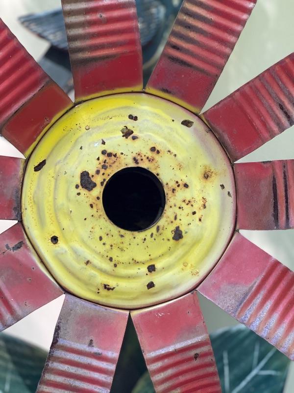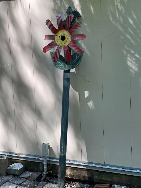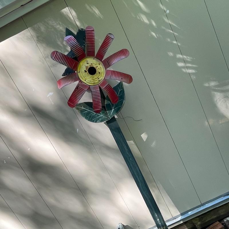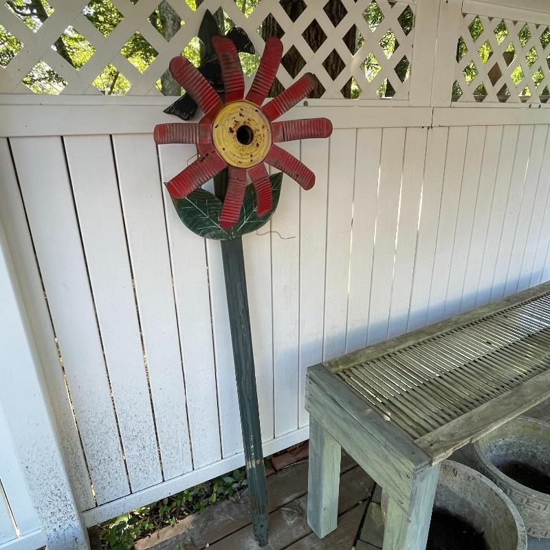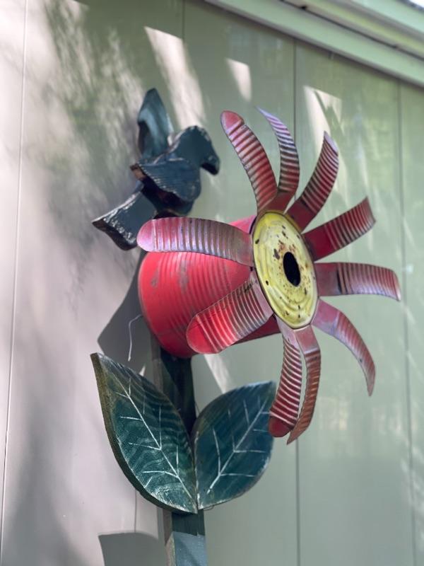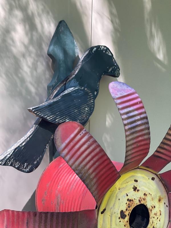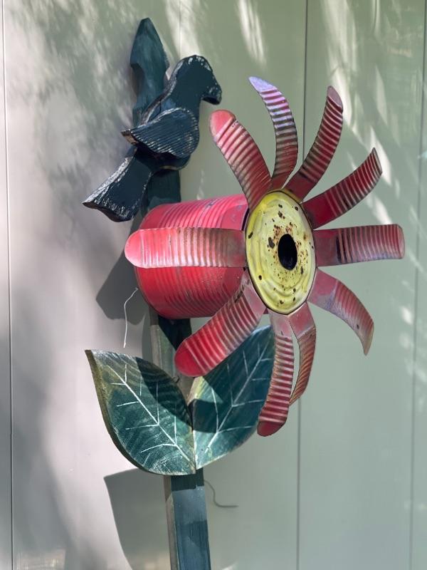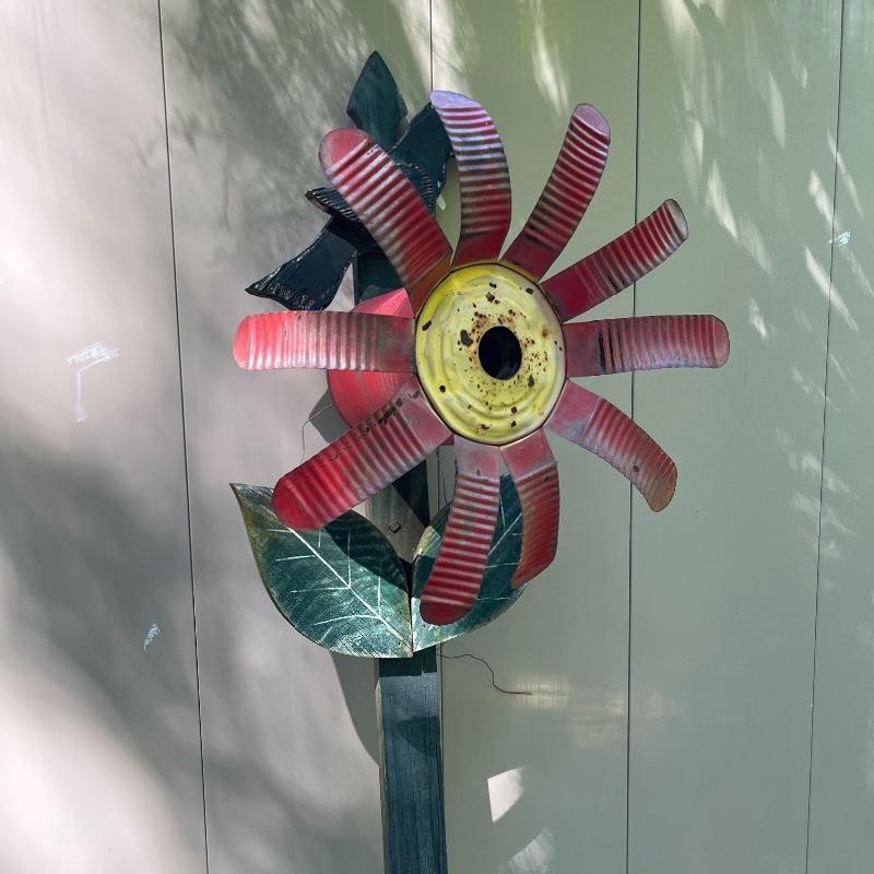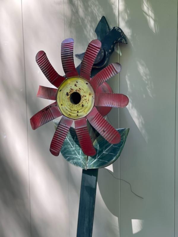 Bright and cheery, and sweet patina, This flower birdhouse can easily be put in the ground or mounted to a tree or gate.