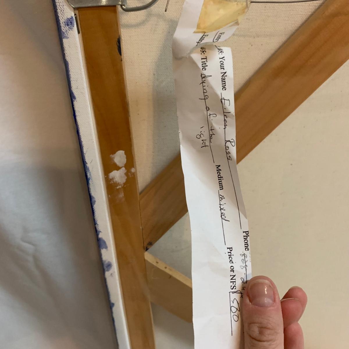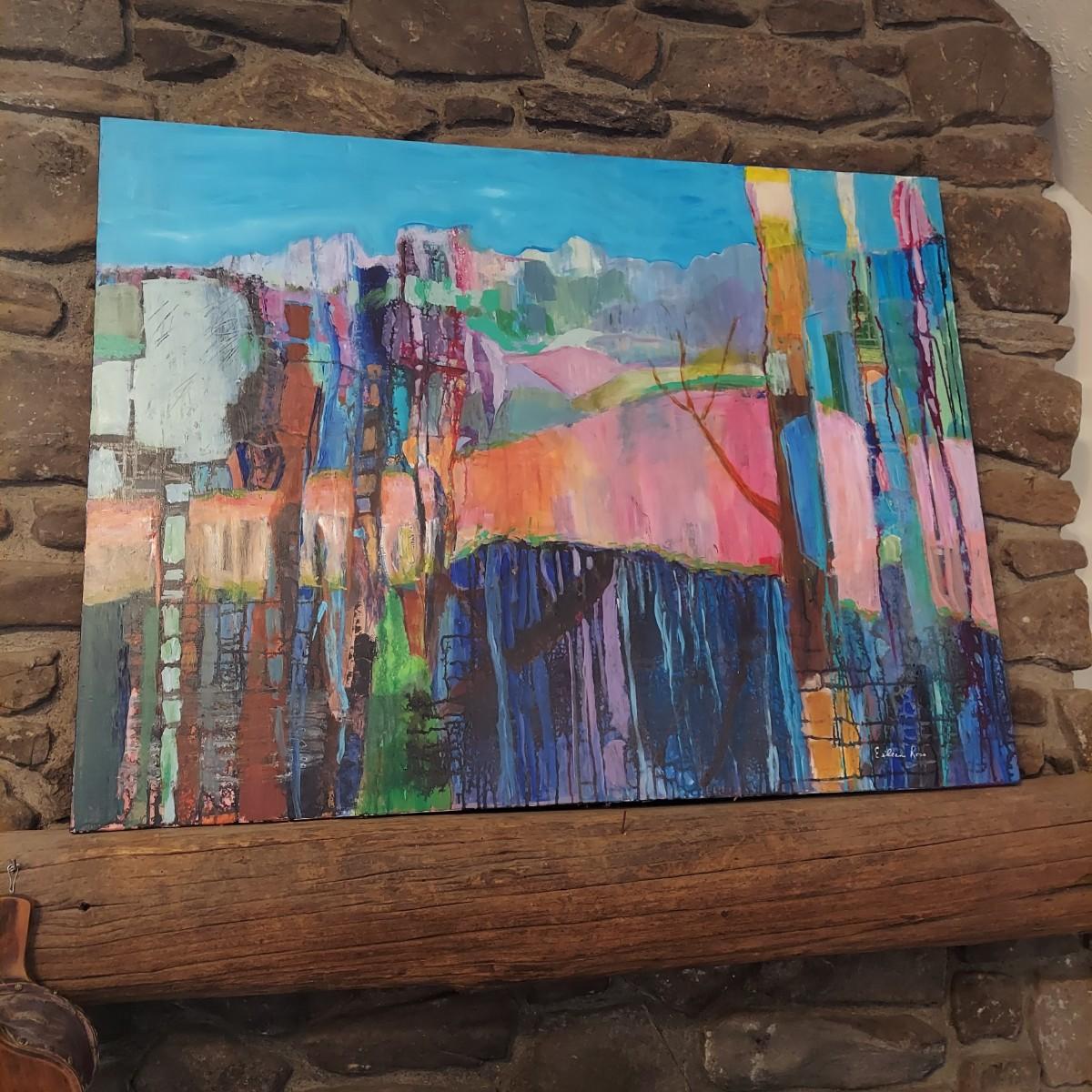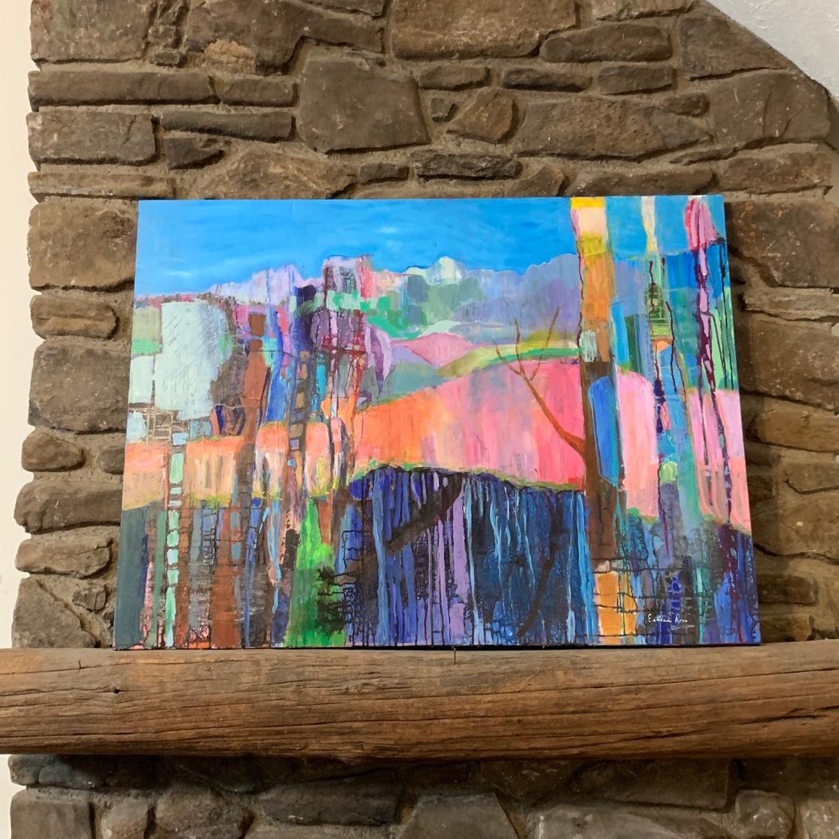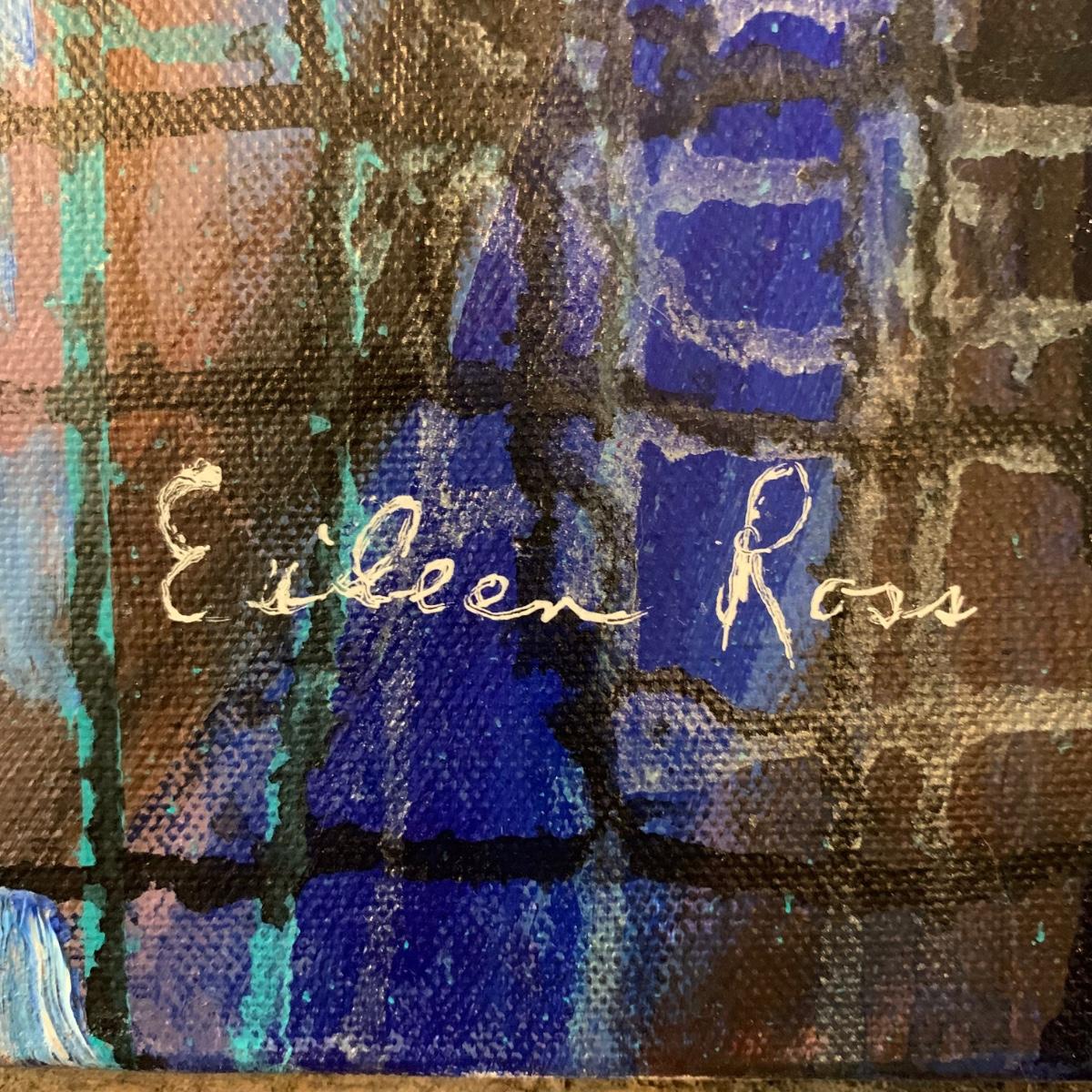 Original painting on canvas by Eileen Ross title ‘Dying of the Light’. Painting is signed by the artist and information attached says it is mixed mediums. Canvas has wooden supports on the back and a wire to hang it horizontally. Canvas measures 48” x 36”. It is 0.75” thick.
