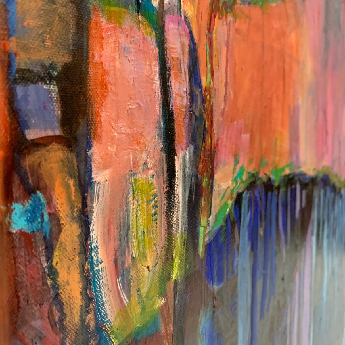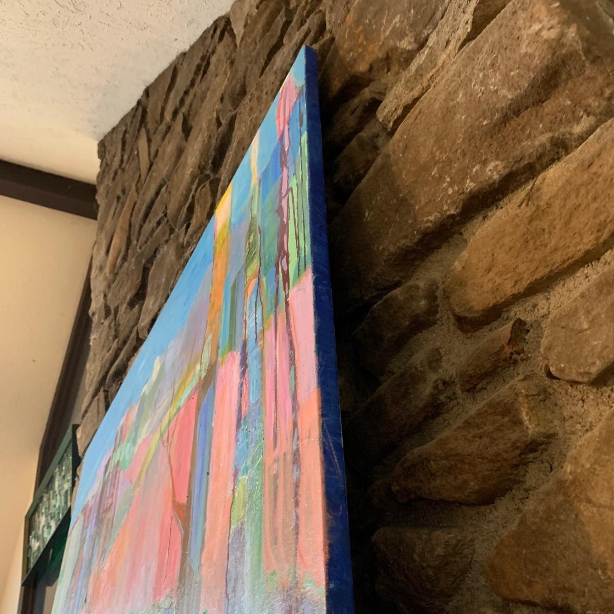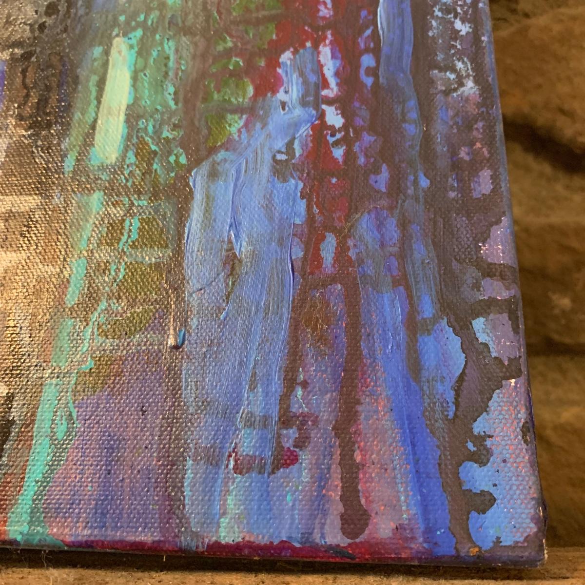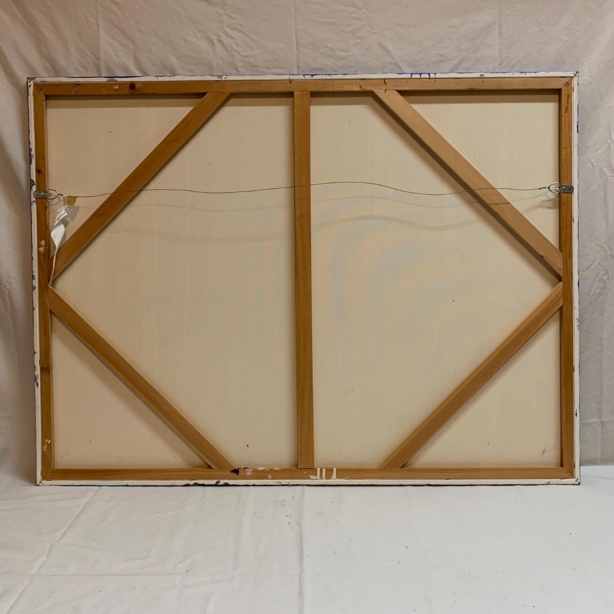 Original painting on canvas by Eileen Ross title ‘Dying of the Light’. Painting is signed by the artist and information attached says it is mixed mediums. Canvas has wooden supports on the back and a wire to hang it horizontally. Canvas measures 48” x 36”. It is 0.75” thick.