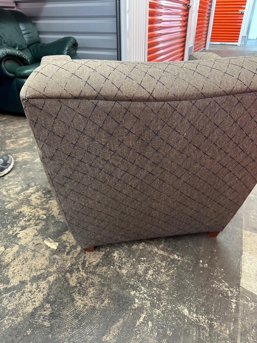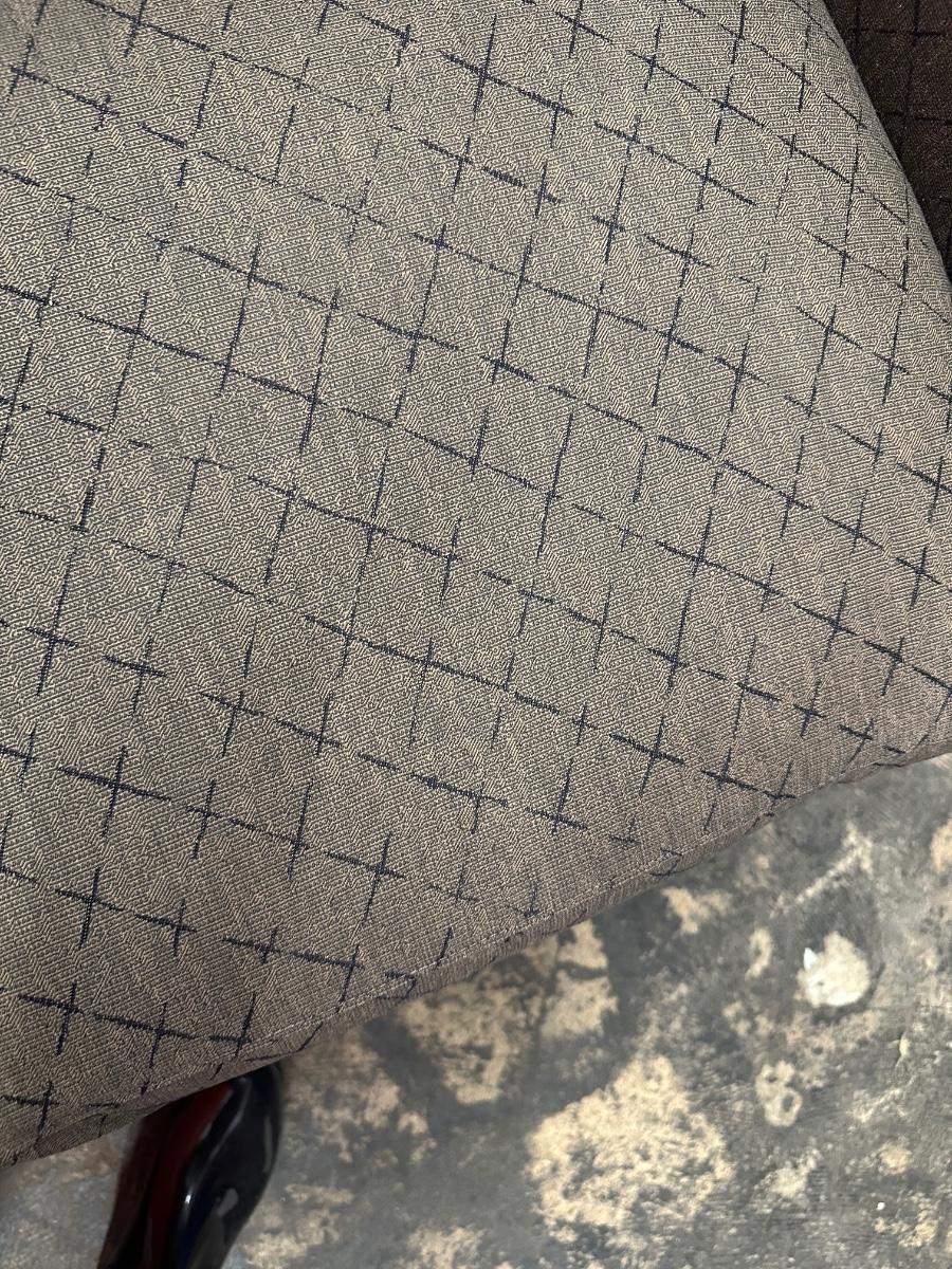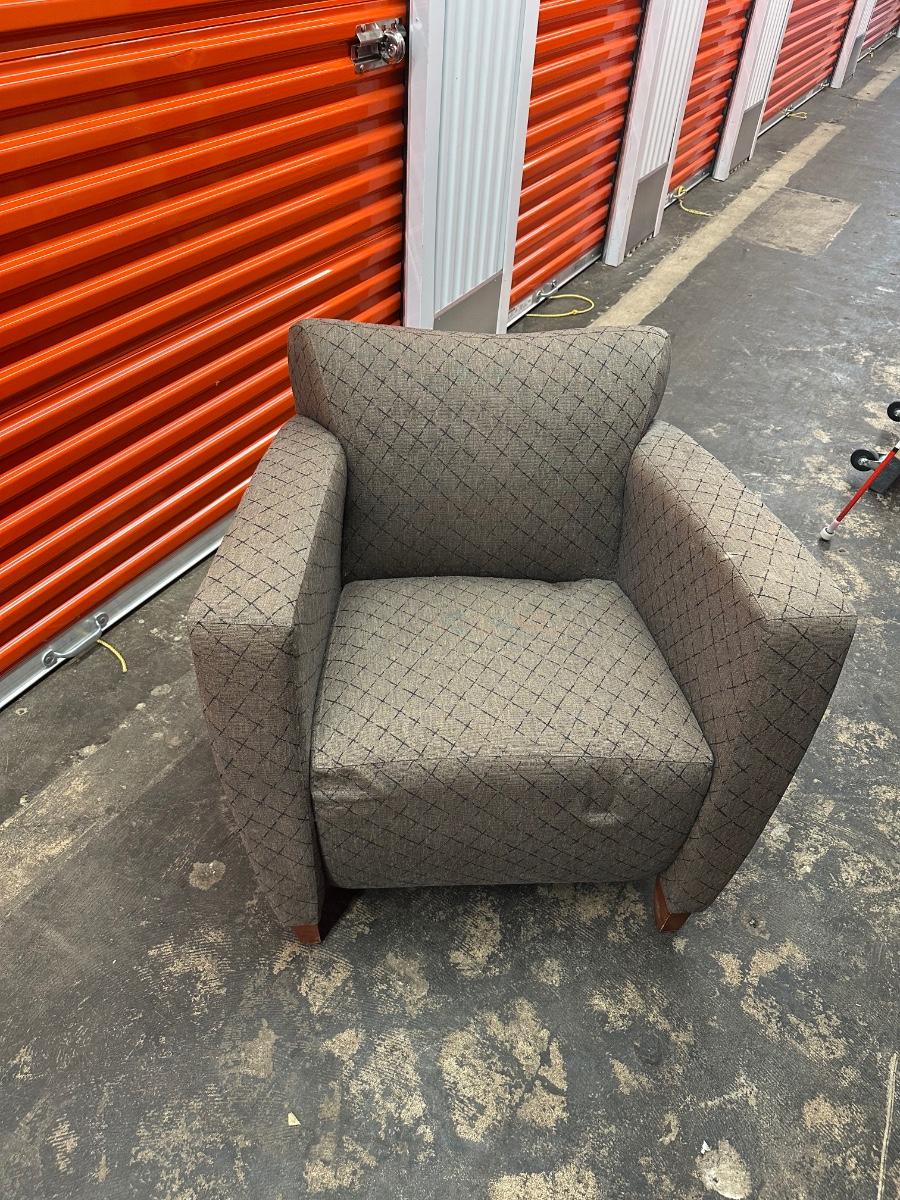 This is an upholstered accent chair with a geometric pattern. Chair has some indents in the cushion that should return to normal after some time.