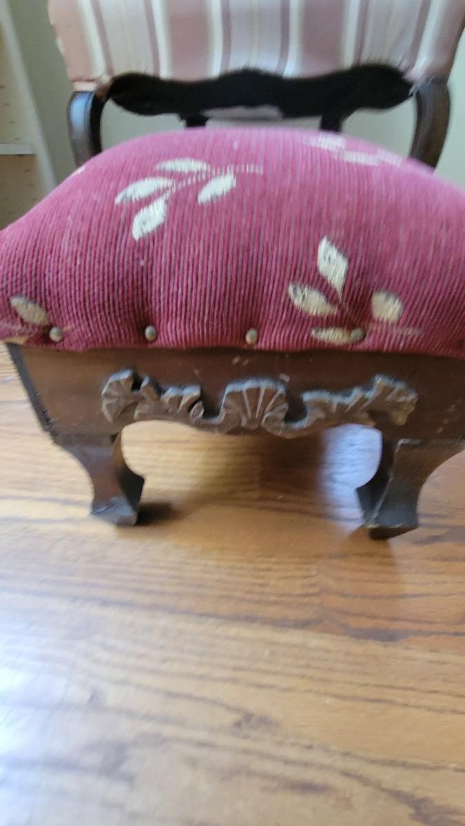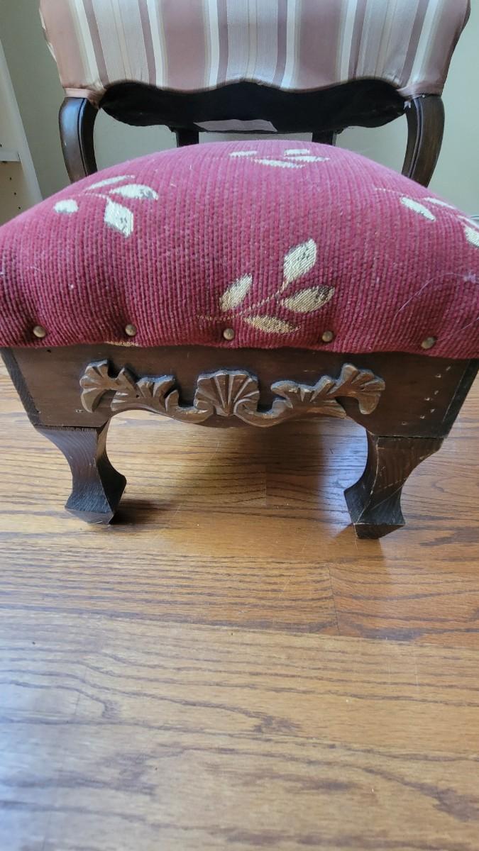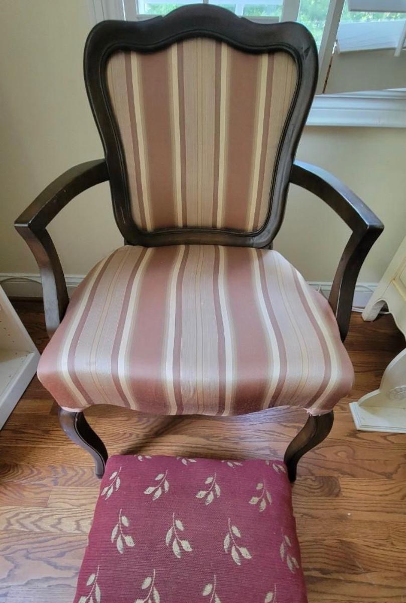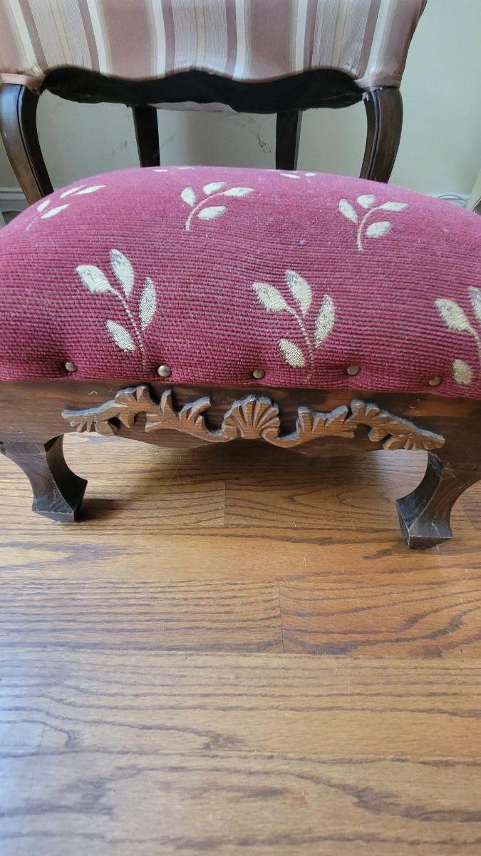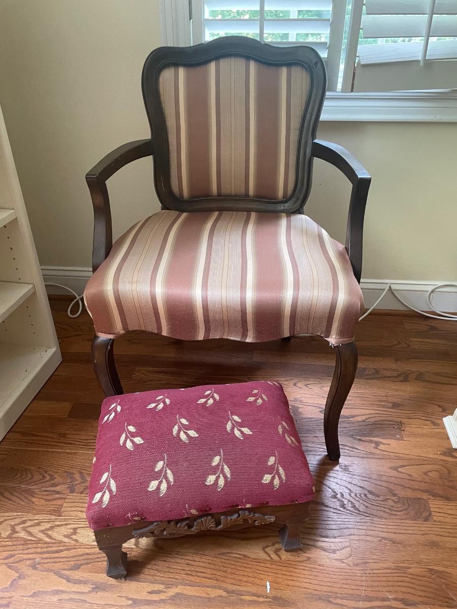 Wooden chair with satin like upholstery and some minor blemishes and scratches on wood. See pictures. Measures approximately 24" x 24" x 35". Seat height is approximately 19 5" Small wooden footstool with a woven fabric and wood details. Some minor blemishes on wooden legs. Local pickup only