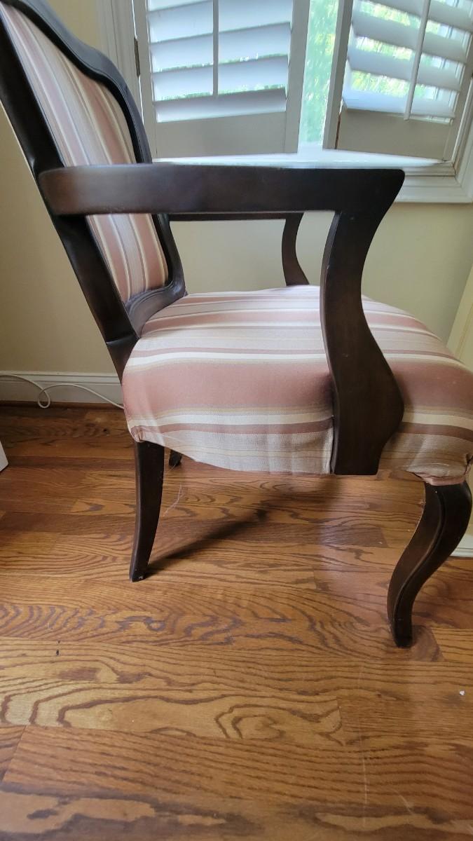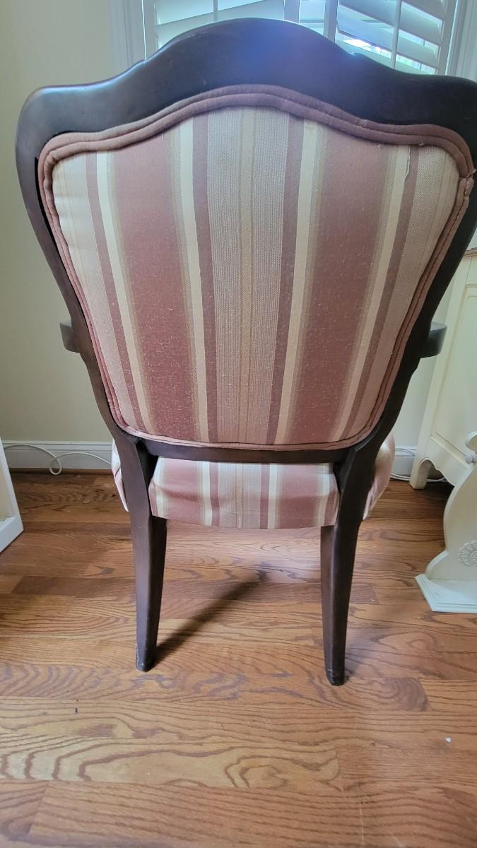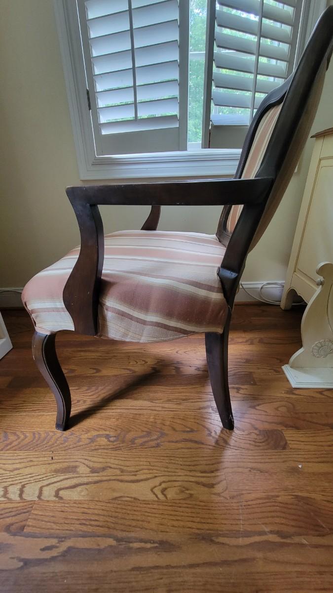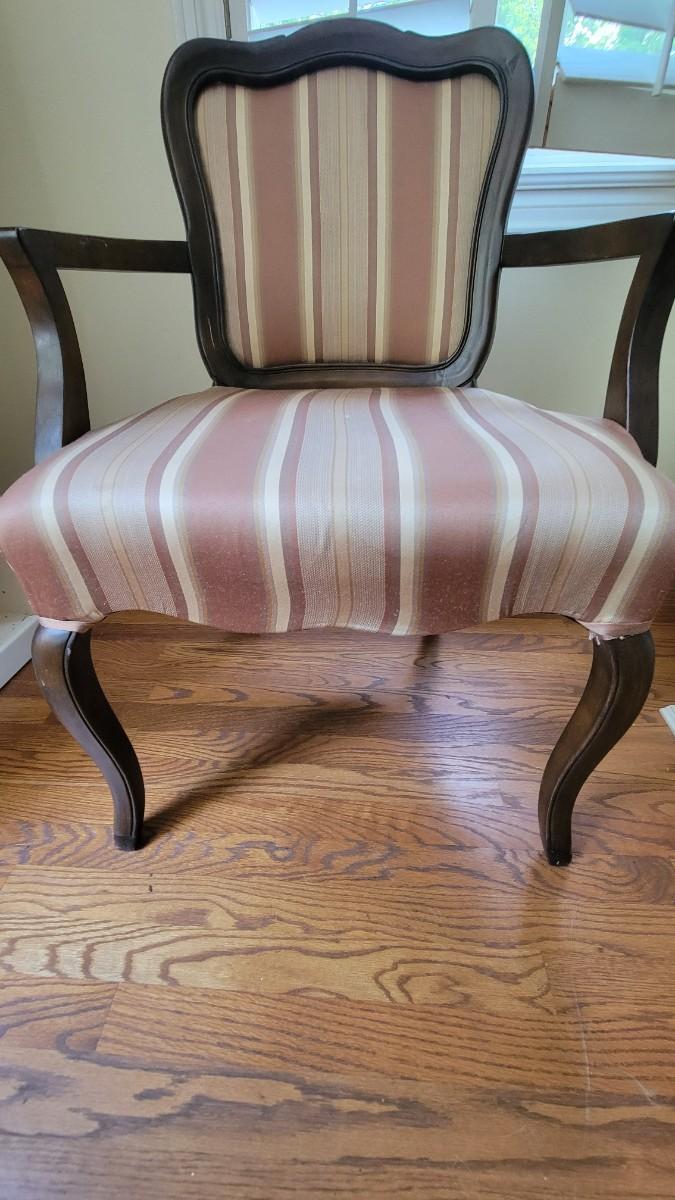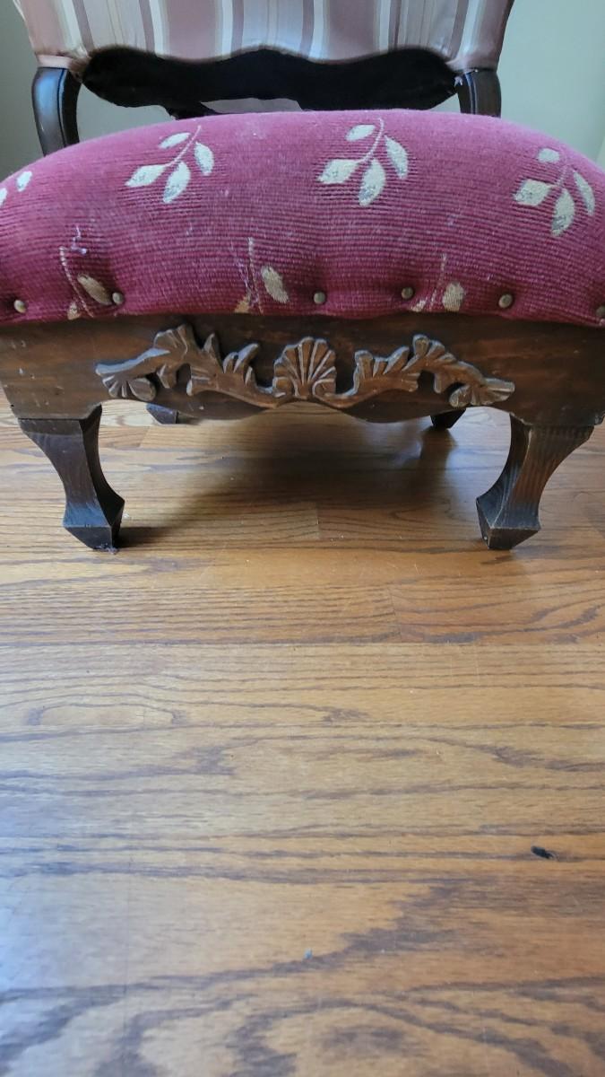 Wooden chair with satin like upholstery and some minor blemishes and scratches on wood. See pictures. Measures approximately 24" x 24" x 35". Seat height is approximately 19 5" Small wooden footstool with a woven fabric and wood details. Some minor blemishes on wooden legs. Local pickup only