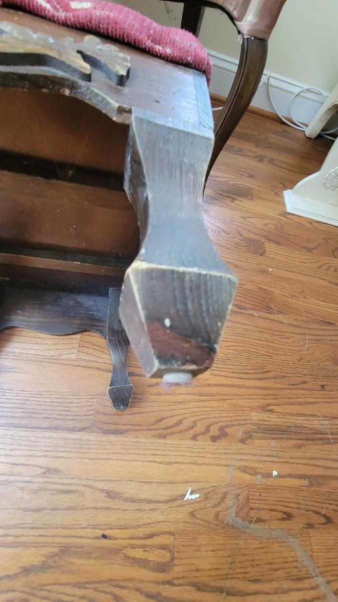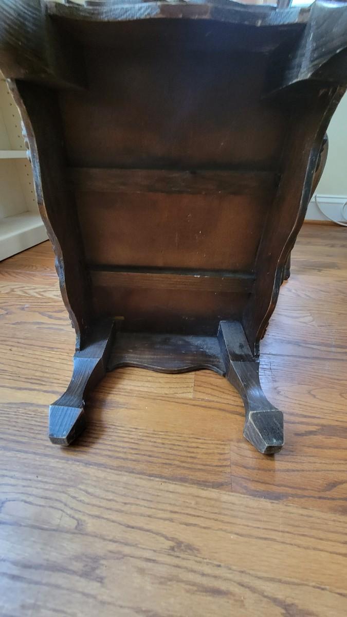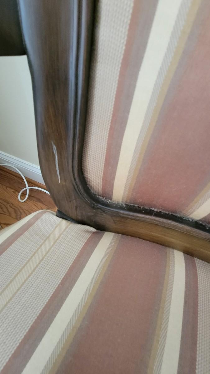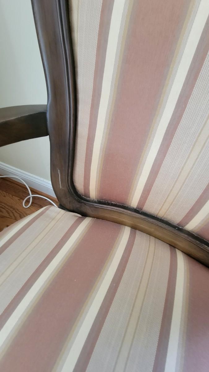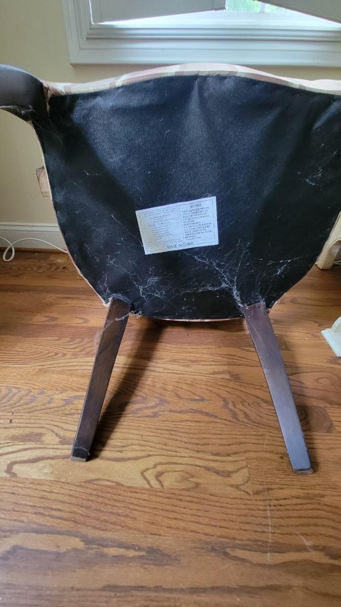 Wooden chair with satin like upholstery and some minor blemishes and scratches on wood. See pictures. Measures approximately 24" x 24" x 35". Seat height is approximately 19 5" Small wooden footstool with a woven fabric and wood details. Some minor blemishes on wooden legs. Local pickup only