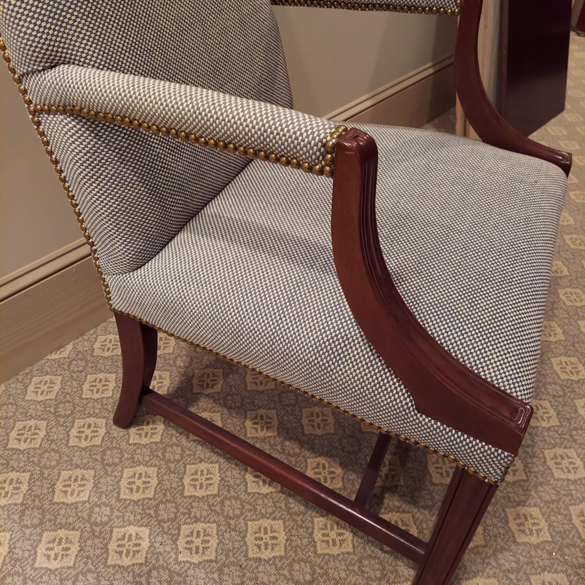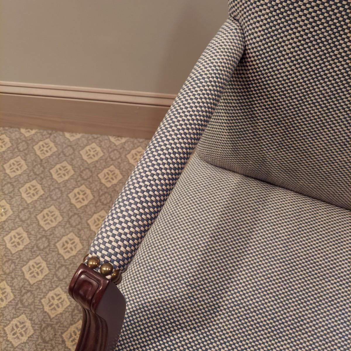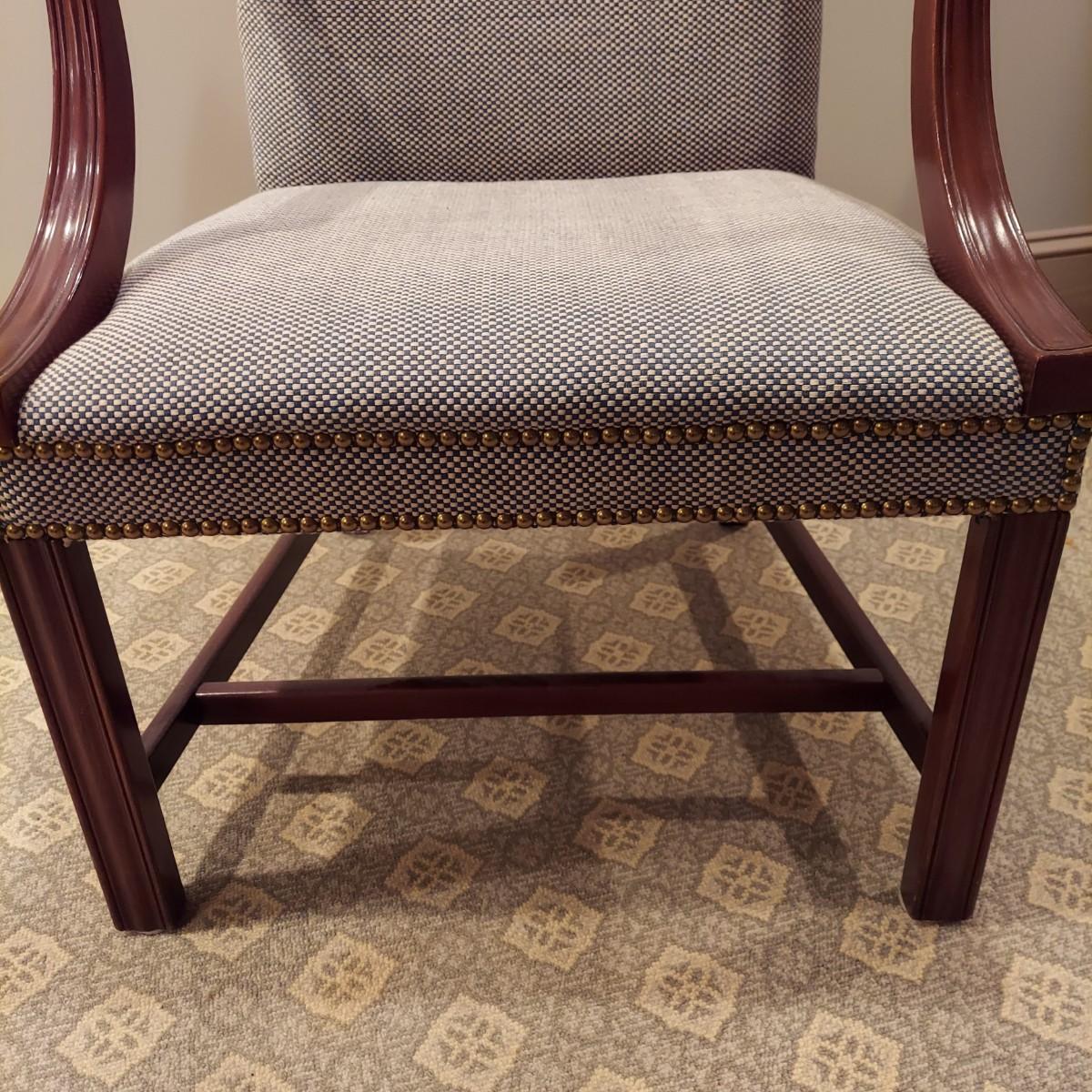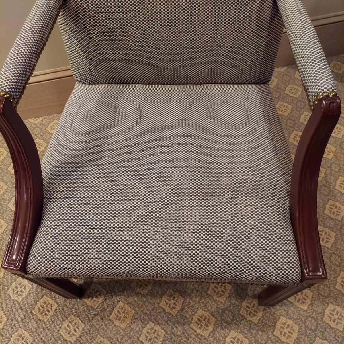 Upholstered armchair with Chippendale elements. Solid wood frame in a darker finish. Covered in a khaki and slate blue woven check fabric with a brass colored nailhead trim. Measures 25" x 25" x 38"H with an 18"H seat height. Local Pickup Only.