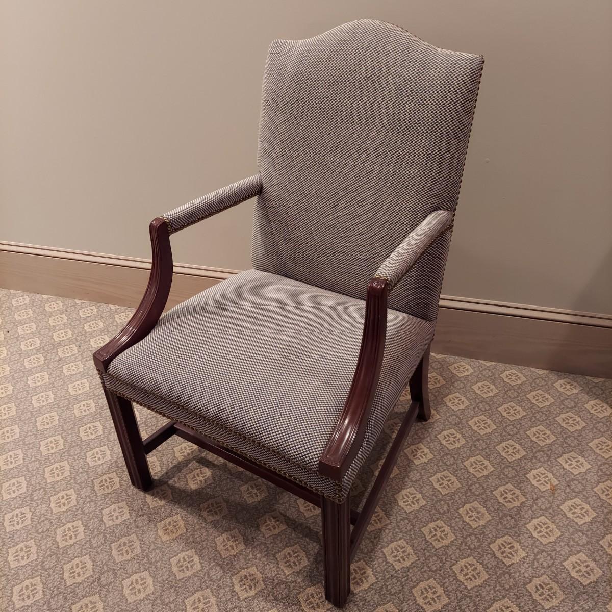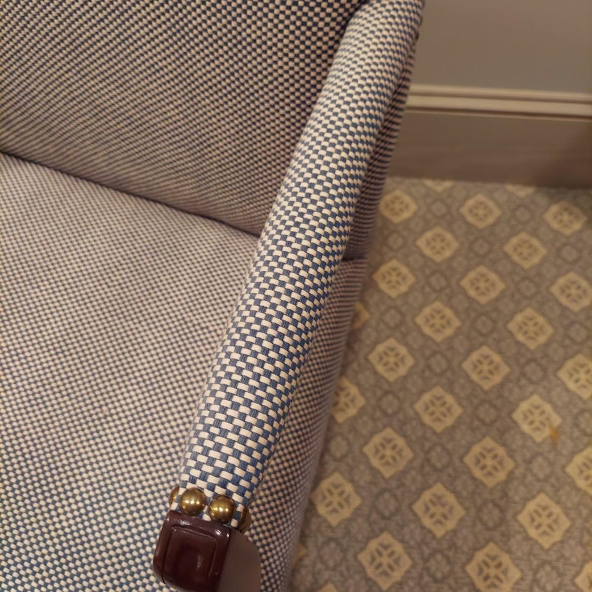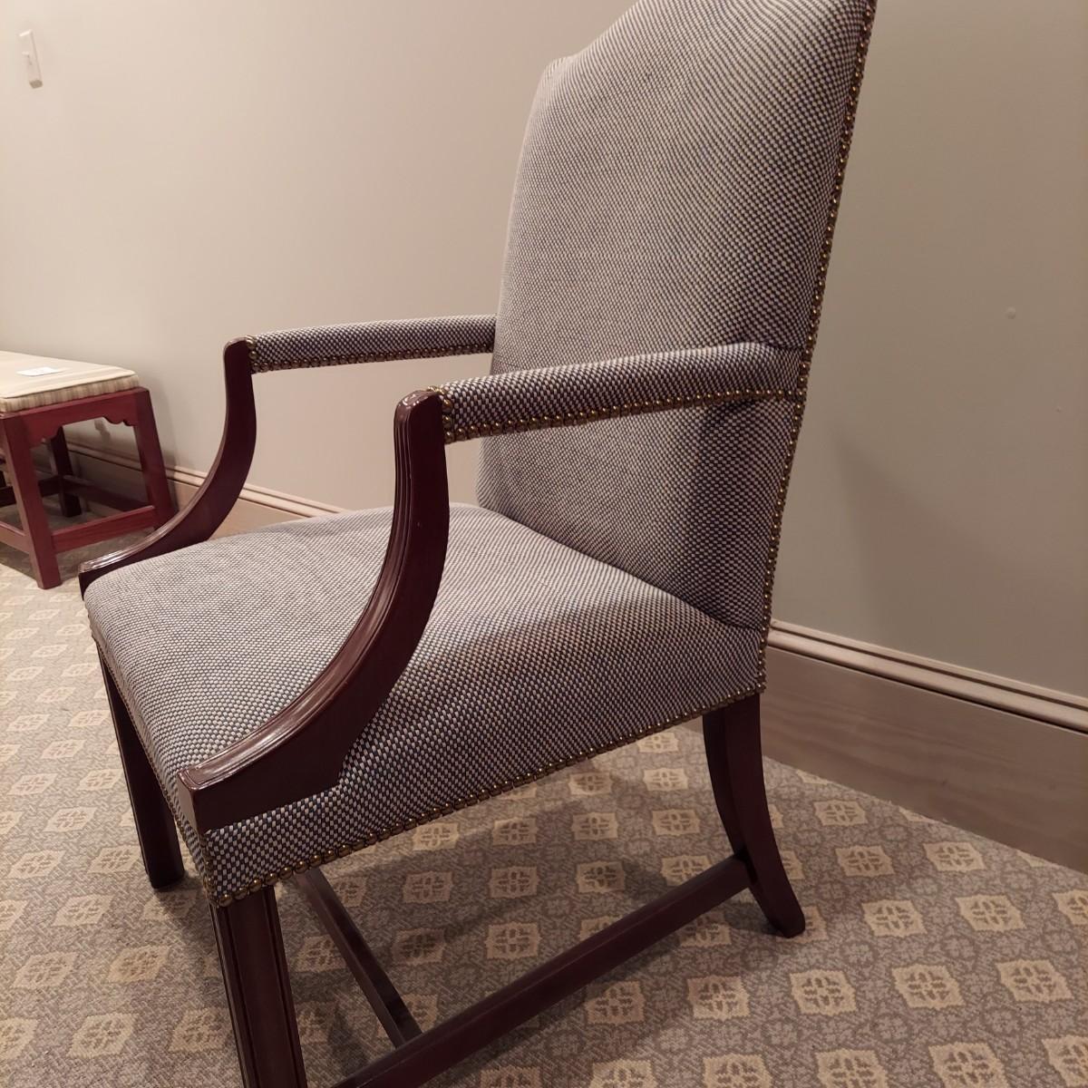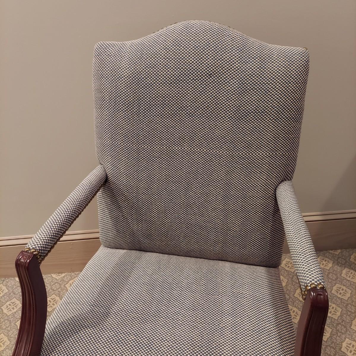 Upholstered armchair with Chippendale elements. Solid wood frame in a darker finish. Covered in a khaki and slate blue woven check fabric with a brass colored nailhead trim. Measures 25" x 25" x 38"H with an 18"H seat height. Local Pickup Only.