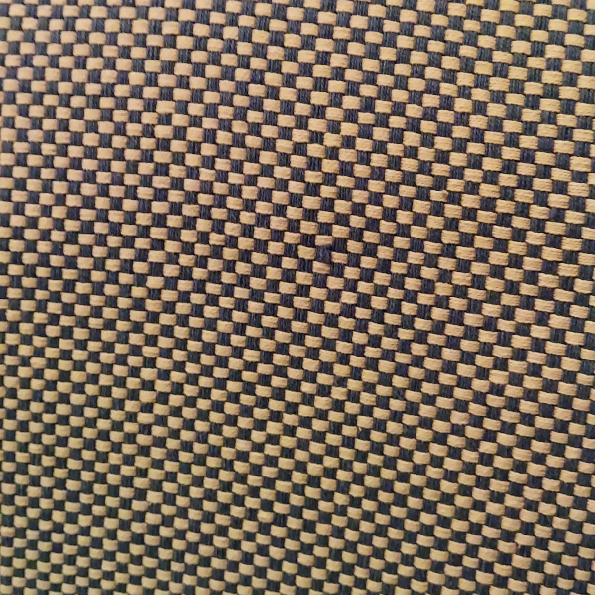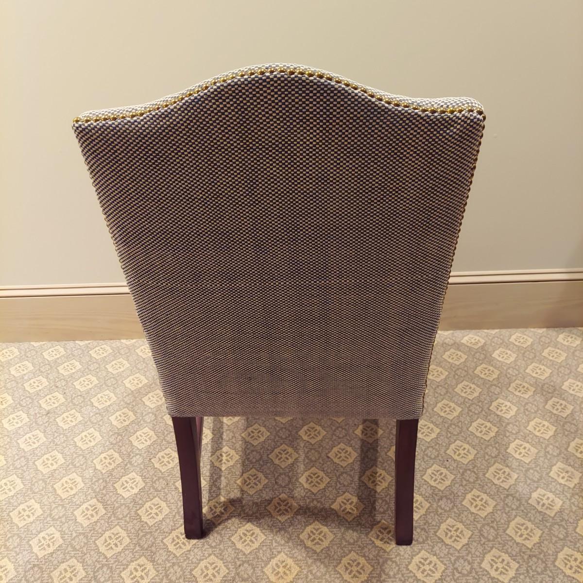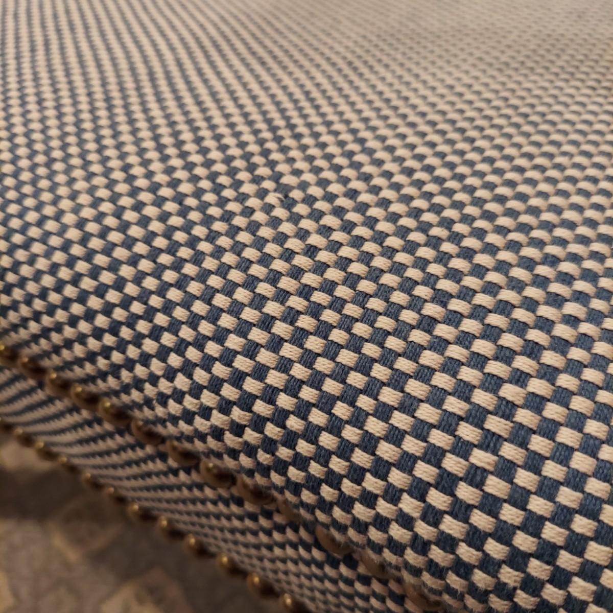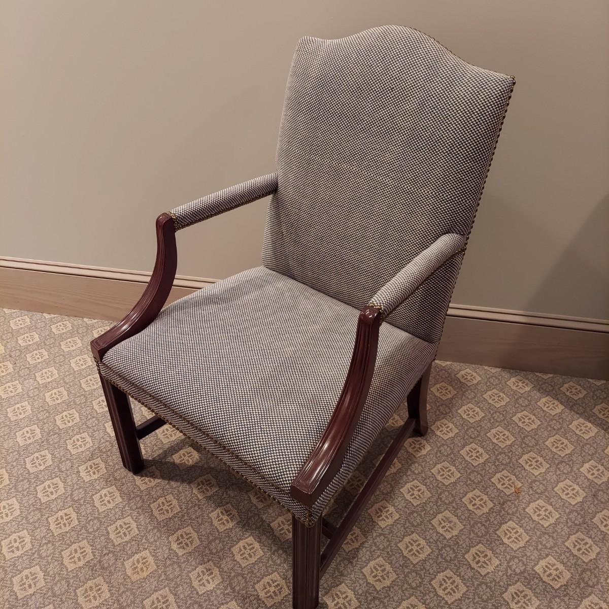 Upholstered armchair with Chippendale elements. Solid wood frame in a darker finish. Covered in a khaki and slate blue woven check fabric with a brass colored nailhead trim. Measures 25" x 25" x 38"H with an 18"H seat height. Local Pickup Only.