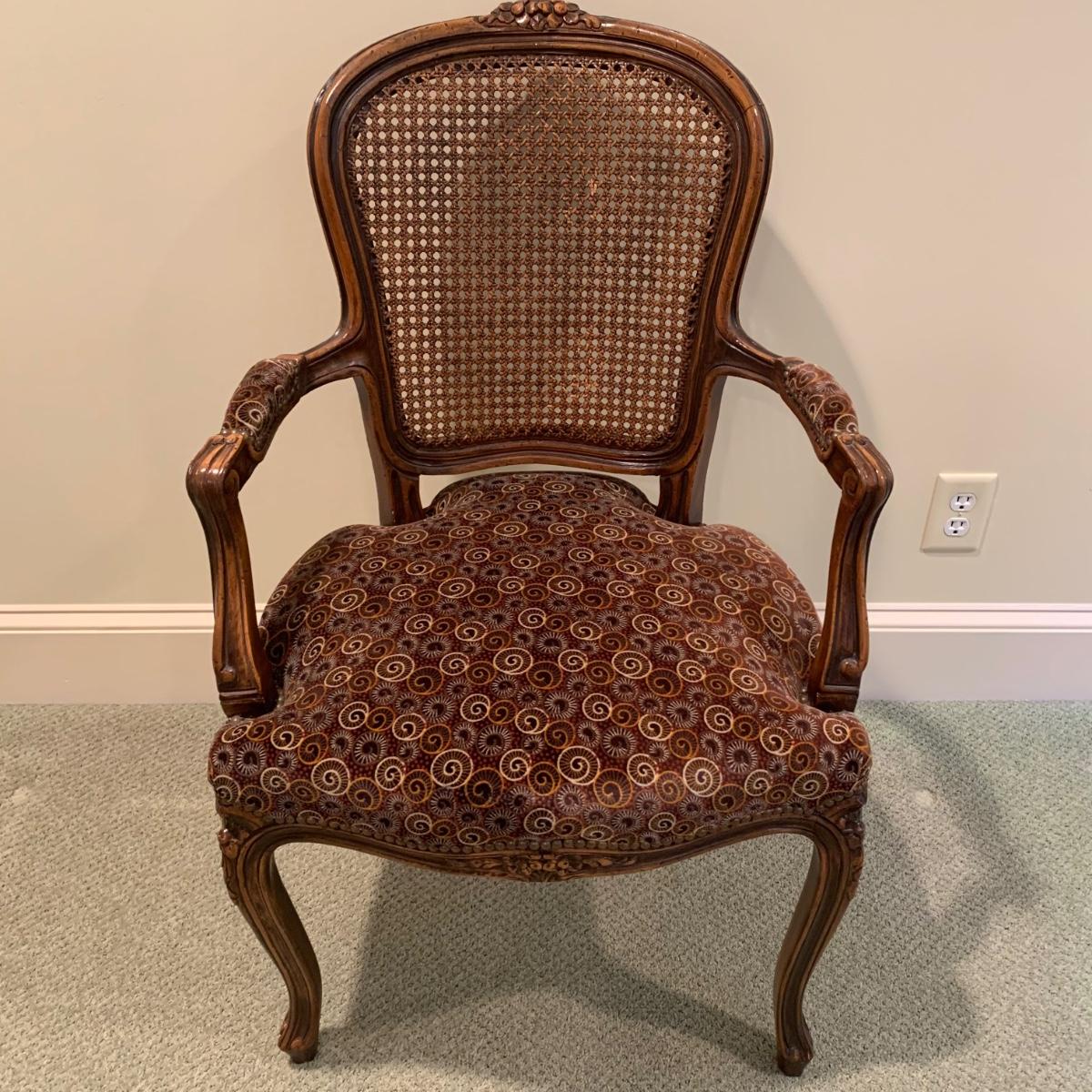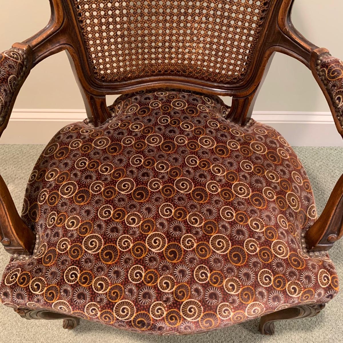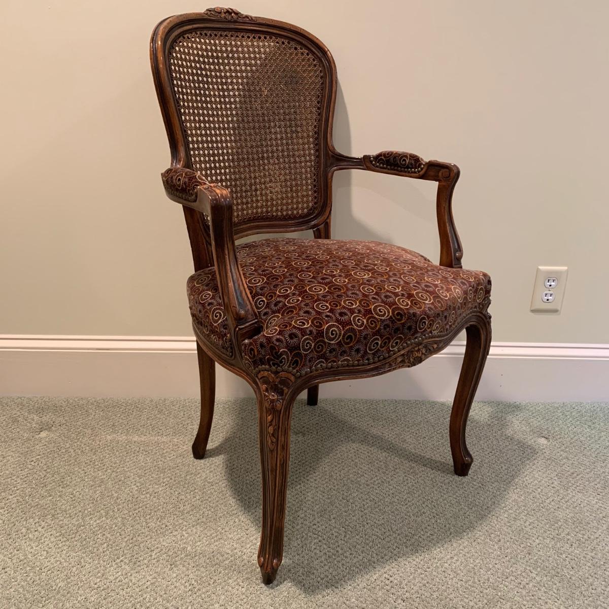 Upholstered cane-back chair. Chair features a wood frame, cane backing, and velvet upholstered cushion. Chair measures approximately, 23” x 19” x 37”H with a seat height of 20”. Please see photos for more details. Local pickup only.