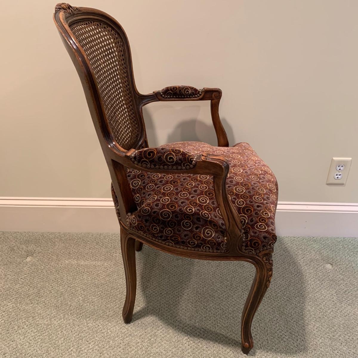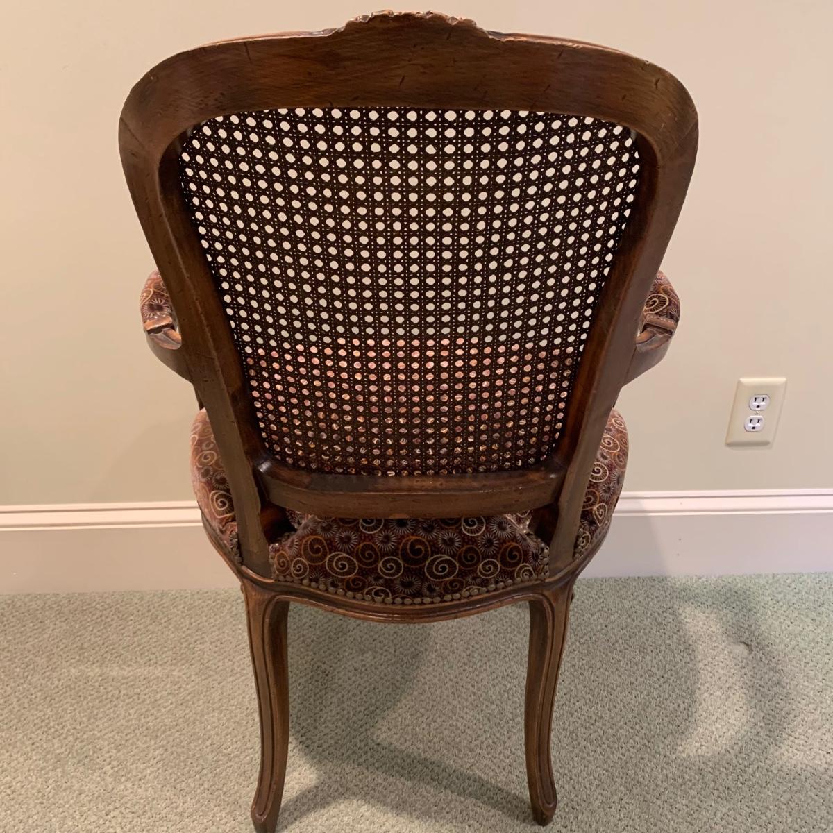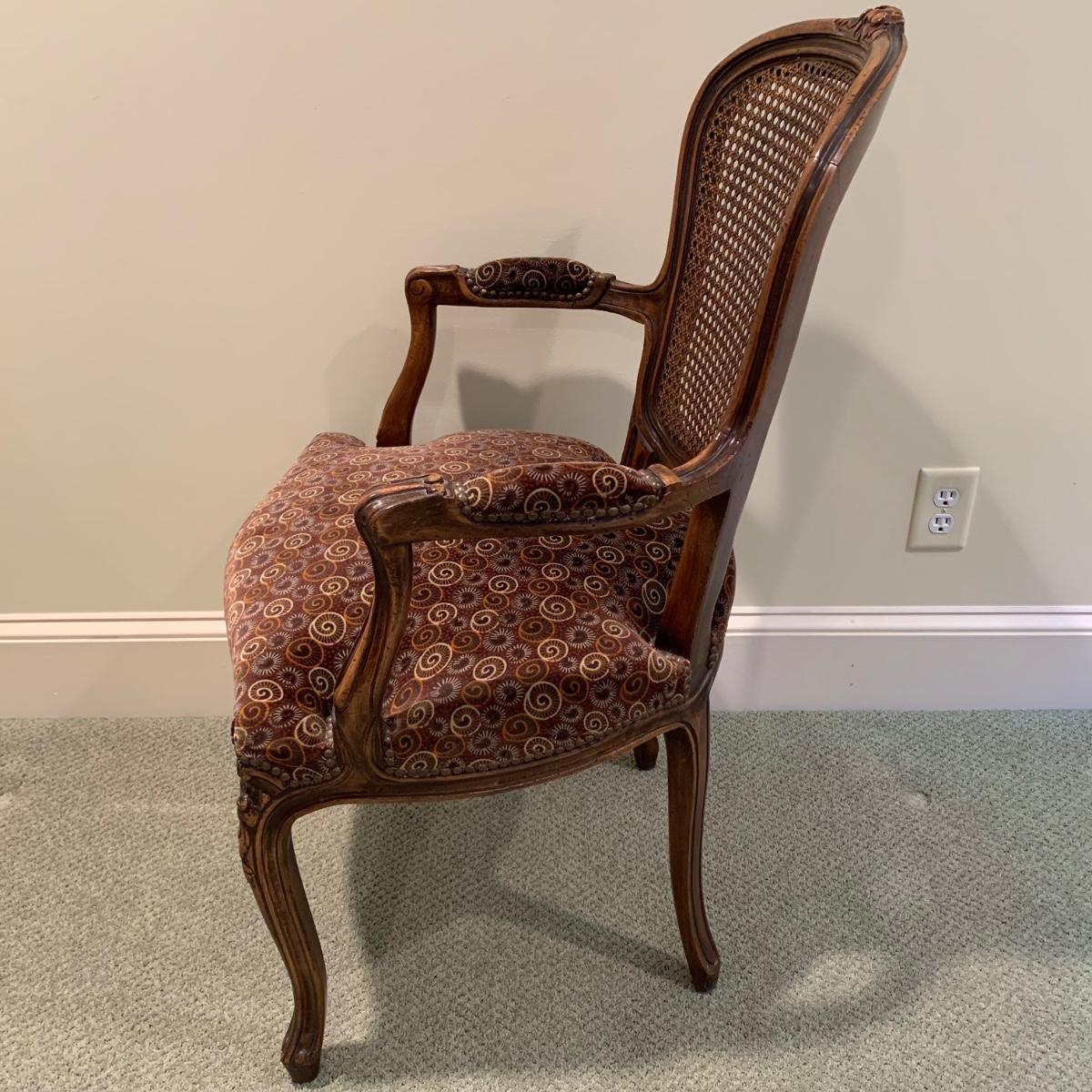 Upholstered cane-back chair. Chair features a wood frame, cane backing, and velvet upholstered cushion. Chair measures approximately, 23” x 19” x 37”H with a seat height of 20”. Please see photos for more details. Local pickup only.