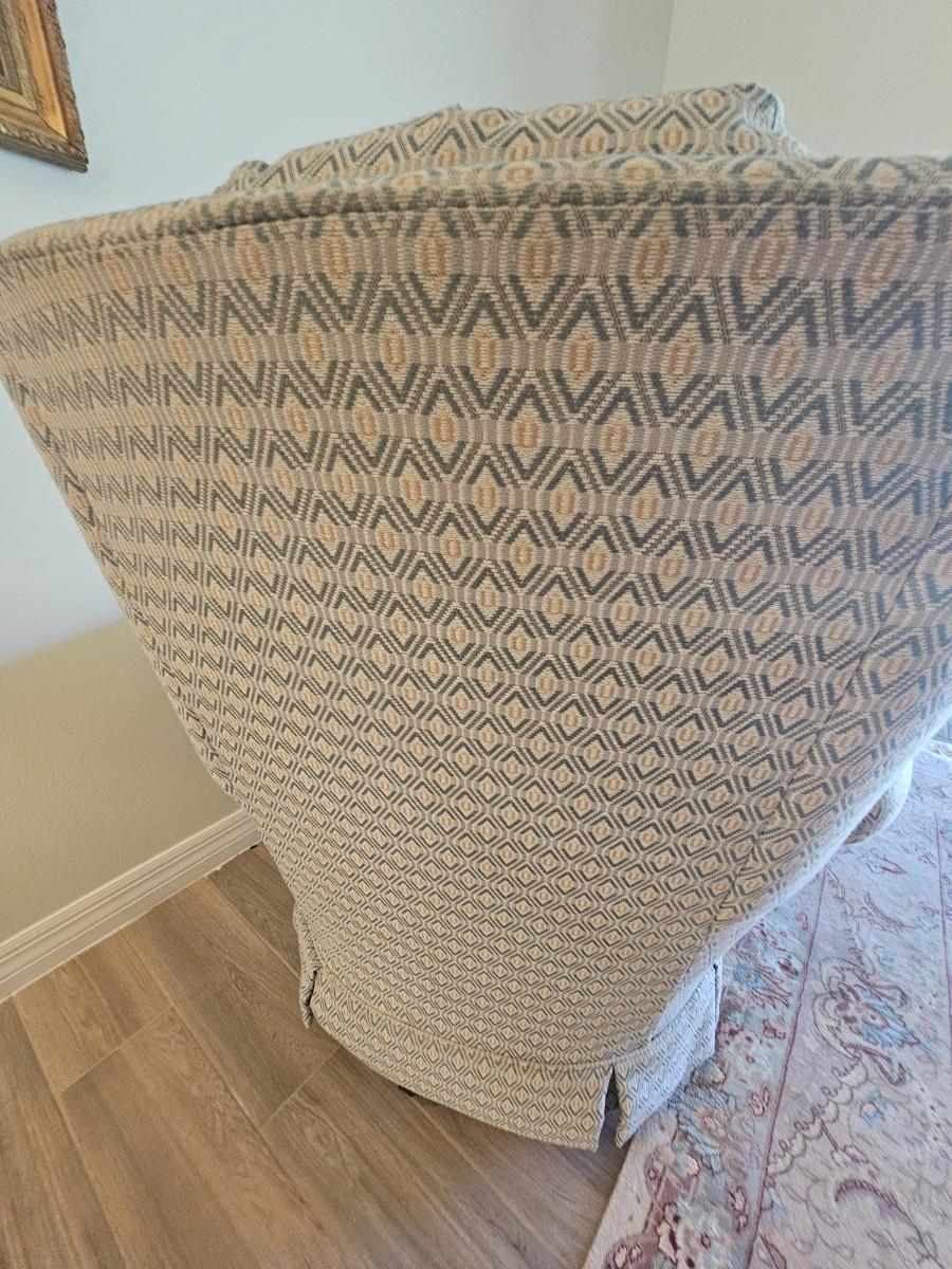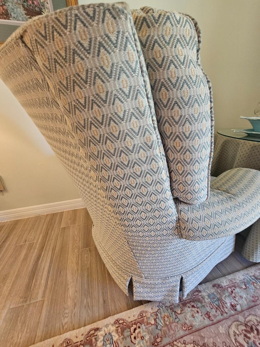 Fabric chair with teal and tan colors. tufted buttons, swivel chair.