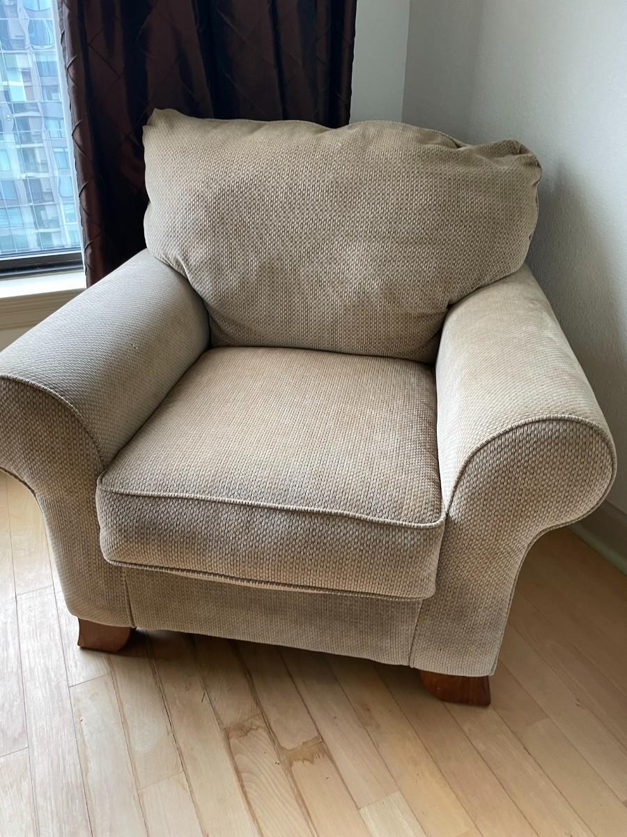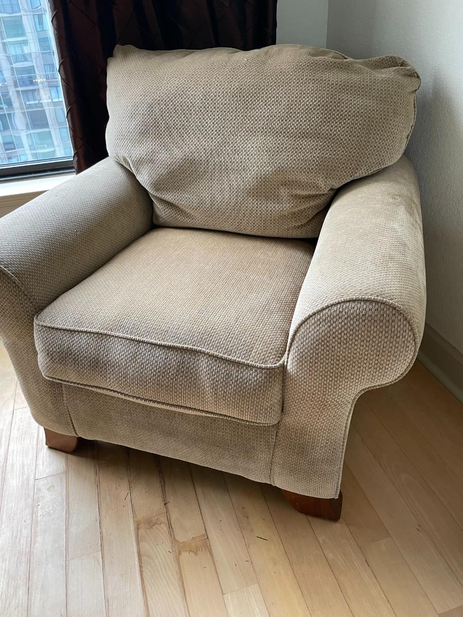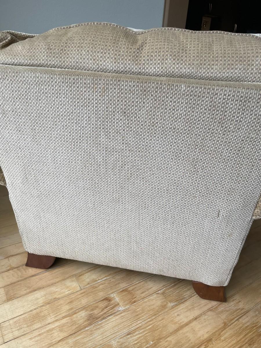 Tan Upholstered cahir with Wood style legs 36" L x 42. Buyer - This item will require a Moving Pro with a Certificate of Insurance for pickup. At the end of the sale, large item buyers will receive the contact person's information so you can coordinate the your pickup time.