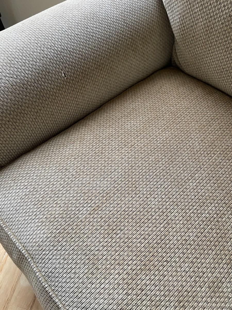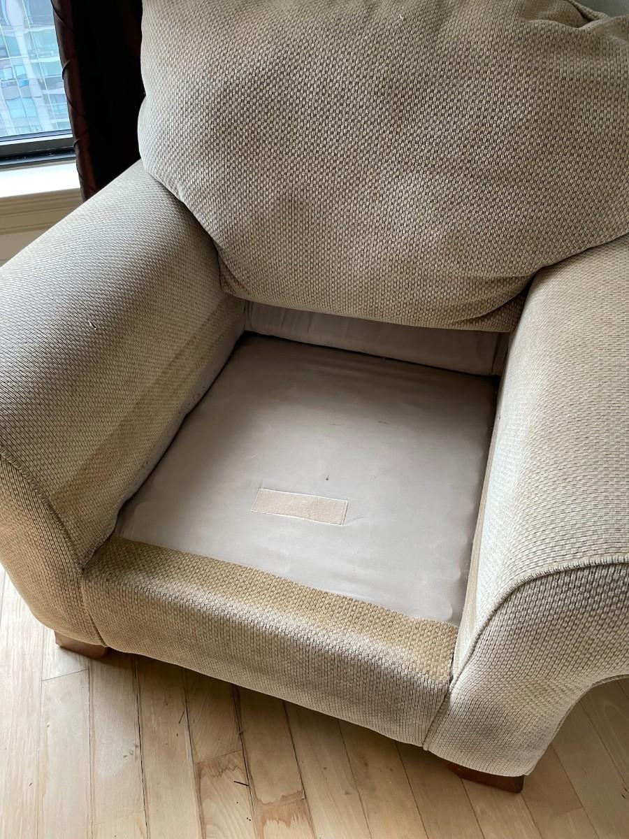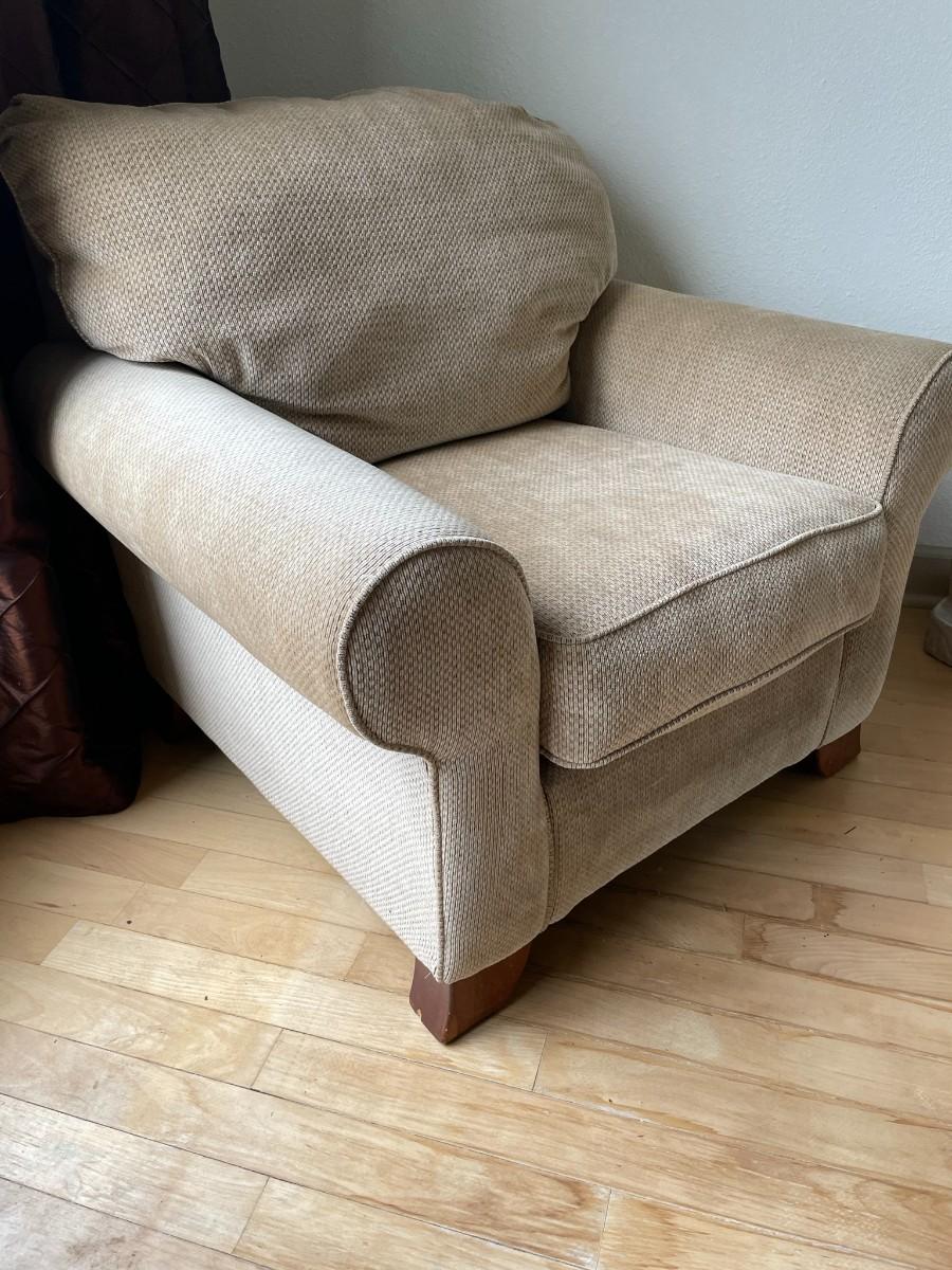 Tan Upholstered cahir with Wood style legs 36" L x 42. Buyer - This item will require a Moving Pro with a Certificate of Insurance for pickup. At the end of the sale, large item buyers will receive the contact person's information so you can coordinate the your pickup time.