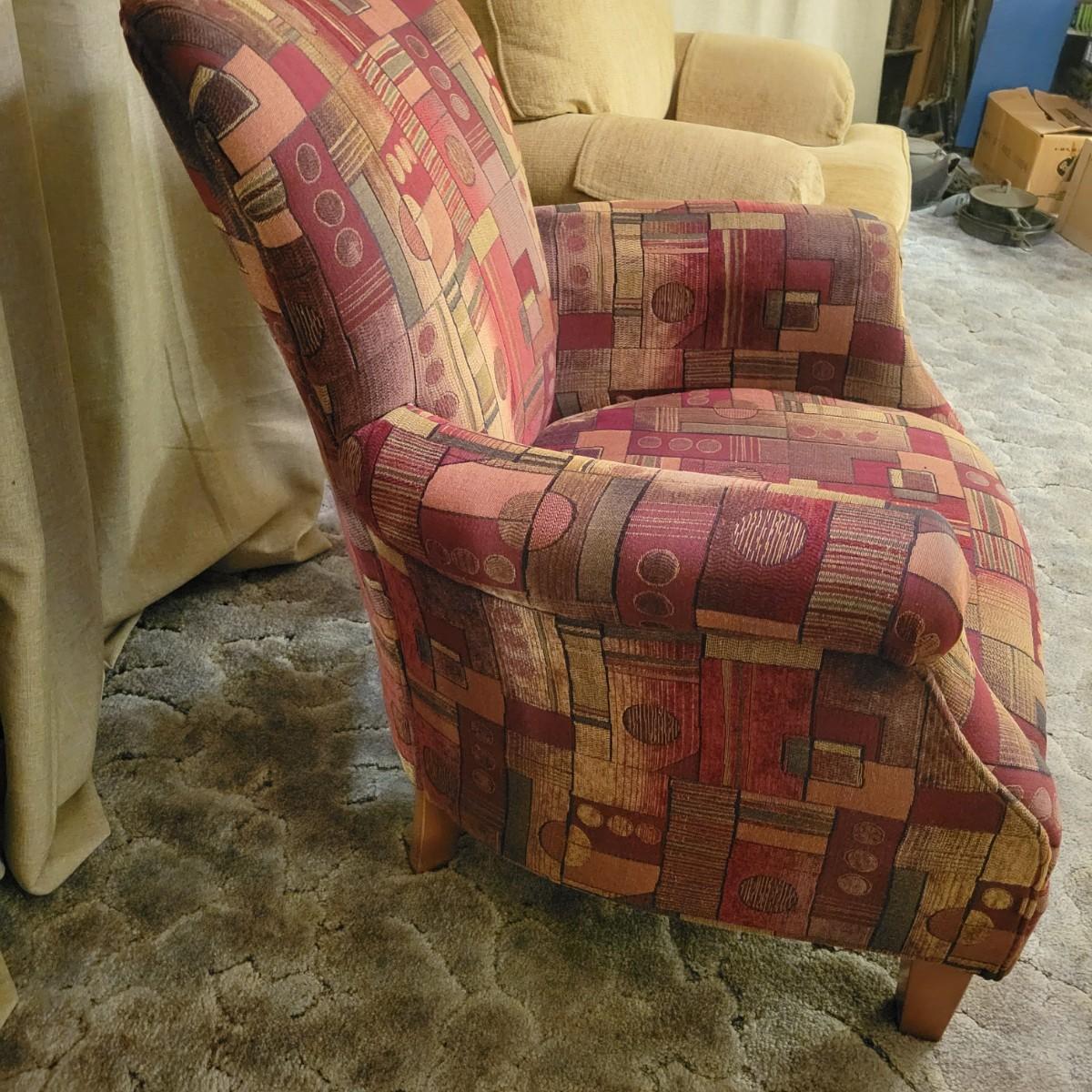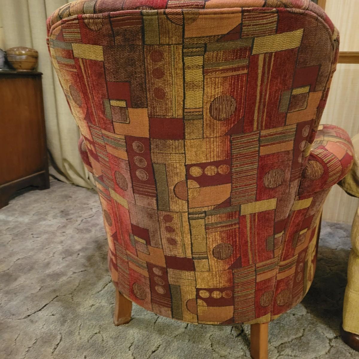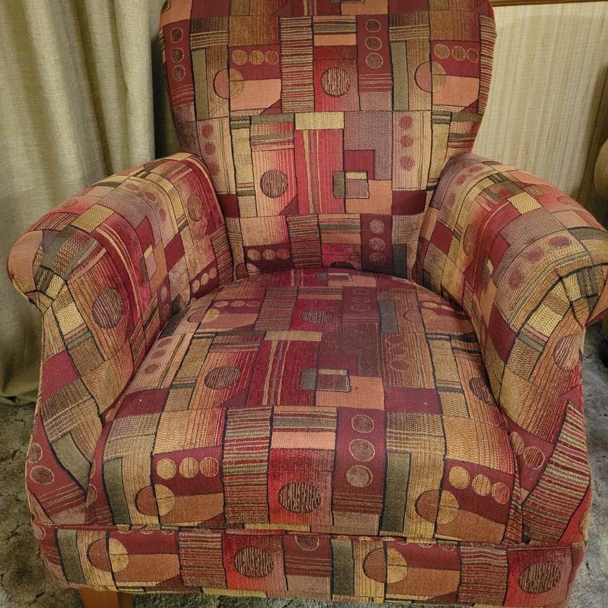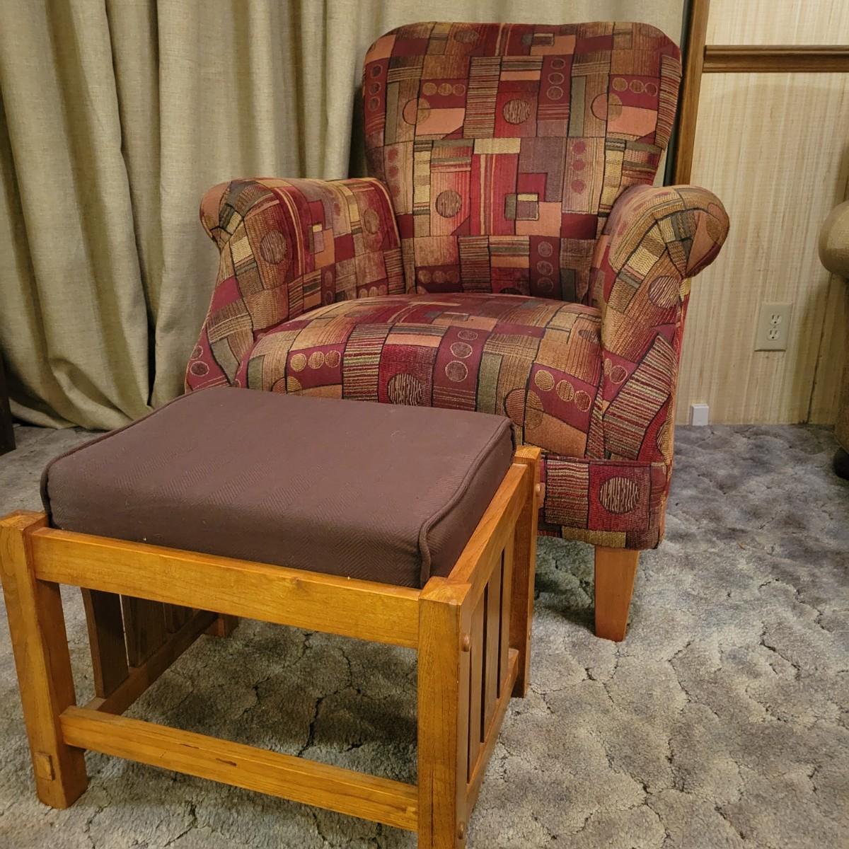 A upholstered chair with an art deco motif and a wooden footstool with an upholstered cushion. Both are in good condition with no notable damage. The chairs cushions are not detachable and the chair has wooden legs. Footstool is mostly wooden with a brown upholstered cushion that is in good condition with one chip on the wood, see pictures. Chair measures approximately 32" x 36" x 36" and the seat height is approximately 17.5" Local pickup only