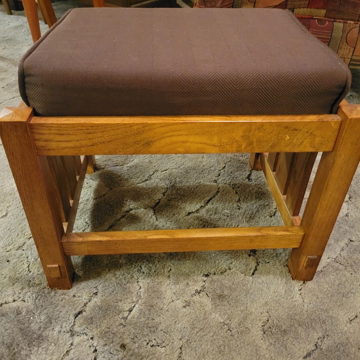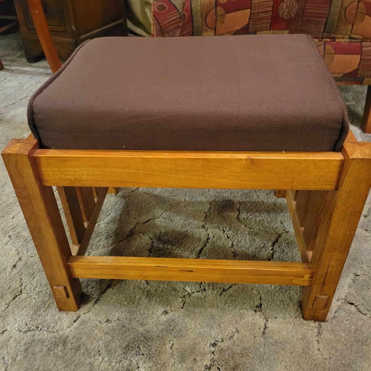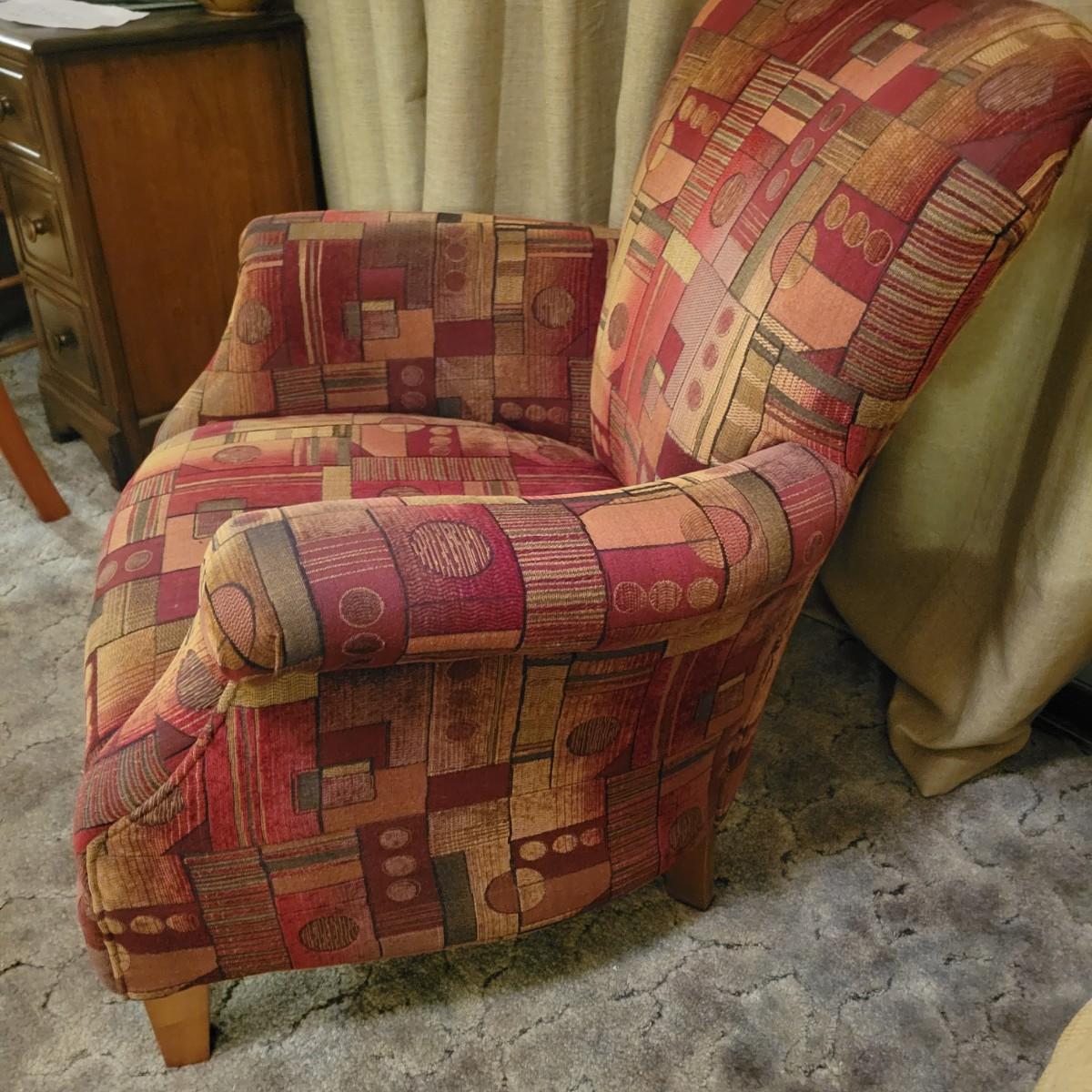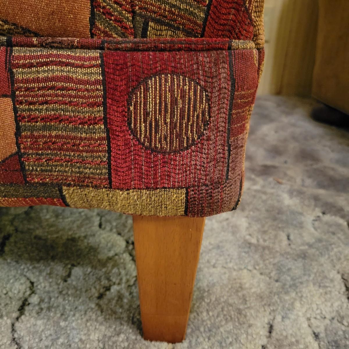A upholstered chair with an art deco motif and a wooden footstool with an upholstered cushion. Both are in good condition with no notable damage. The chairs cushions are not detachable and the chair has wooden legs. Footstool is mostly wooden with a brown upholstered cushion that is in good condition with one chip on the wood, see pictures. Chair measures approximately 32" x 36" x 36" and the seat height is approximately 17.5" Local pickup only