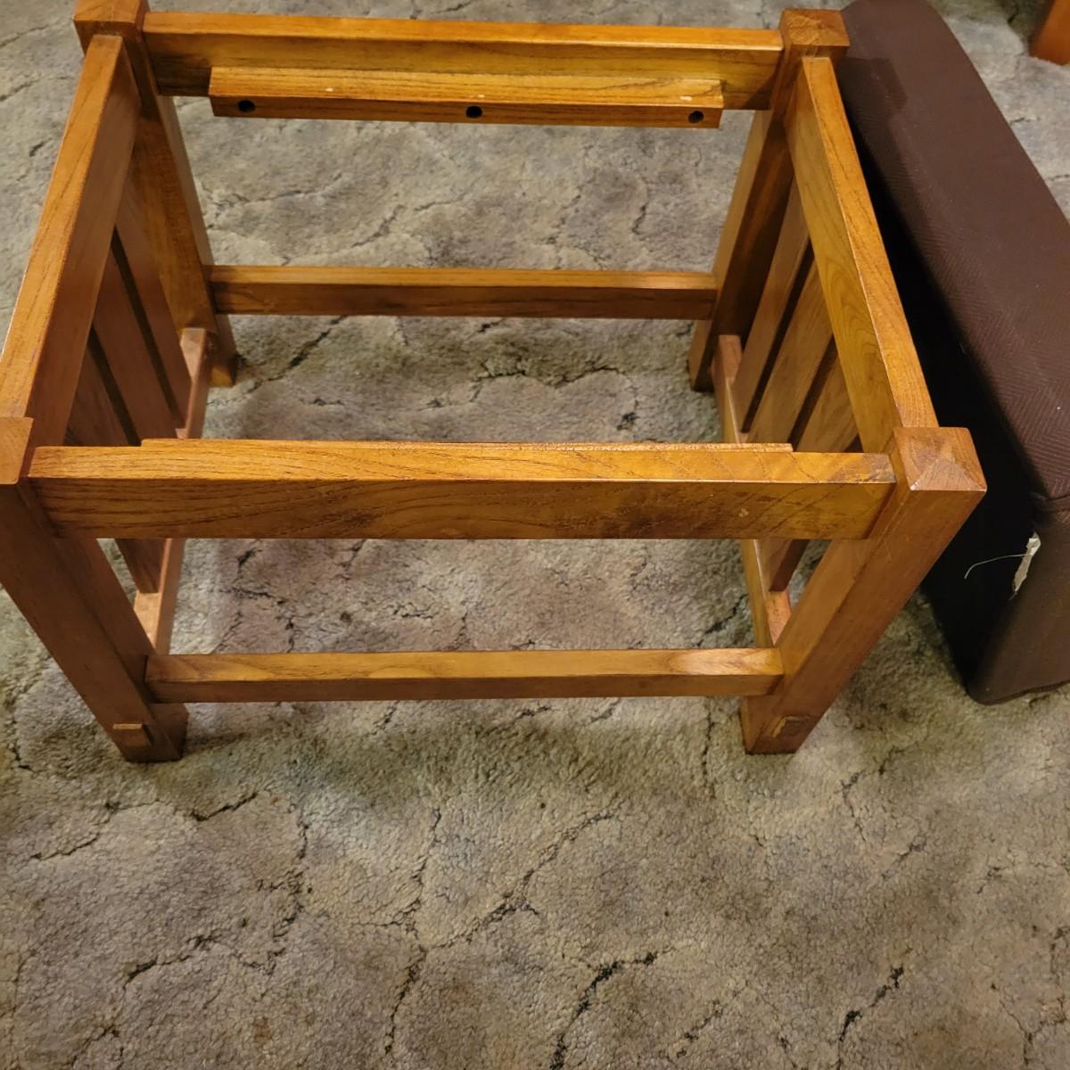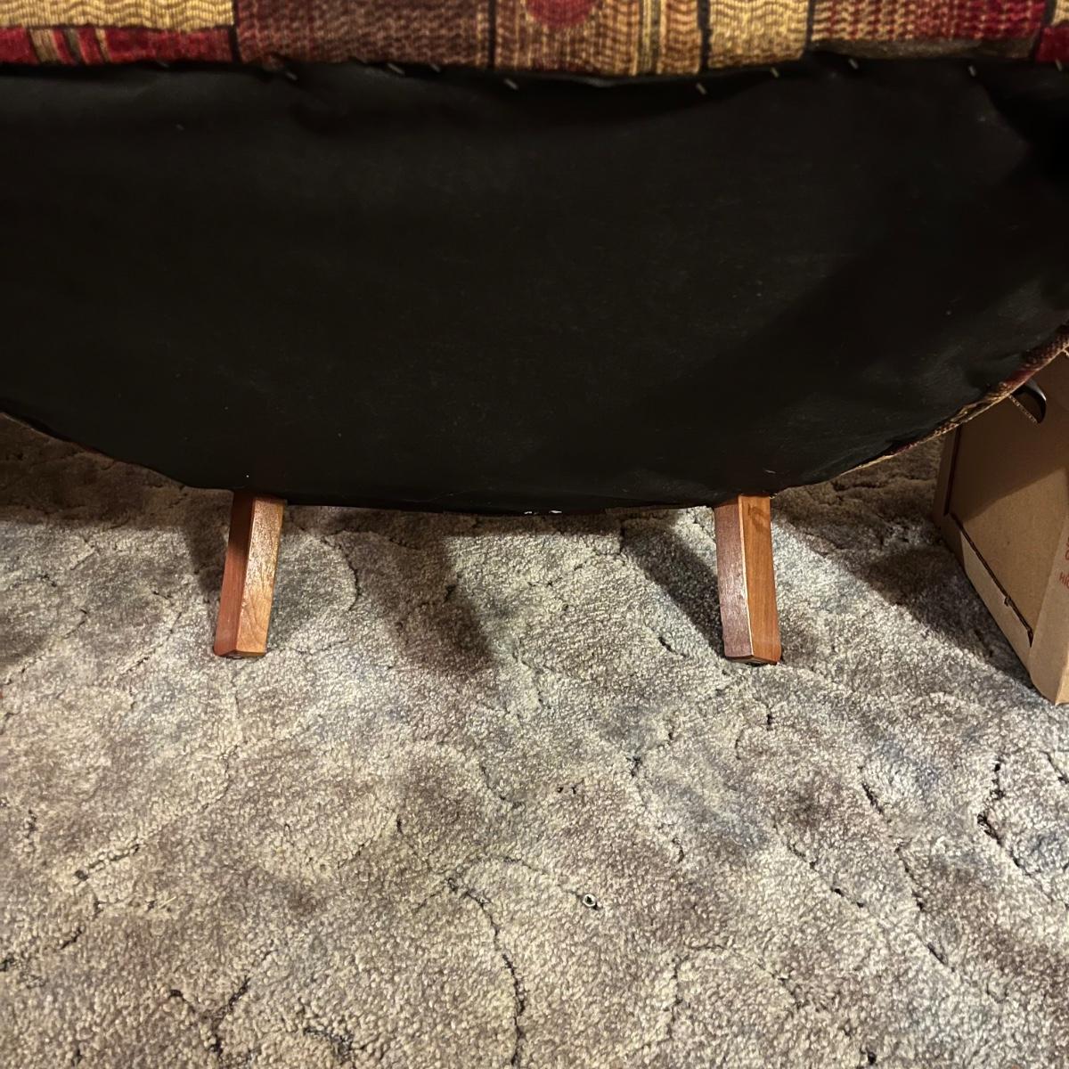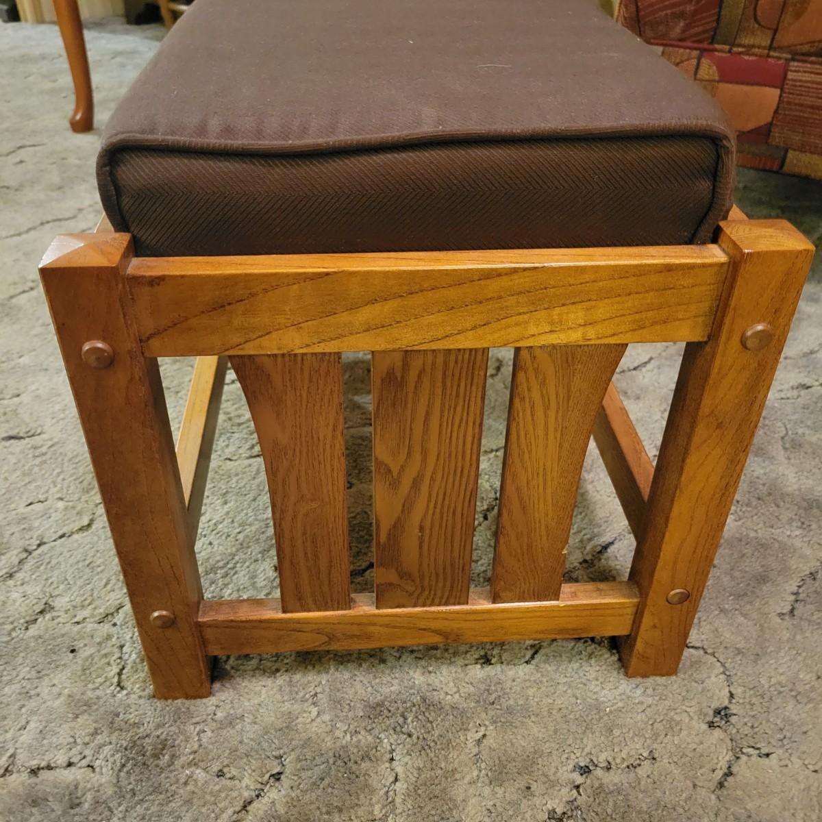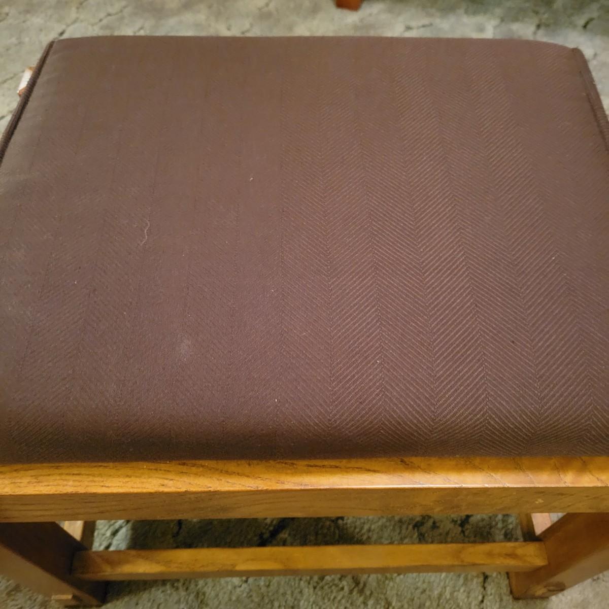 A upholstered chair with an art deco motif and a wooden footstool with an upholstered cushion. Both are in good condition with no notable damage. The chairs cushions are not detachable and the chair has wooden legs. Footstool is mostly wooden with a brown upholstered cushion that is in good condition with one chip on the wood, see pictures. Chair measures approximately 32" x 36" x 36" and the seat height is approximately 17.5" Local pickup only