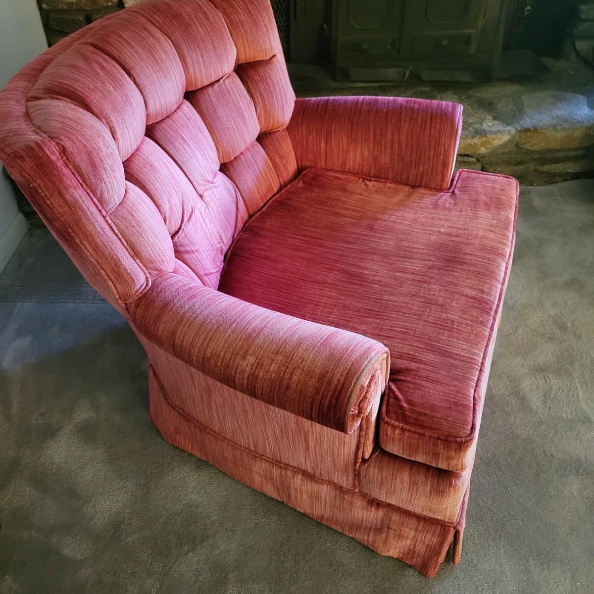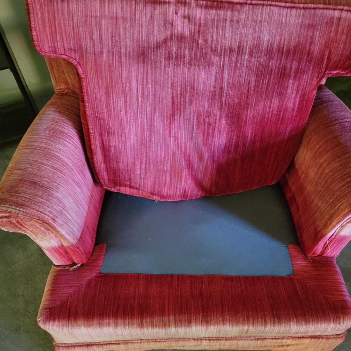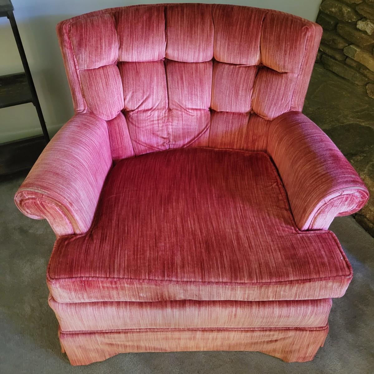 An upholstered chair in good condition, but is a little thread bare on the arms from use and a little faded. See attached pictures for more detail. Chair measures approximately 35" x 32" x 29" with a seat height of 15" Local pickup only