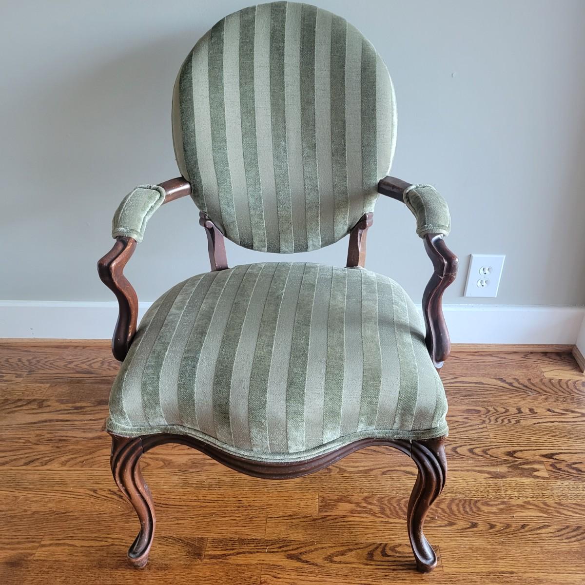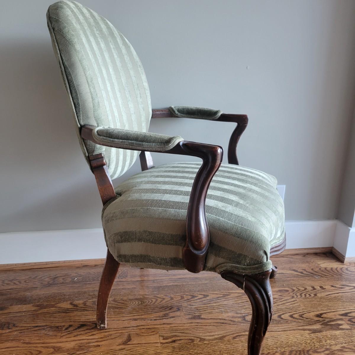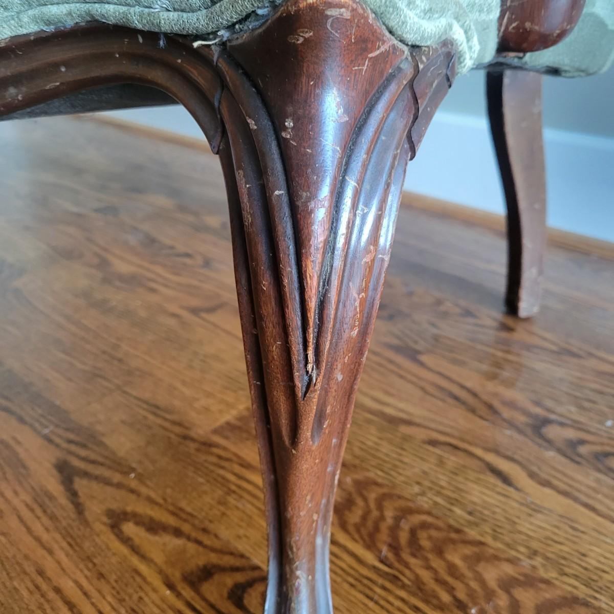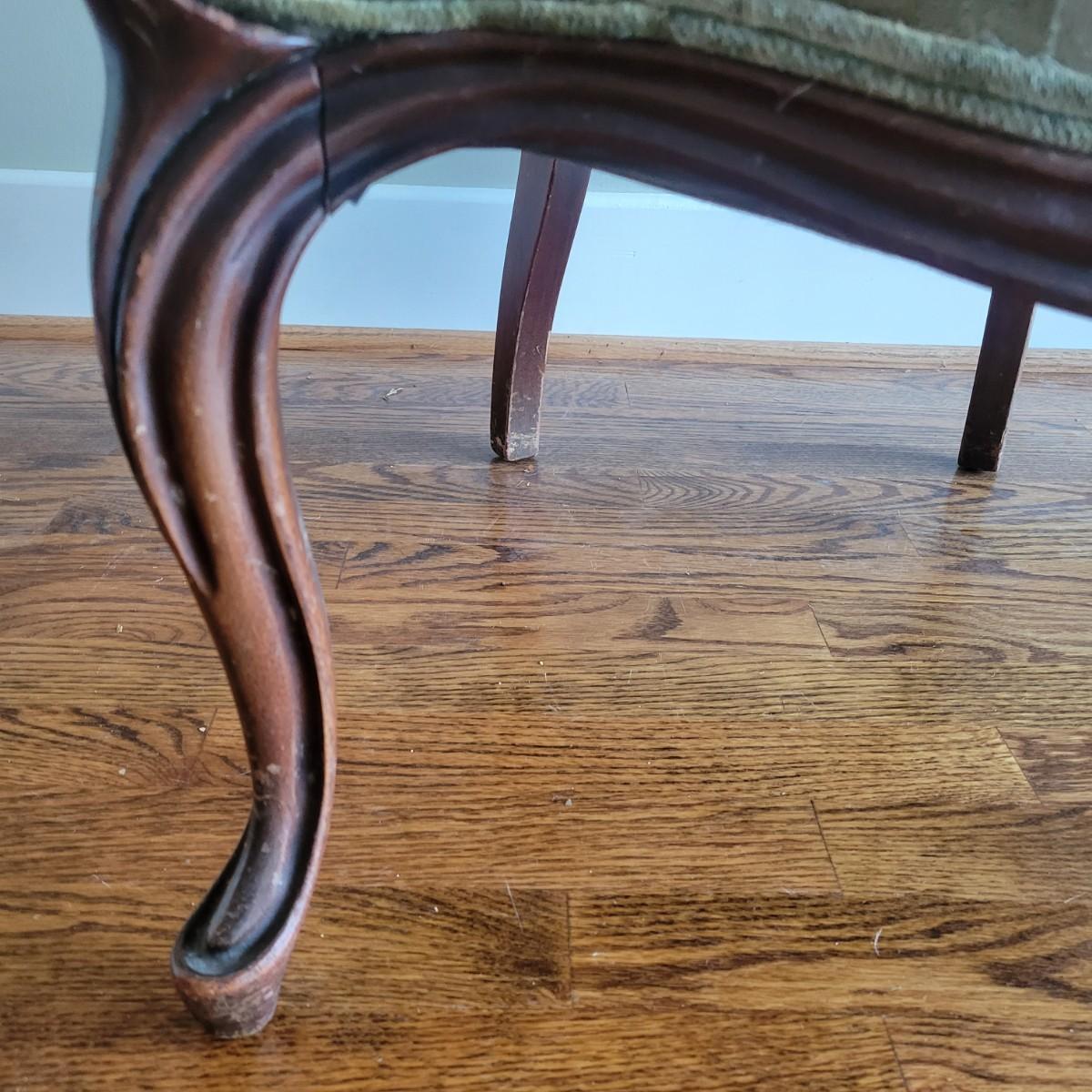 An upholstered chair with a dark wood frame in fair condition with notable scratches and areas where wood joints are gapping. This piece could be restored. Features a green upholstery that has a velour feel with no flaws. Measures approximately 24.5" x 25" x 36" with a seat height of 16.5". Local pickup only