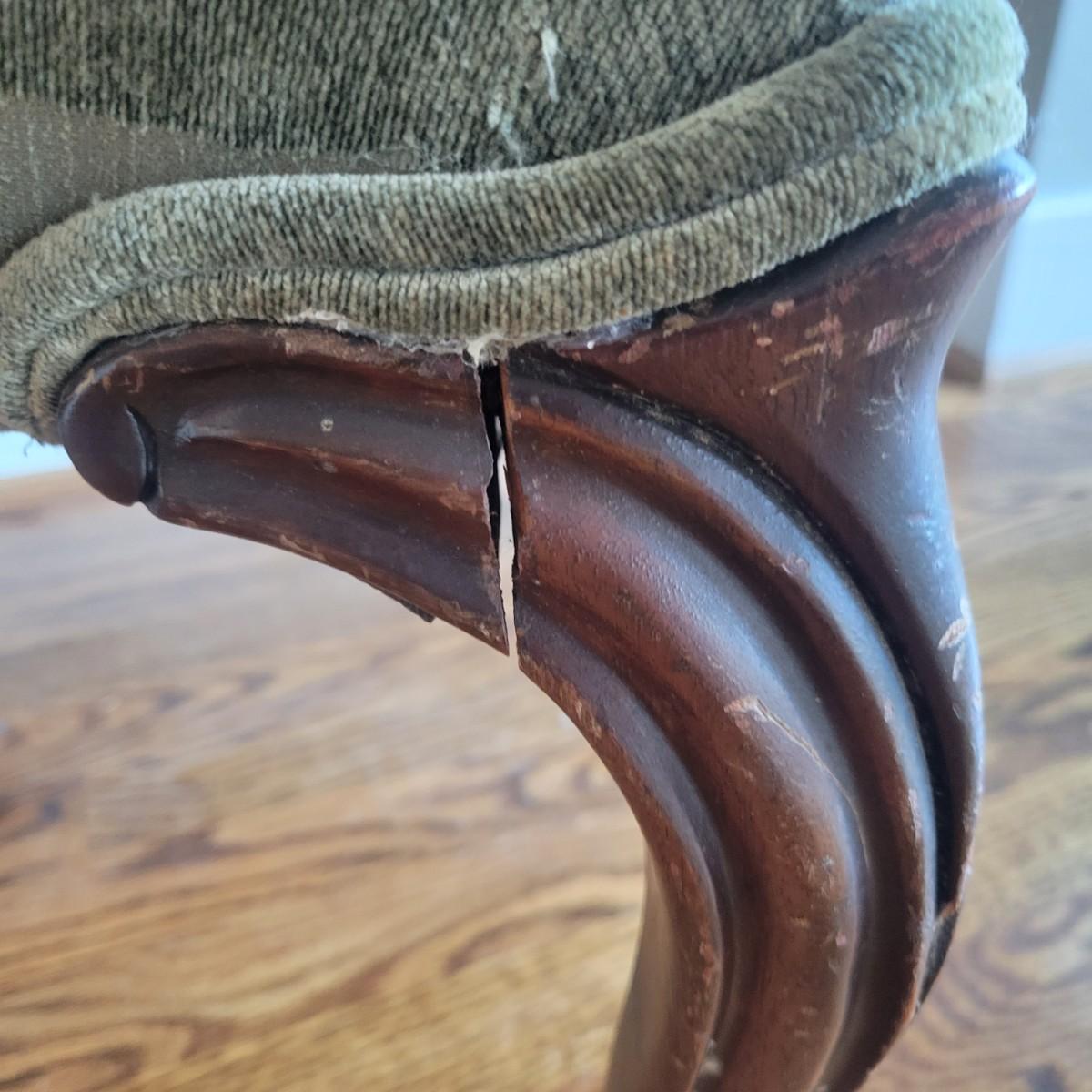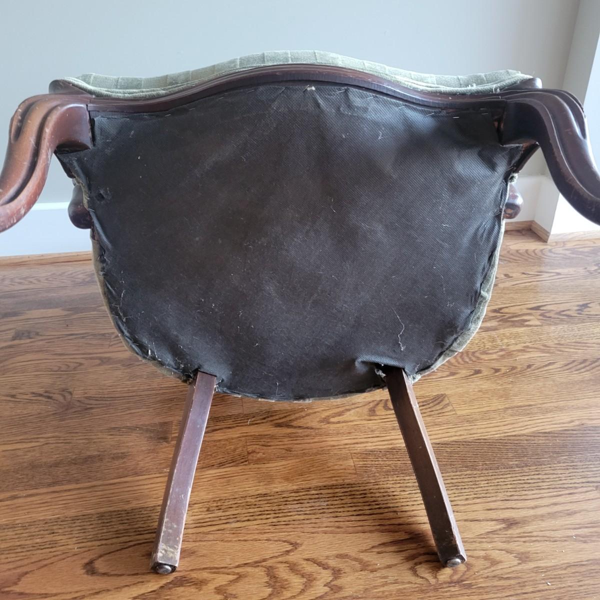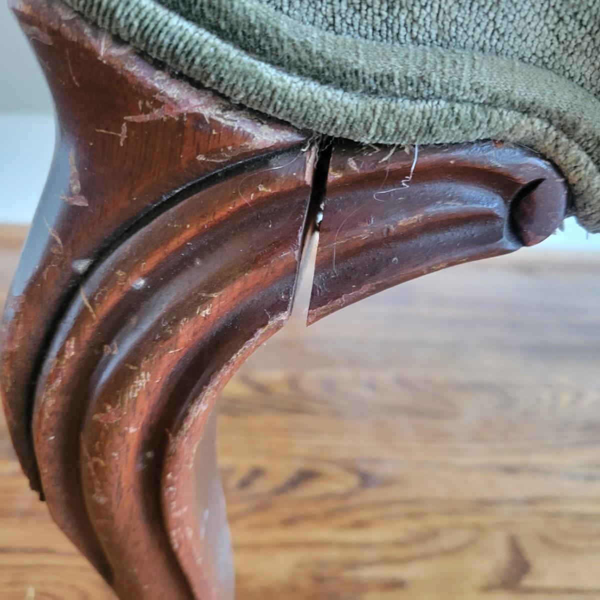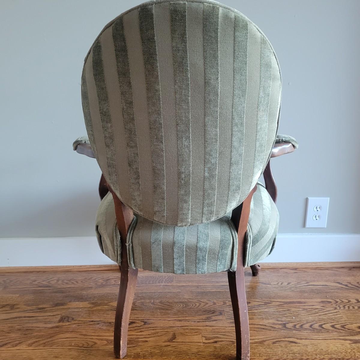 An upholstered chair with a dark wood frame in fair condition with notable scratches and areas where wood joints are gapping. This piece could be restored. Features a green upholstery that has a velour feel with no flaws. Measures approximately 24.5" x 25" x 36" with a seat height of 16.5". Local pickup only
