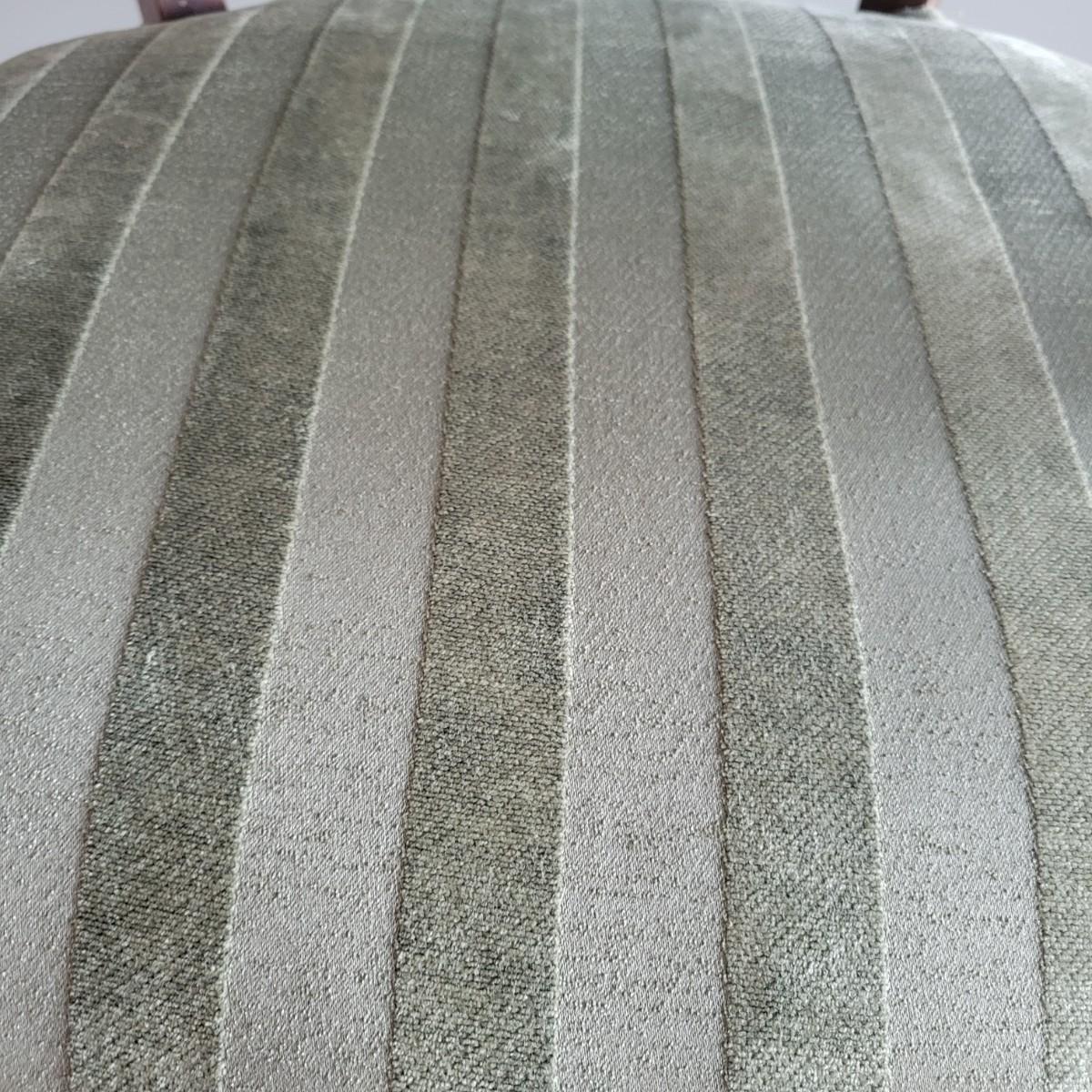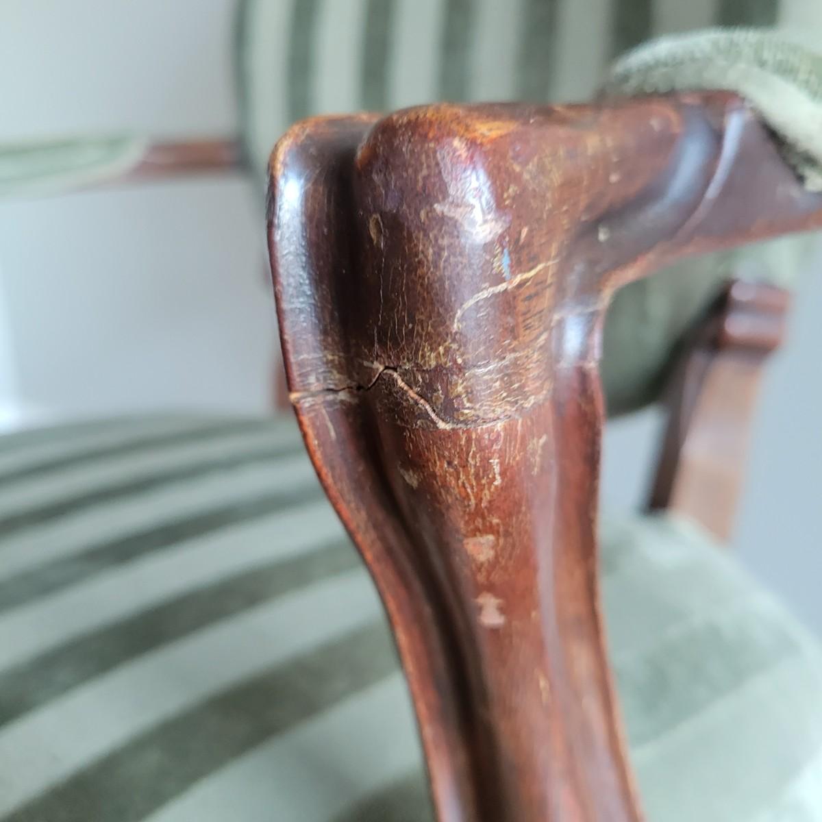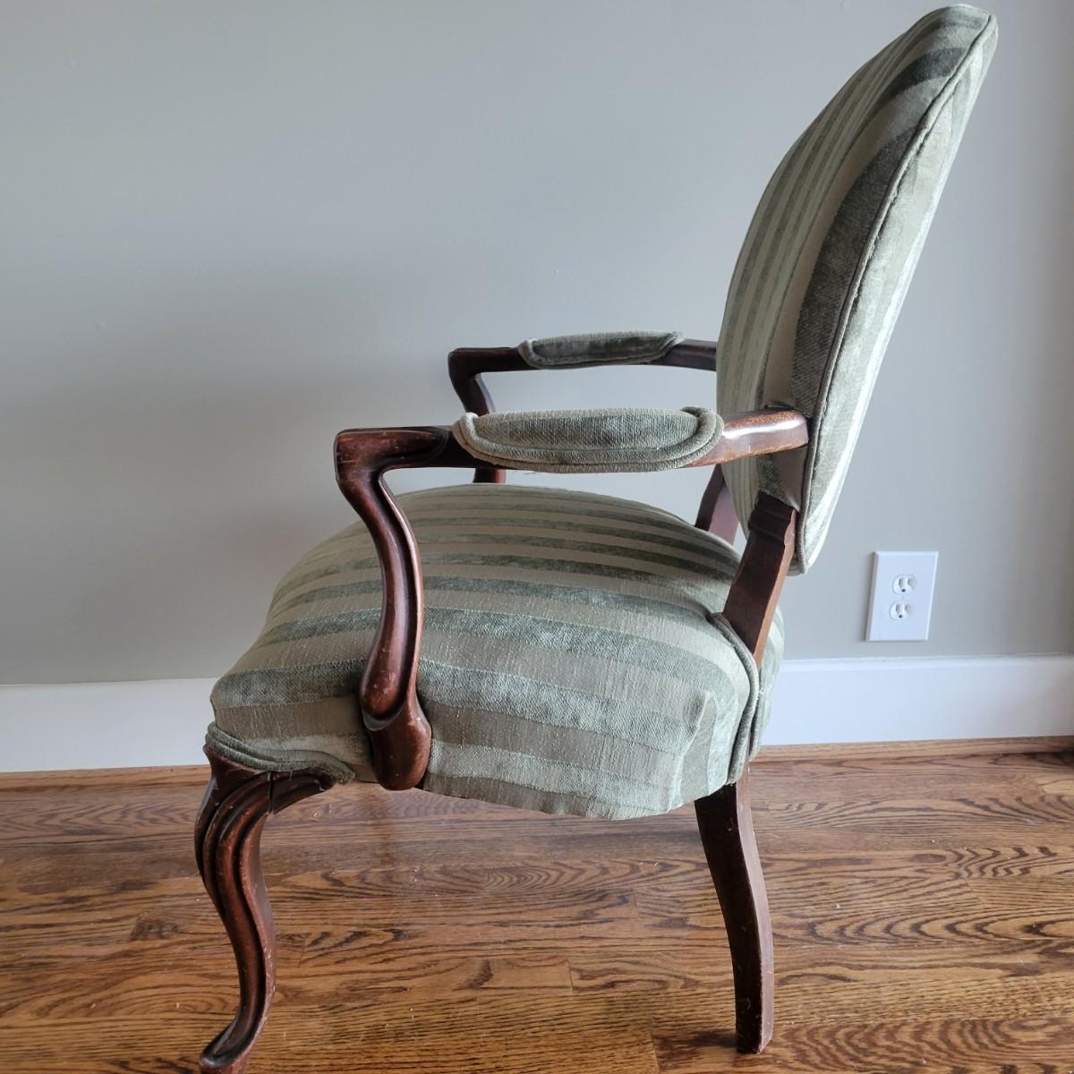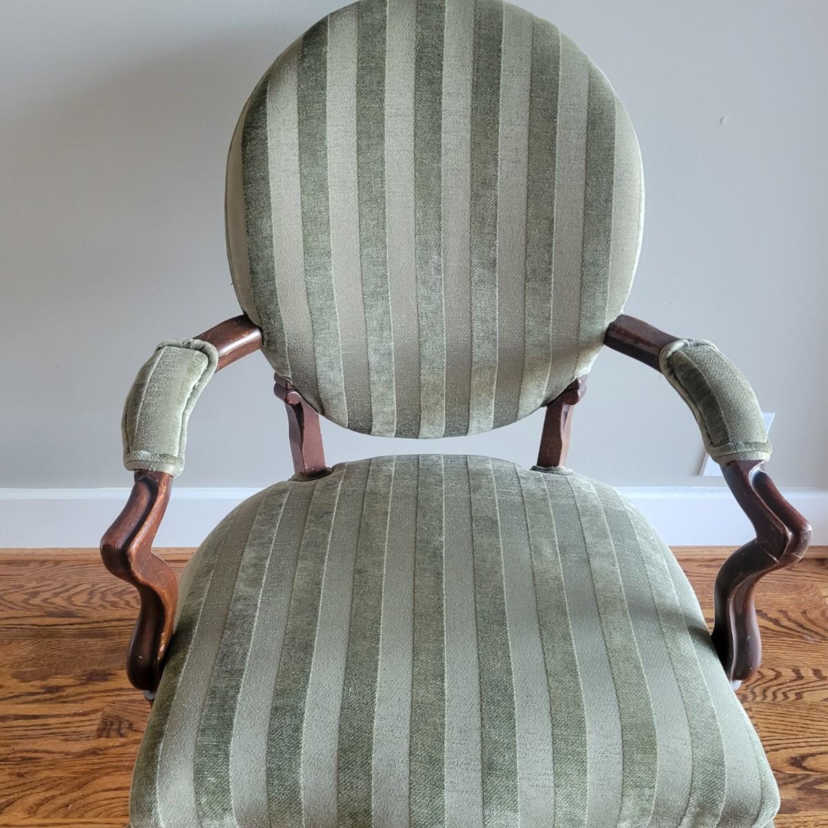An upholstered chair with a dark wood frame in fair condition with notable scratches and areas where wood joints are gapping. This piece could be restored. Features a green upholstery that has a velour feel with no flaws. Measures approximately 24.5" x 25" x 36" with a seat height of 16.5". Local pickup only