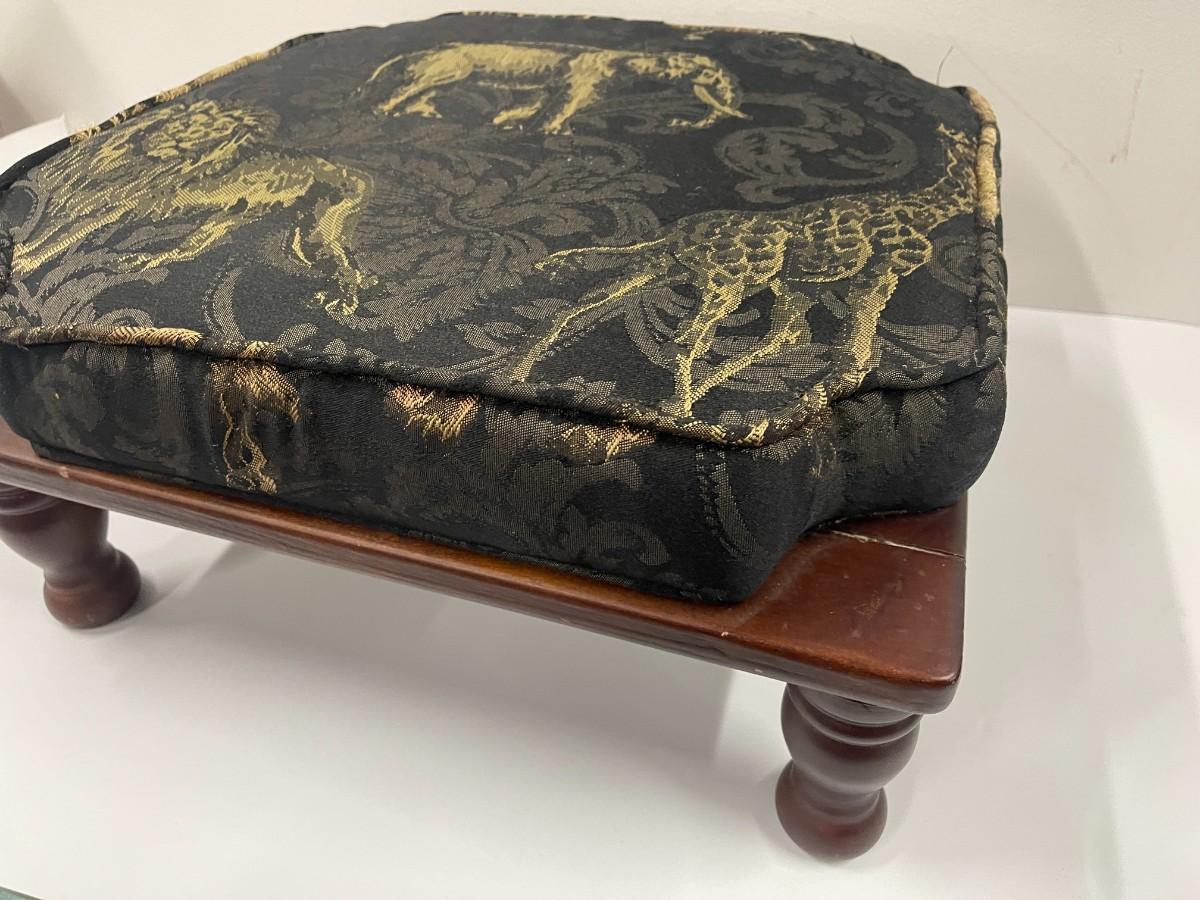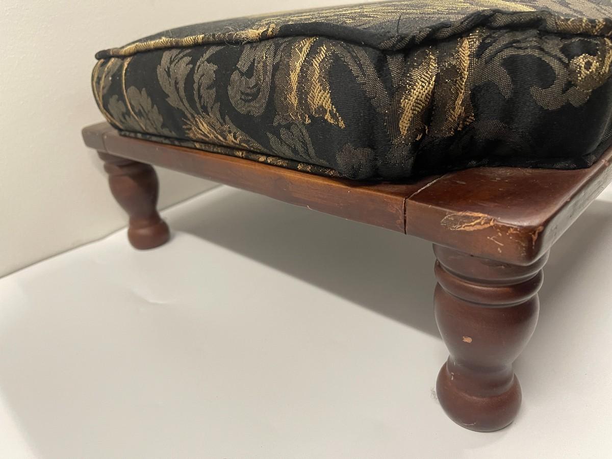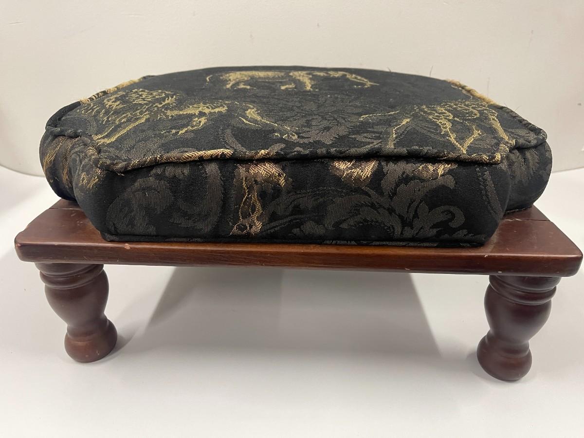 Upholstered foot stool. Good condition. Wood base shows some scratches, upholstery is clean and in very good condition. 16 1/2" x 8"