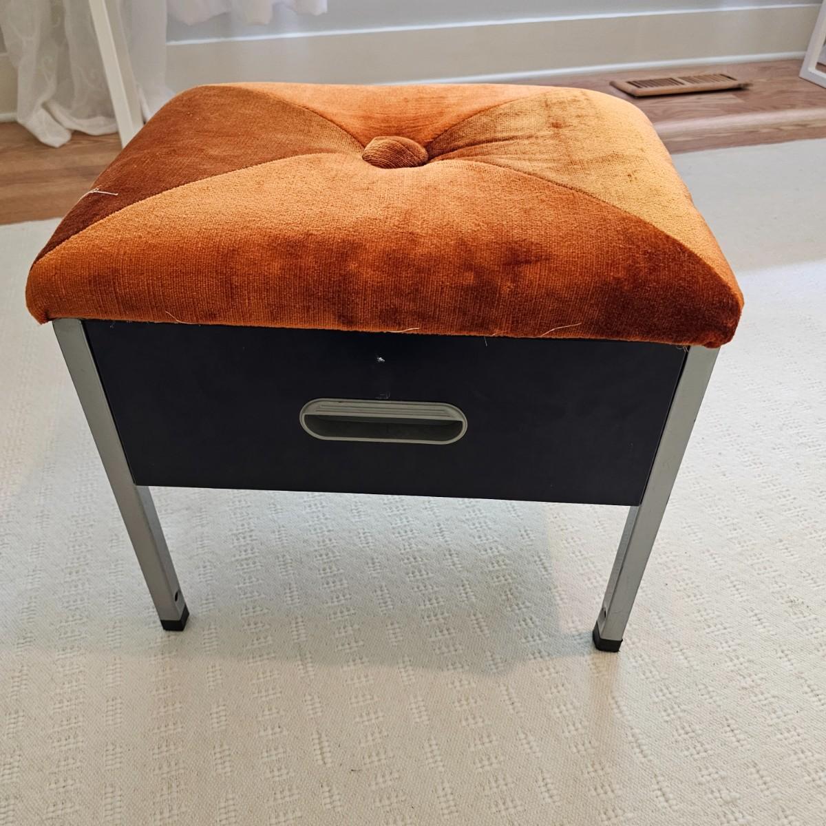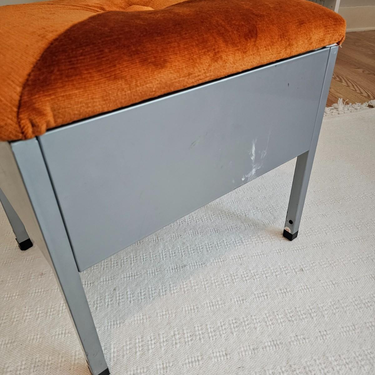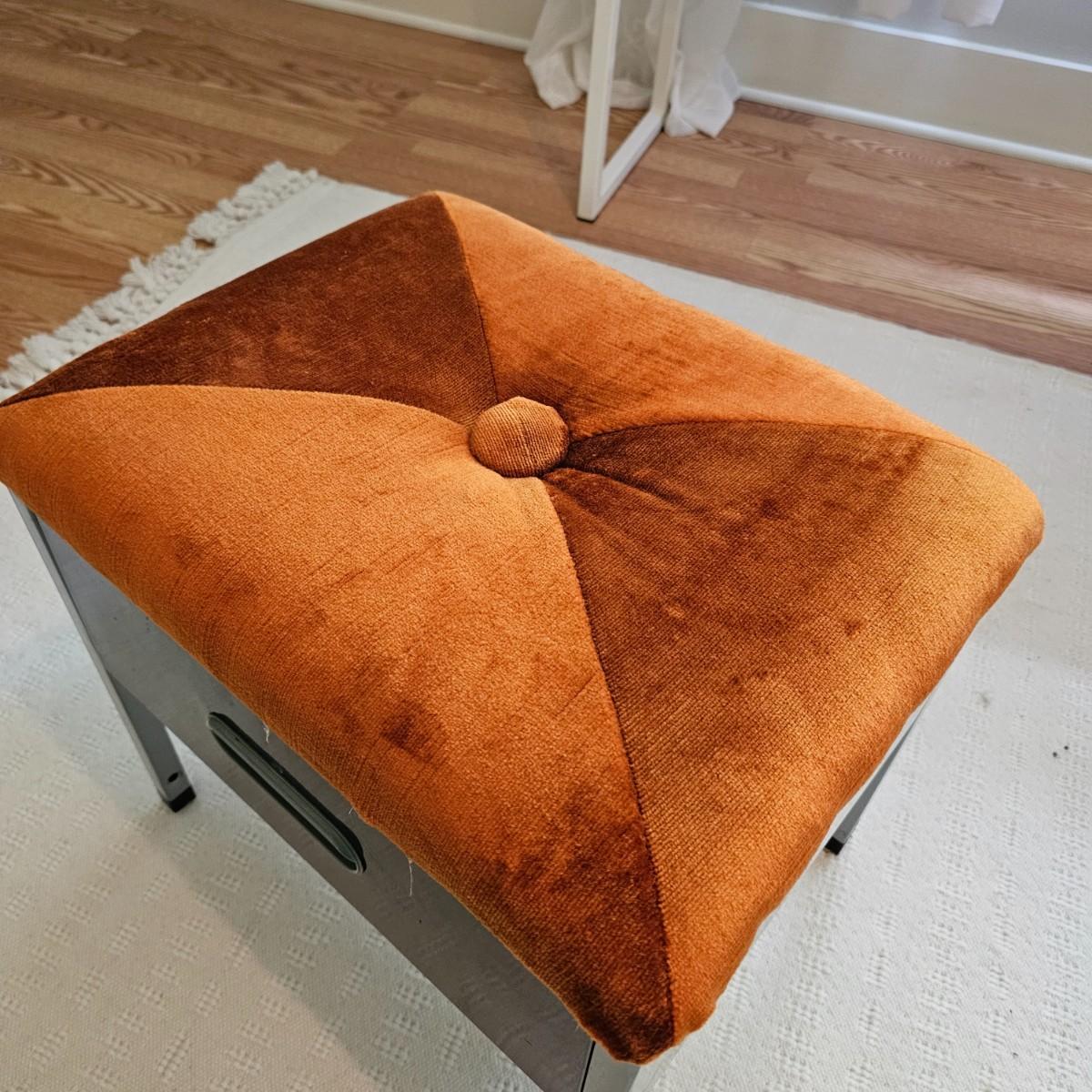 Fabric top and metal sides and legs, this piece has rust colored velour like fabric lid. Opens to reveal storage inside. 18" x 14" x16"H. See photos for details. Local Pick up only.