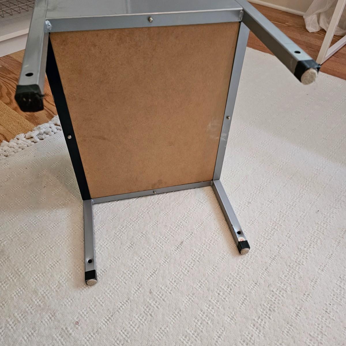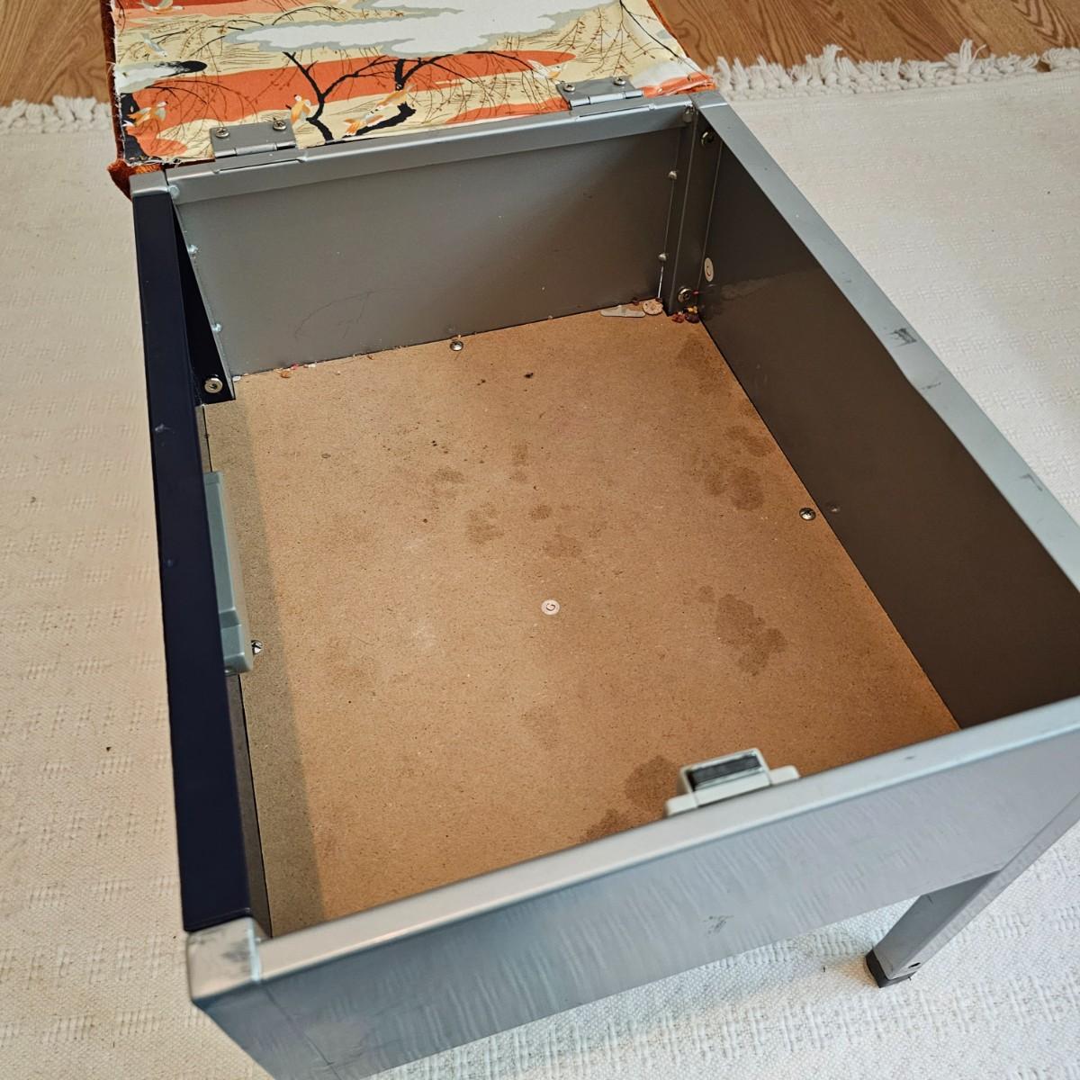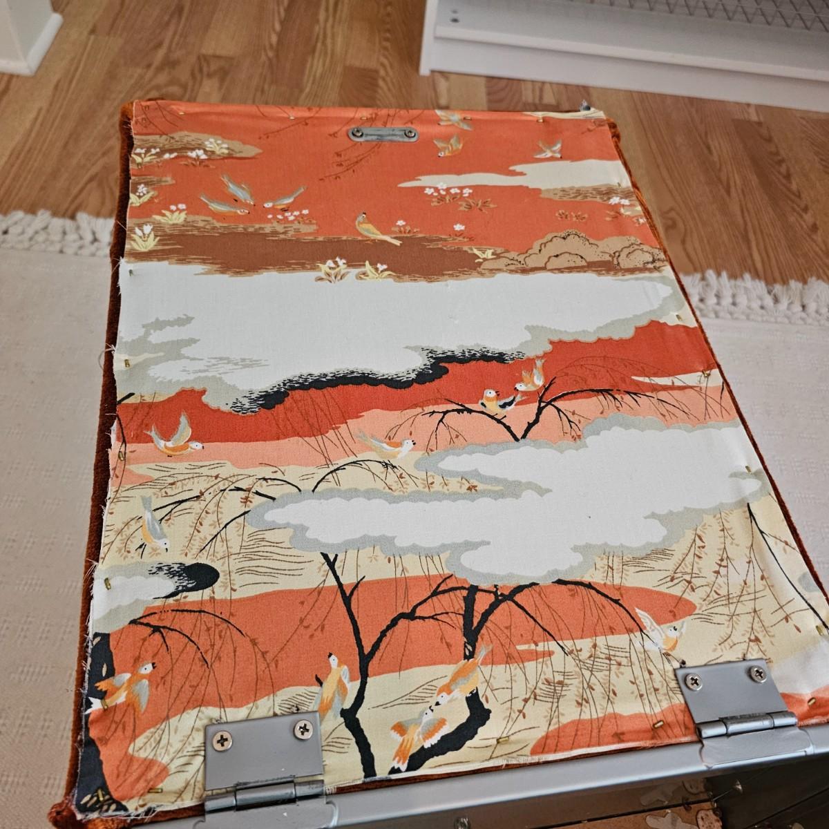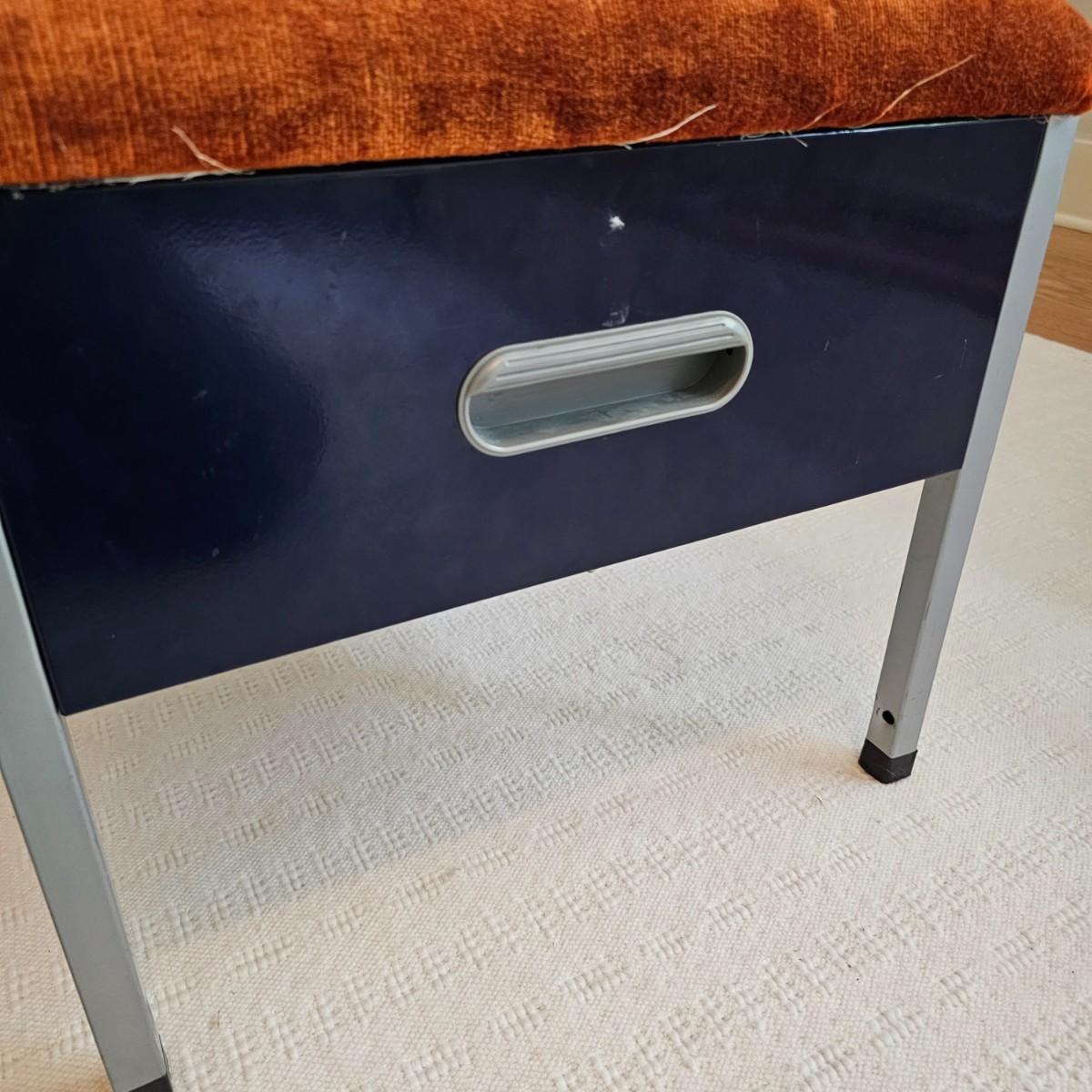 Fabric top and metal sides and legs, this piece has rust colored velour like fabric lid. Opens to reveal storage inside. 18" x 14" x16"H. See photos for details. Local Pick up only.