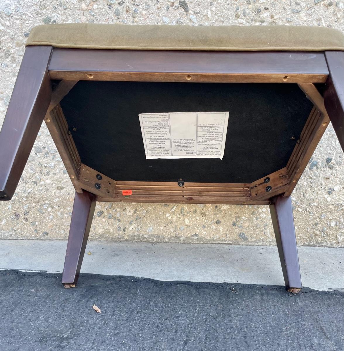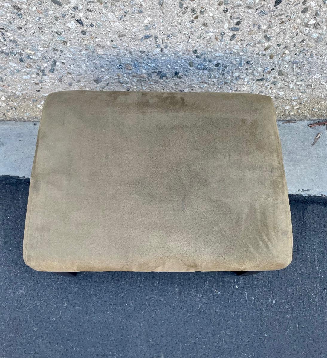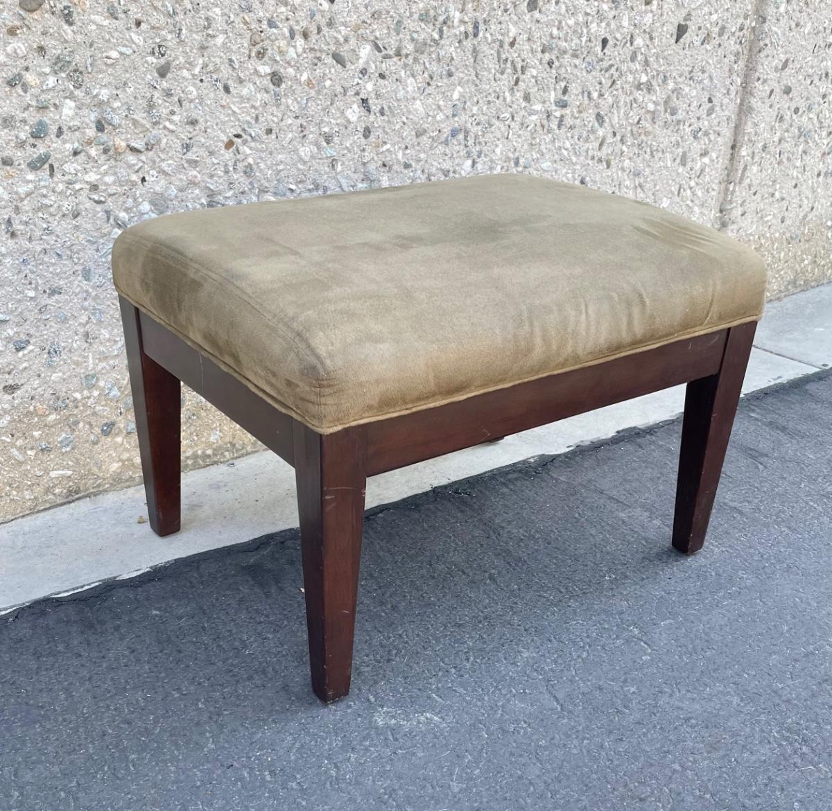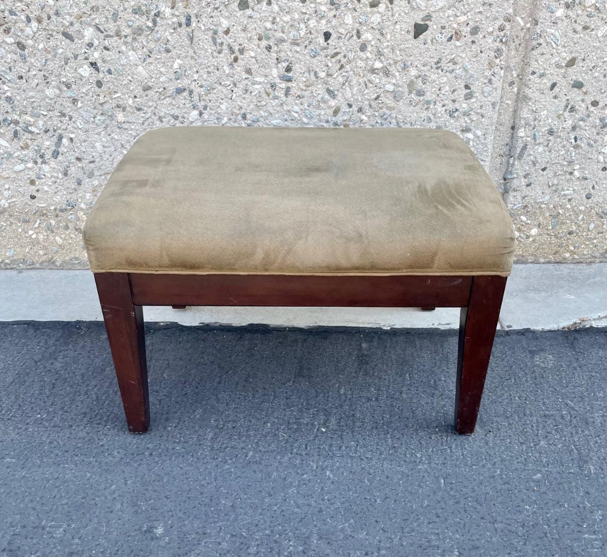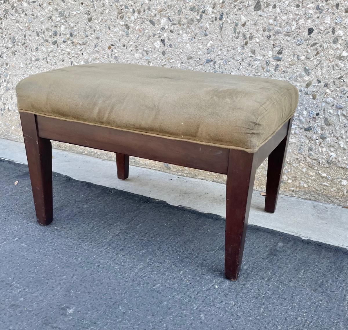 Footstool with dark brown wood frame and legs. Approx 17” tall x 18” deep x 24” wide.