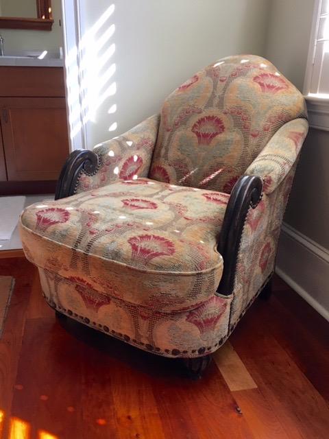 Upholstered Fox Chair in Chestnut Finish upholstered in judy/multi green fabric with antique nail trim along bottom with rounded vase shaped bun feet and leather square ottoman