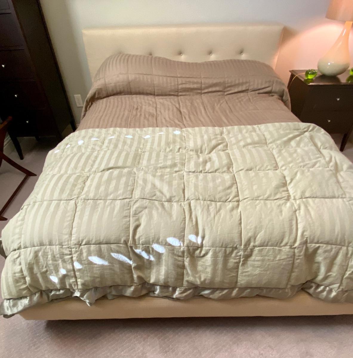 Off white fabric upholstered headboard. Includes mattress and box spring, queen size.