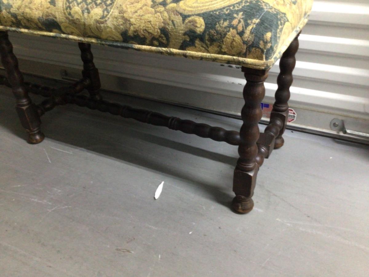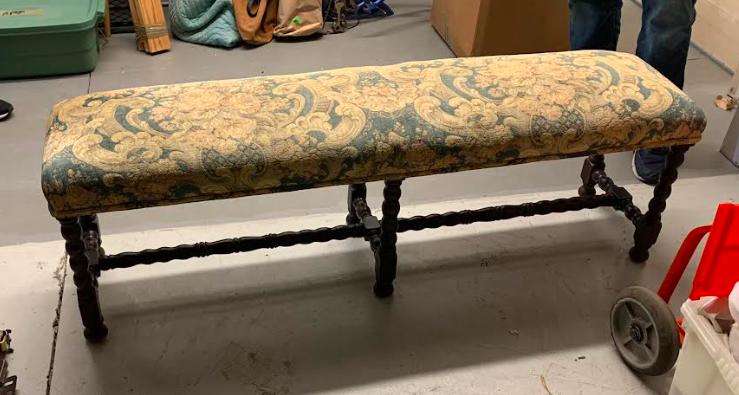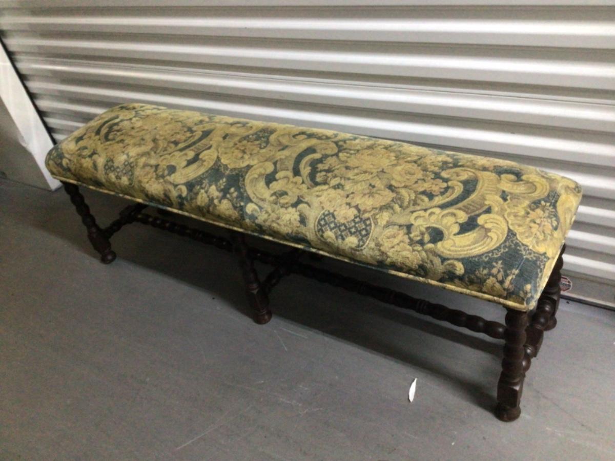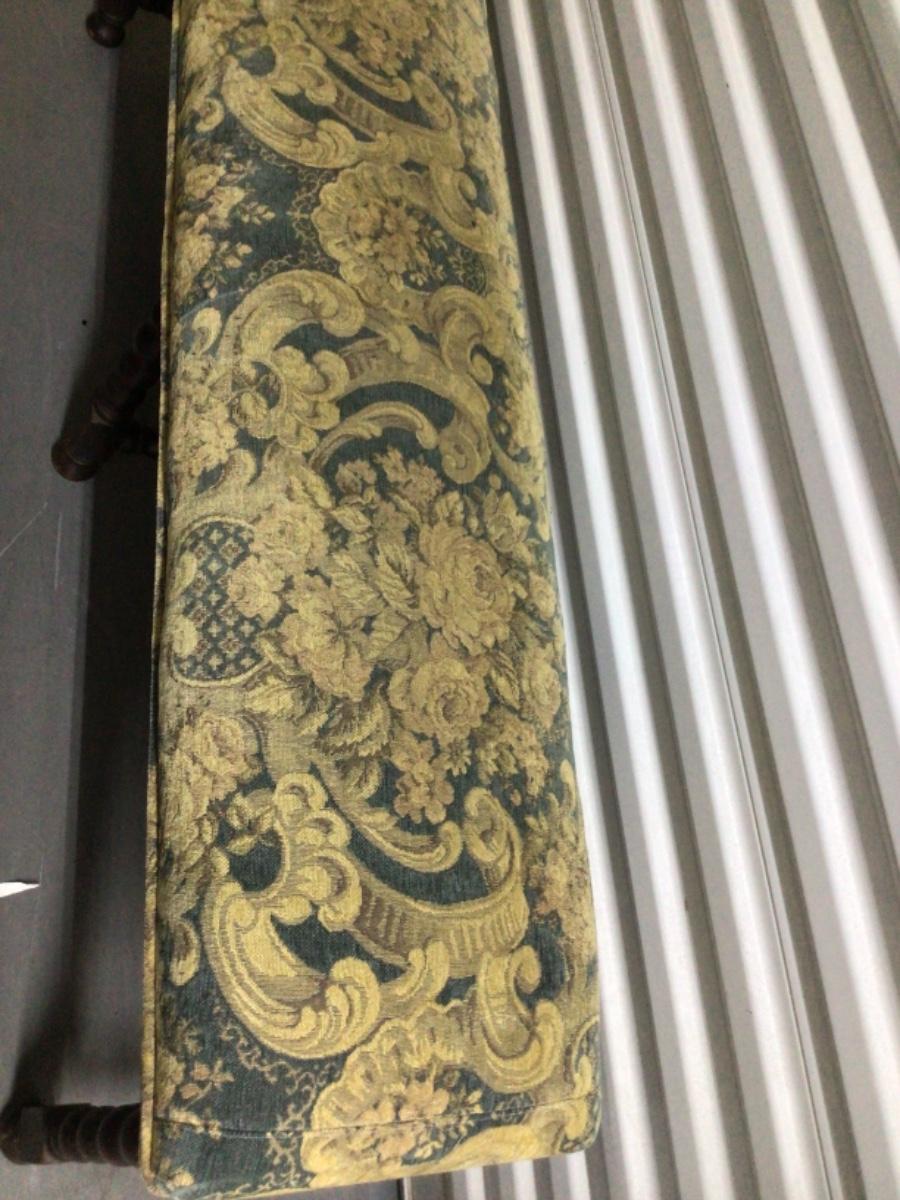 Hardwood base. The upholstery is blue and off white and has a soft velvet texture. 58”long x 15”deep x 18” high. This is a heavy item. You must bring help to move this item into your vehicle. Local delivery may be able available at cost to the buyer. If you need an item to be delivered then please coordinate with us once you have purchased the item. Pick Up of Purchased Items will be on Saturday the 16th at Morningstar Storage in Bluffton, SC. 1110 Fording Island Rd, Bluffton, SC 29910. At the end of the sale todayI will send out a SignUpGenius link to the winning bidder to schedule your your pick up time along with a contact phone number.