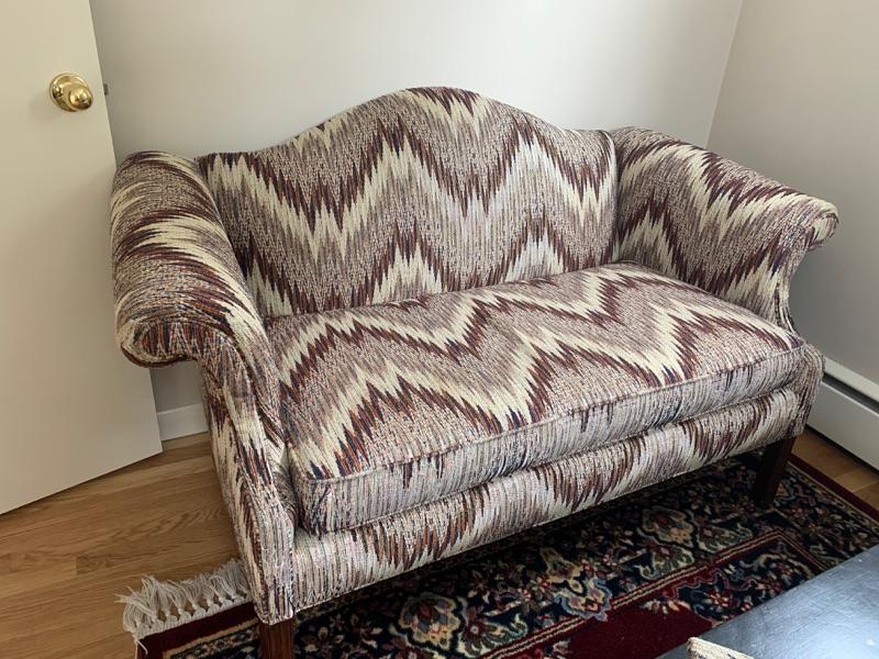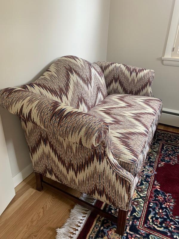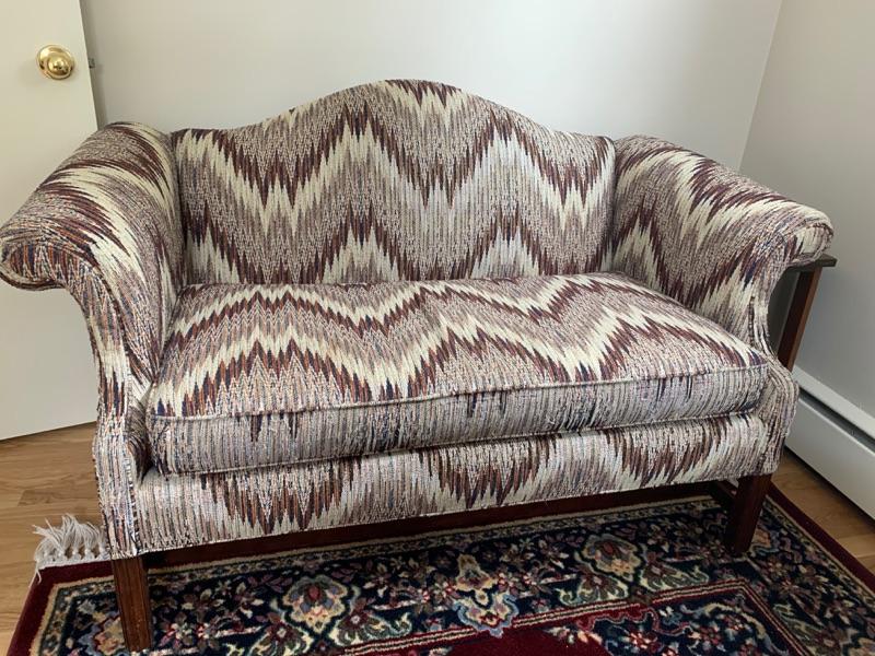 Vintage camelback upholstered loveseat in a flame-stitch nubby fabric. Sheraton legs, good quality reproduction of a period sofa, possibly an Angel House Designs or Seraph piece.Upholstery shows some snags and a little wear but not much and no stains, rips, tears, or sun-fading.