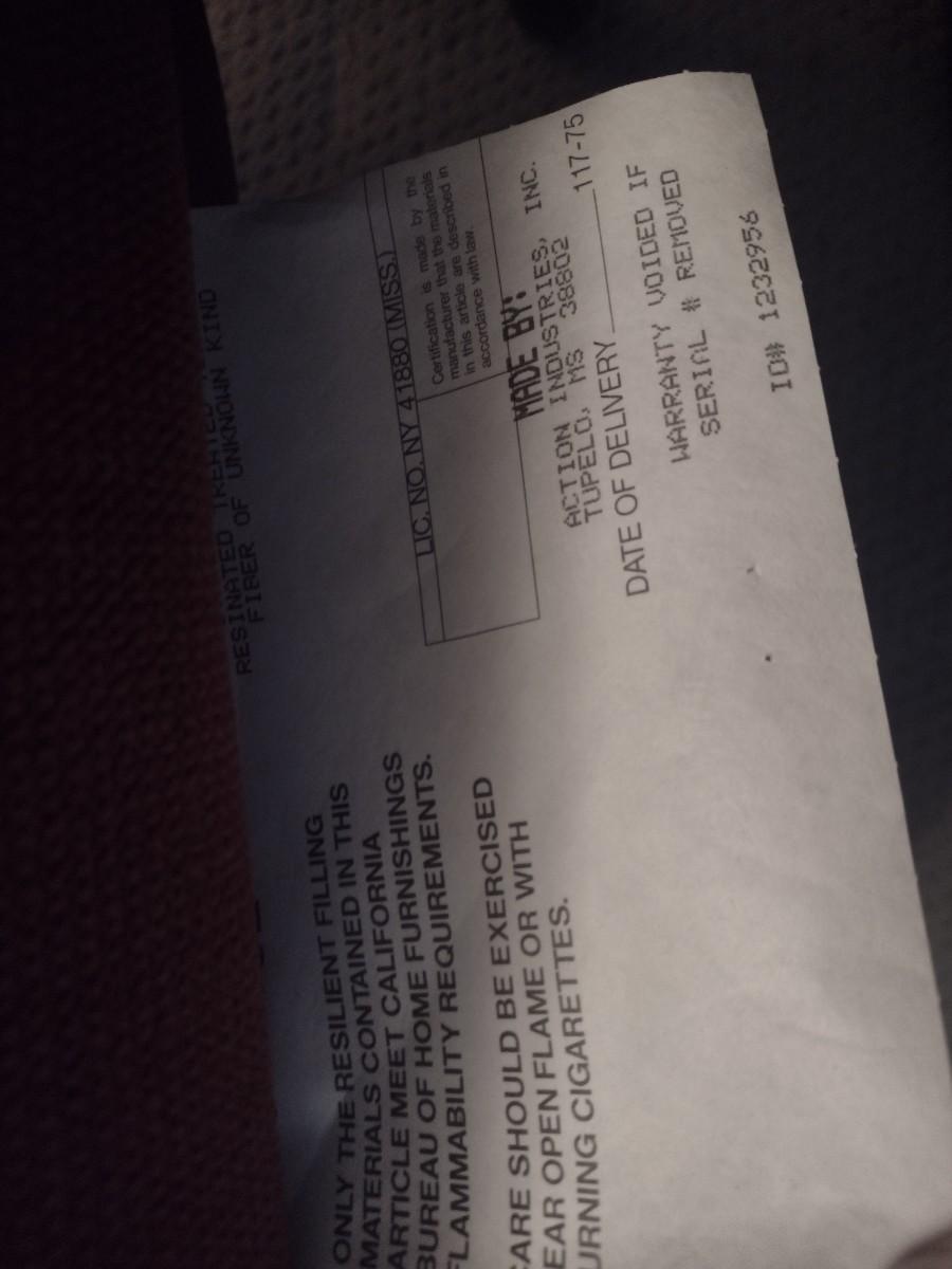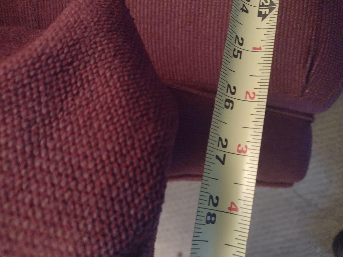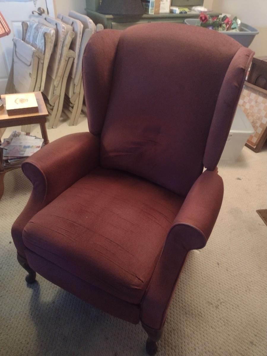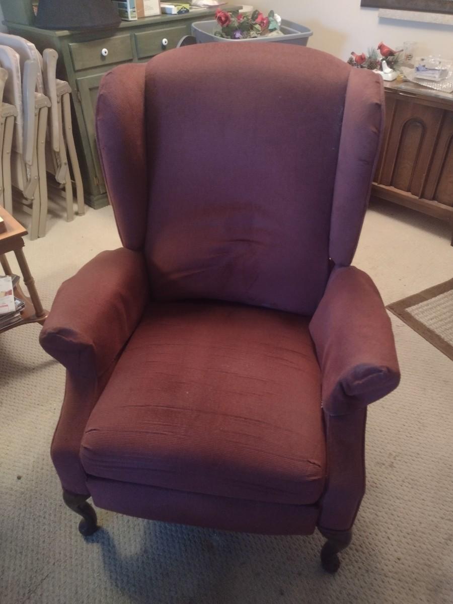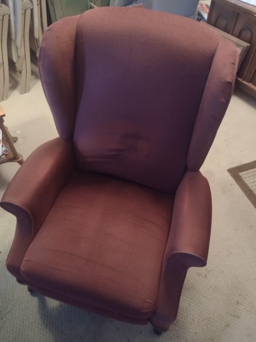 Upholstered Manual Reclining Chair Choice A. There is wear on the arms where the back of chair rubs during reclining motion. Chair may need to be cleaned.
