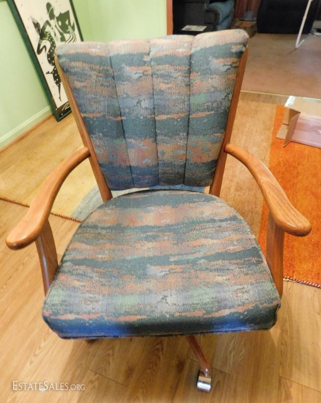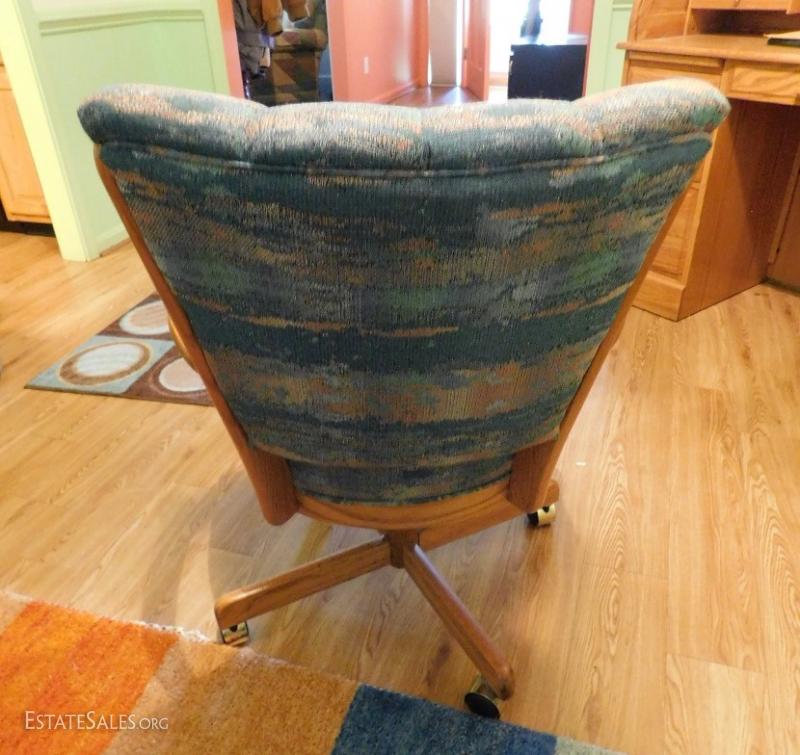 Wood frame with patterned upholstery chair. On casters and swivels. Like new condition.