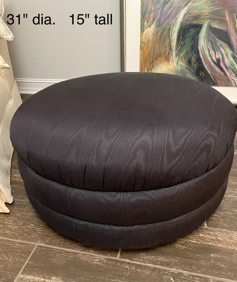 Upholstered in moire taffeta. Perfect condition. Measures 18" high and 36" in diameter