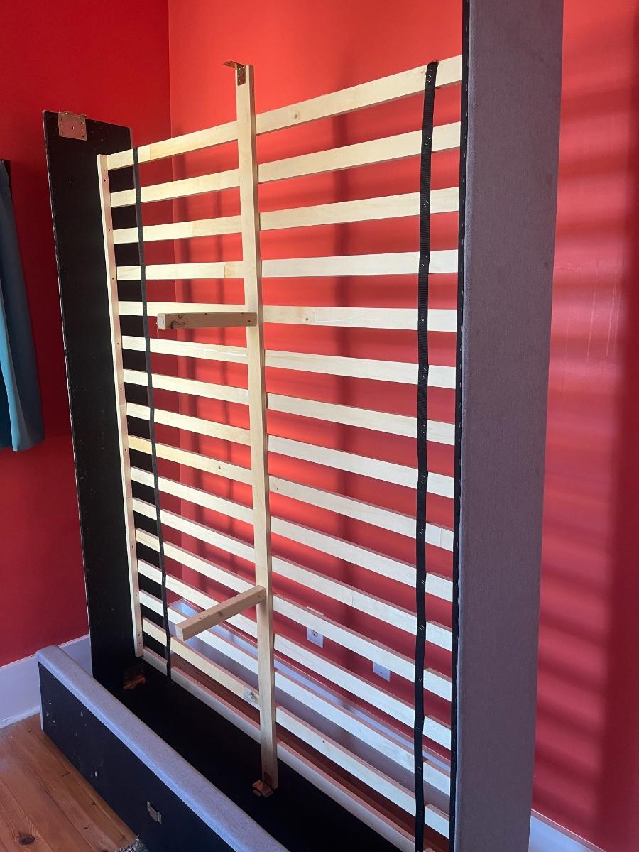 Upholstered queen bed frame with Sealy Crown Jewel Black Opal Plush mattress; boxspring and slats; approx. 82" x 62" x 16" H; also available without mattress
