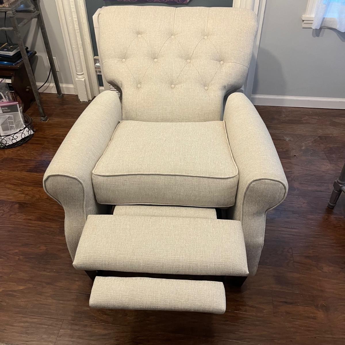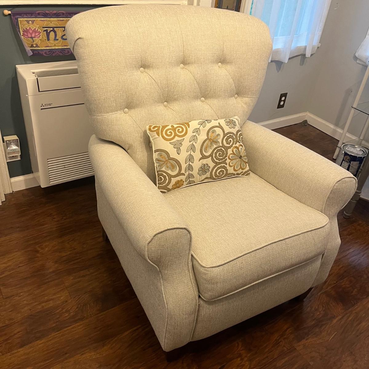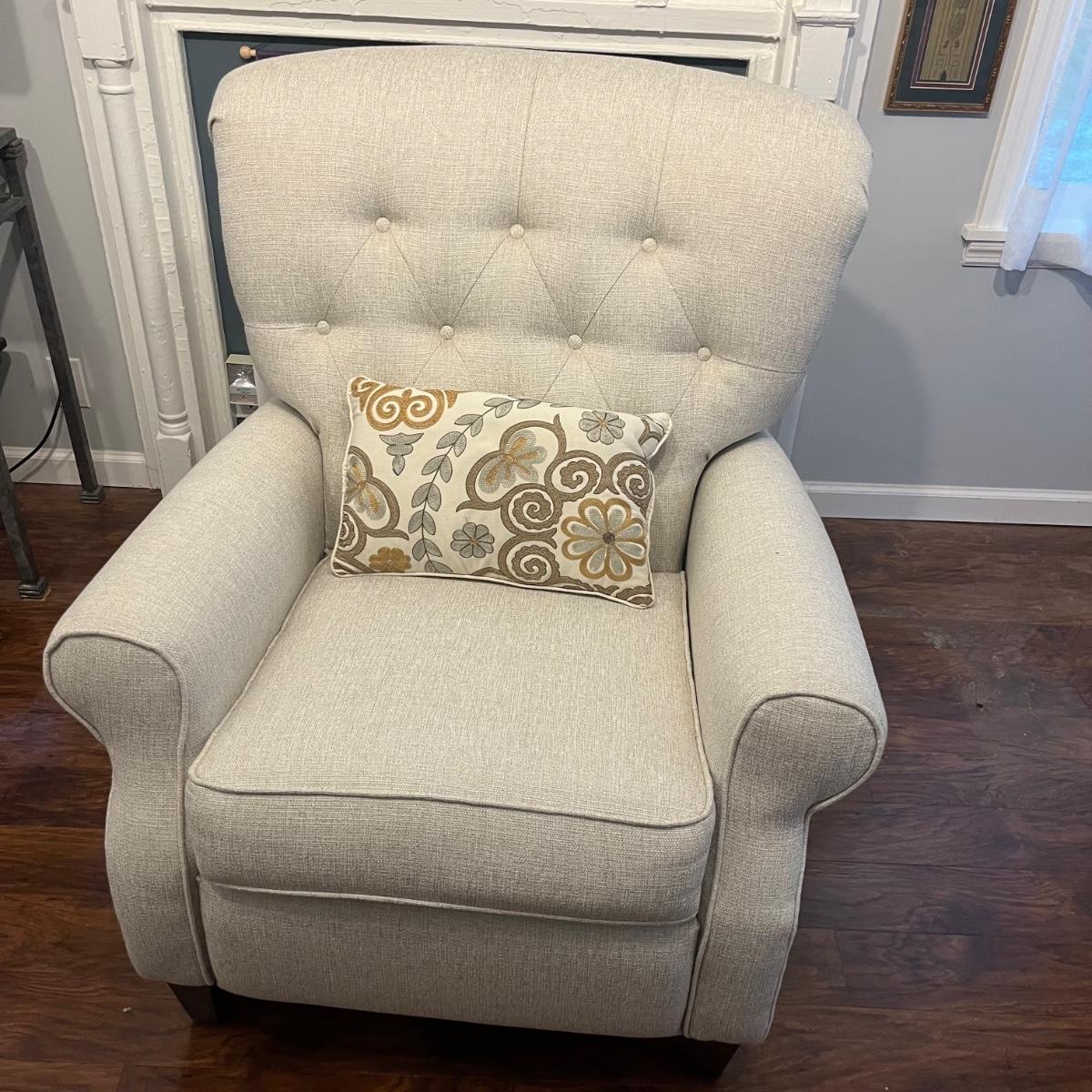 Lot includes an off-white upholstered recliner that measures 35” x 34” x 40”H with a 20” seat height.