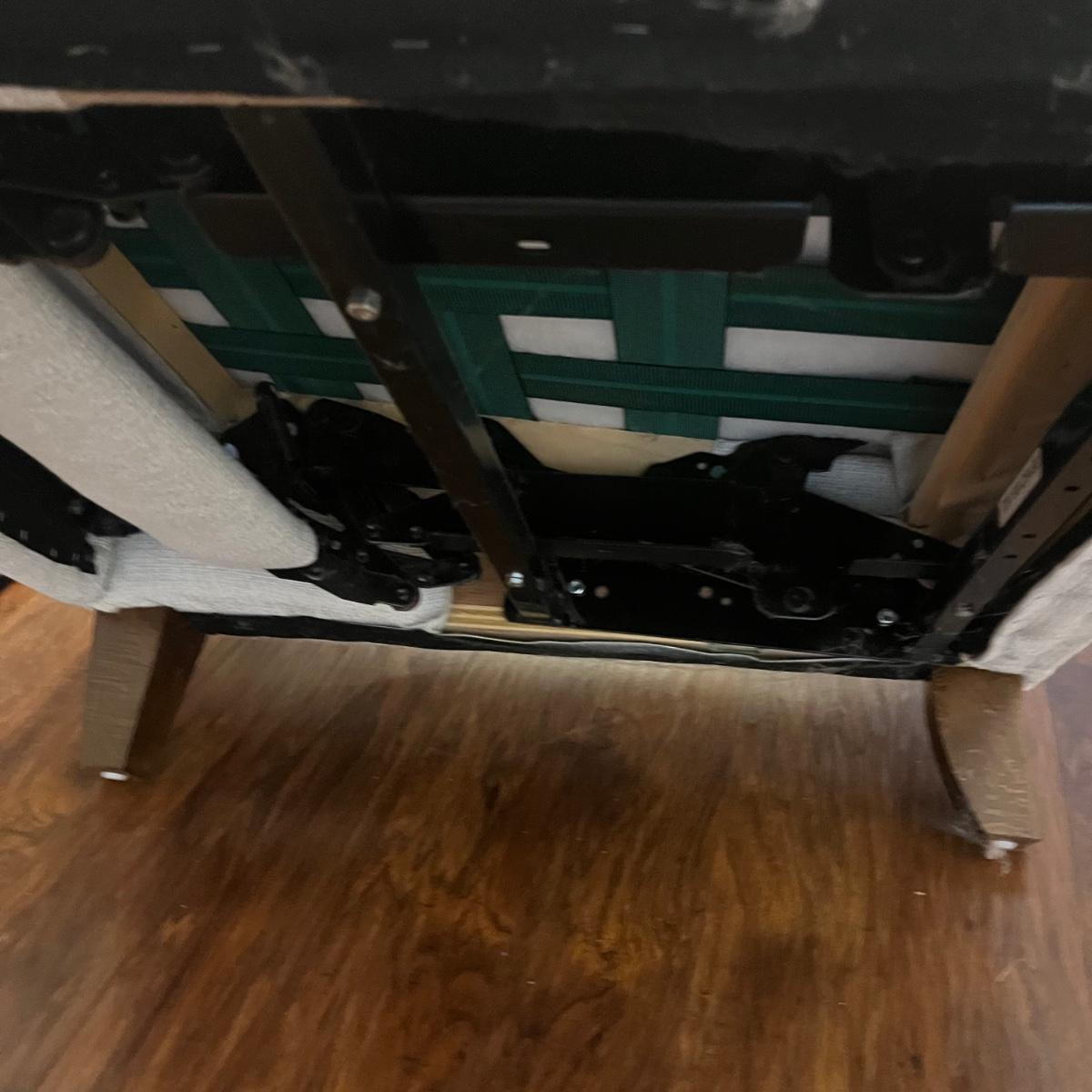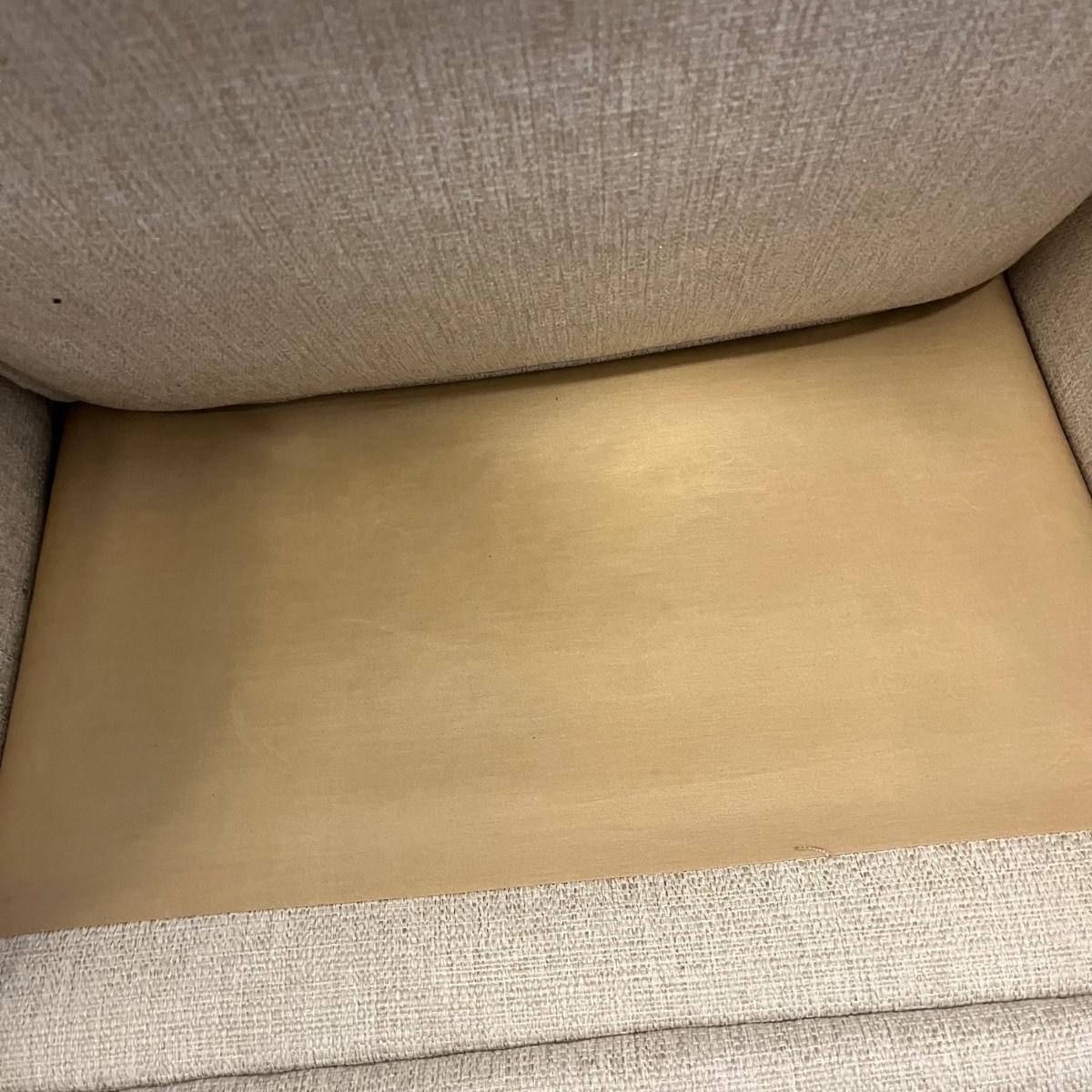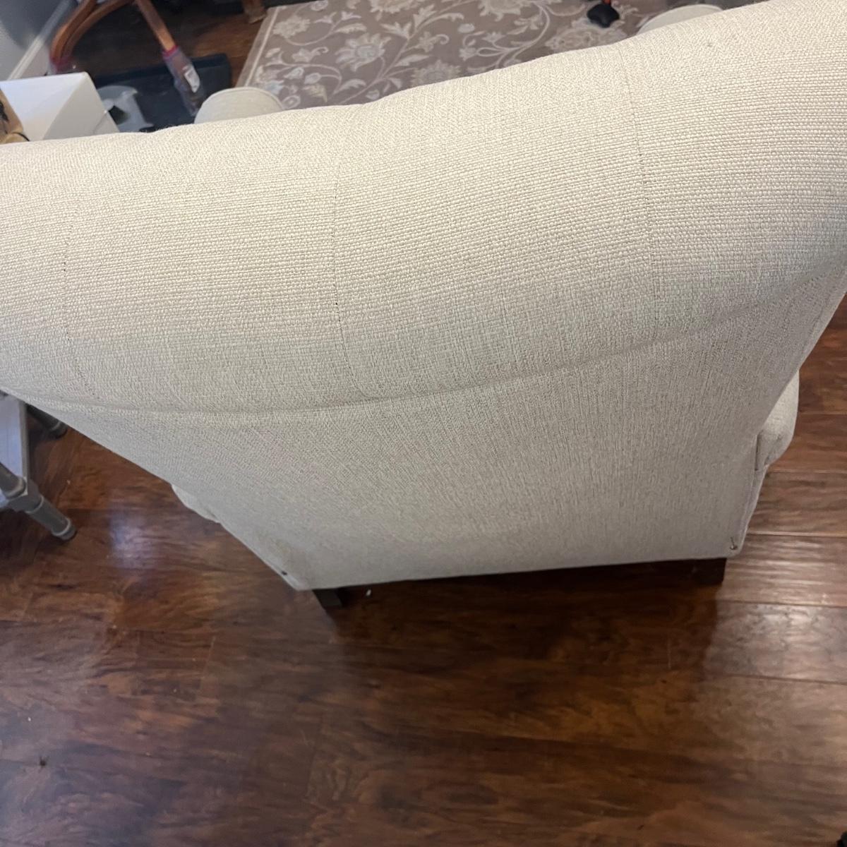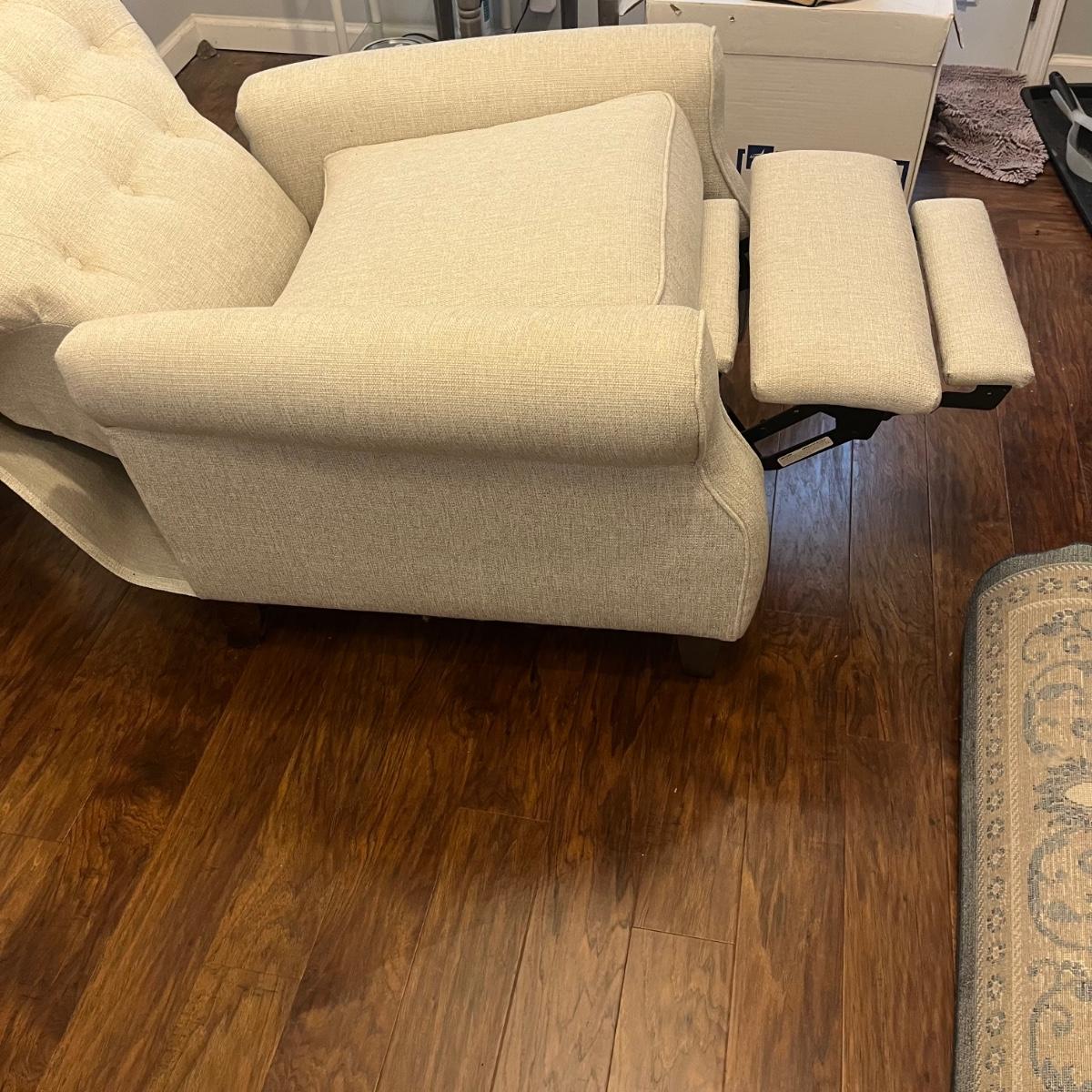 Lot includes an off-white upholstered recliner that measures 35” x 34” x 40”H with a 20” seat height.