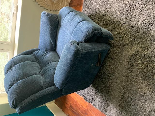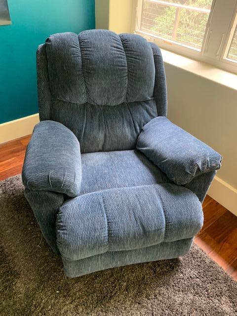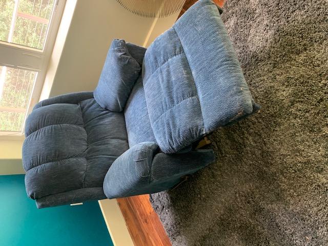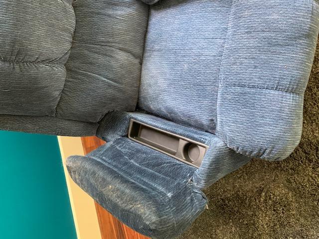 Upholstered Recliner with Arm Rest Storage may need to be cleaned. has some color fade but in good condition
