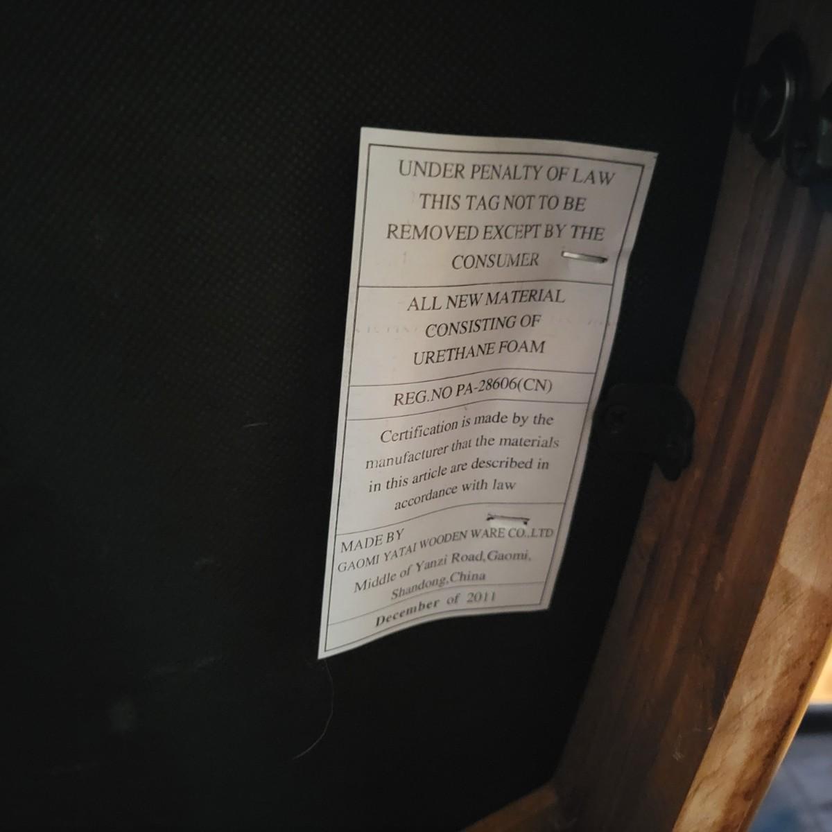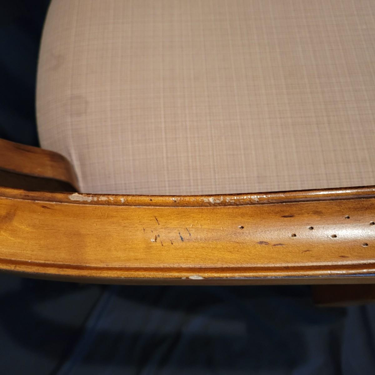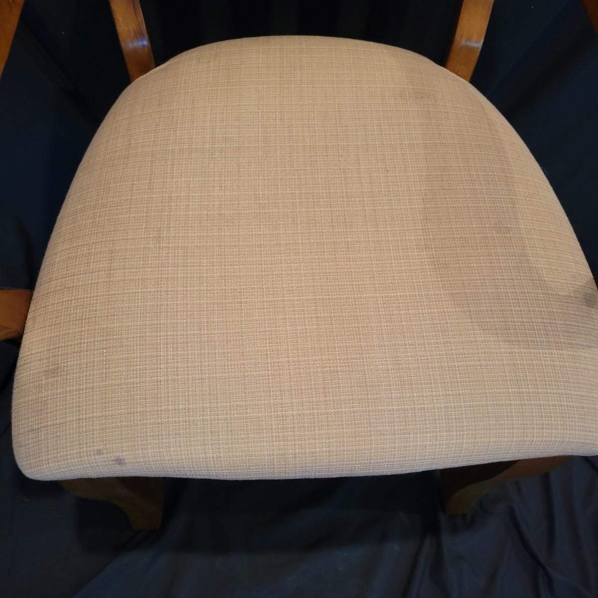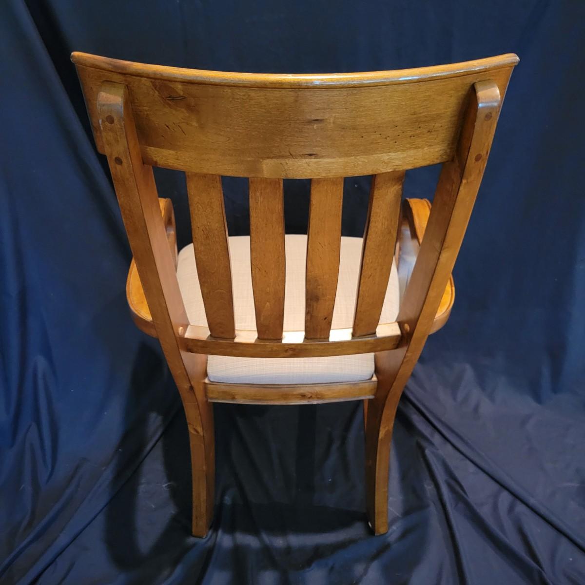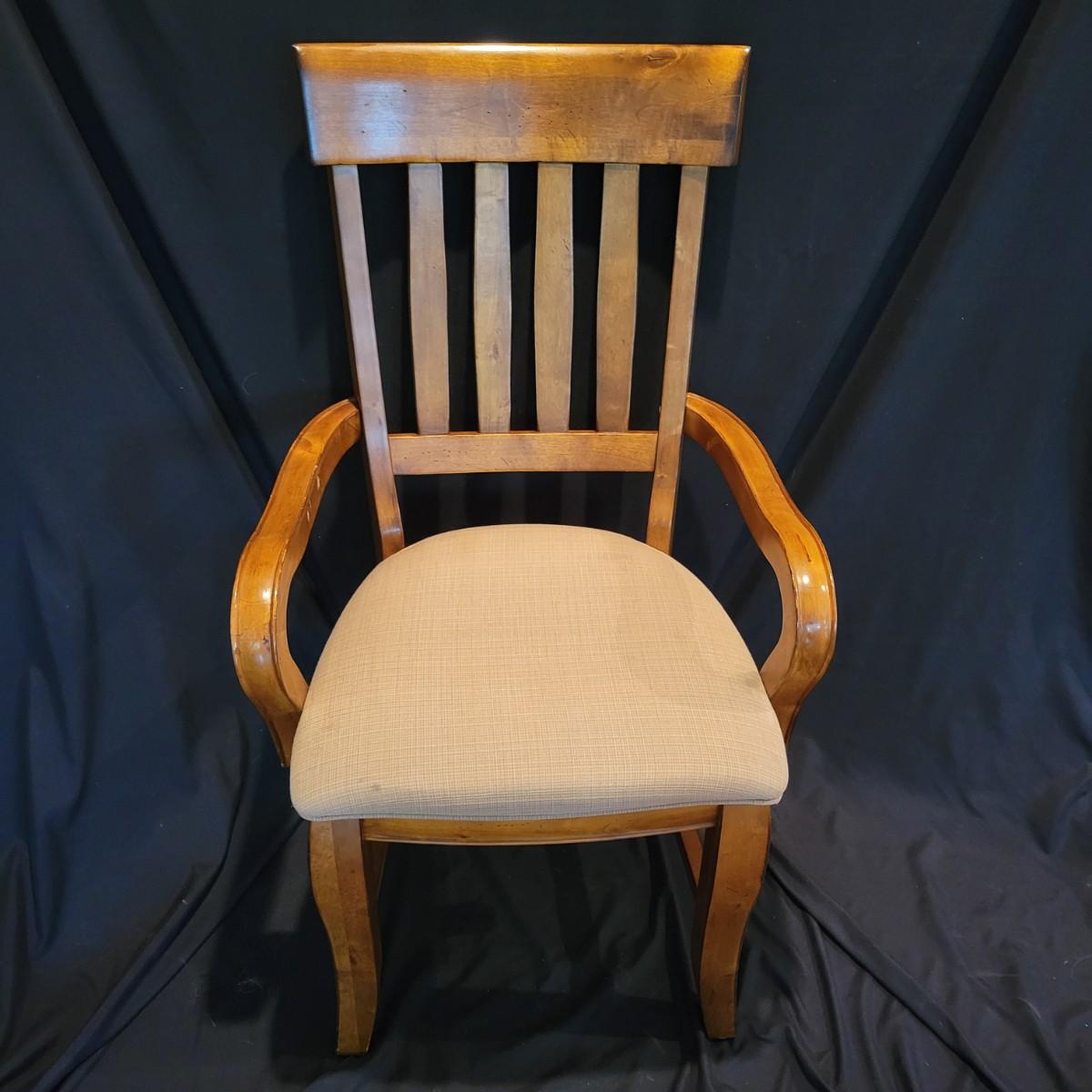 A solid wood chair with an upholstered seat cushion that measures approximately 23" x 24" x 39.5"H with a seat height of 18.5". There are some minor stains on the seat cushion and some minor scratches on one chair arm. Local pickup only