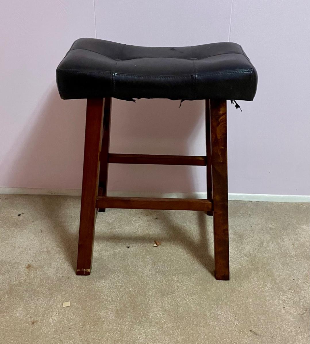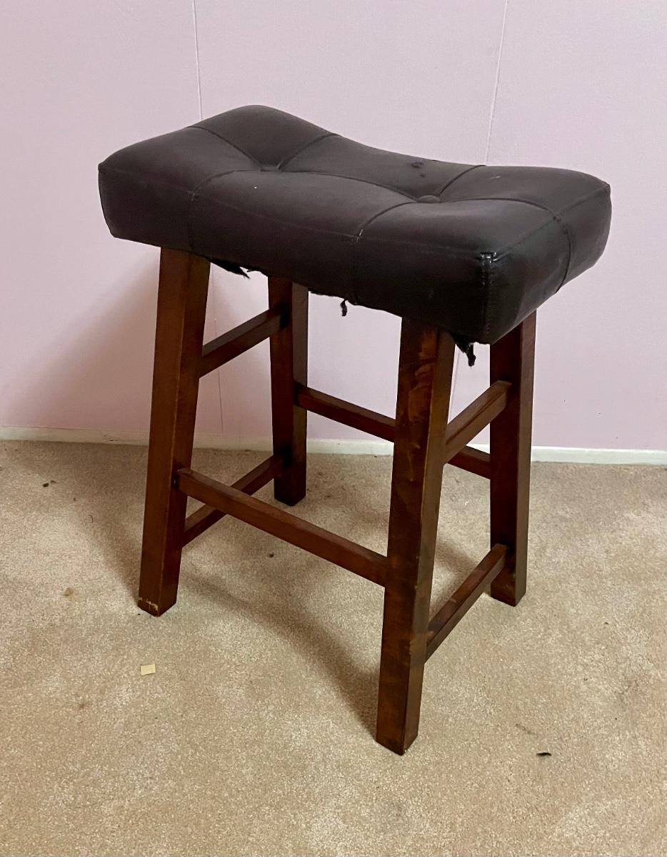 Faux leather, solid wood base. Good condition, seat is approx. 19” x 11”, 24” tall.