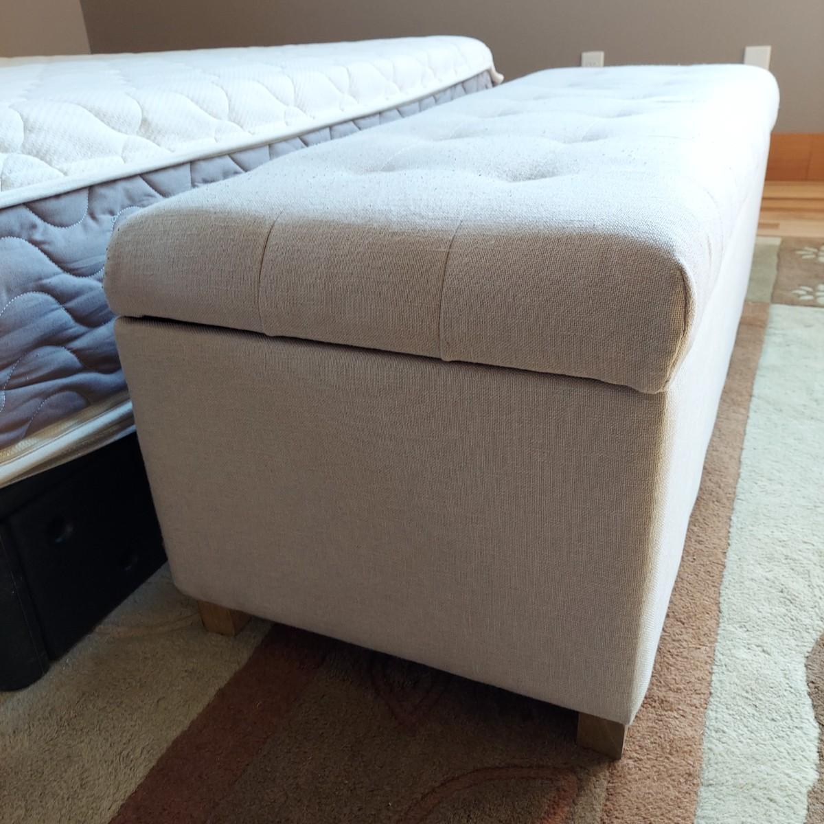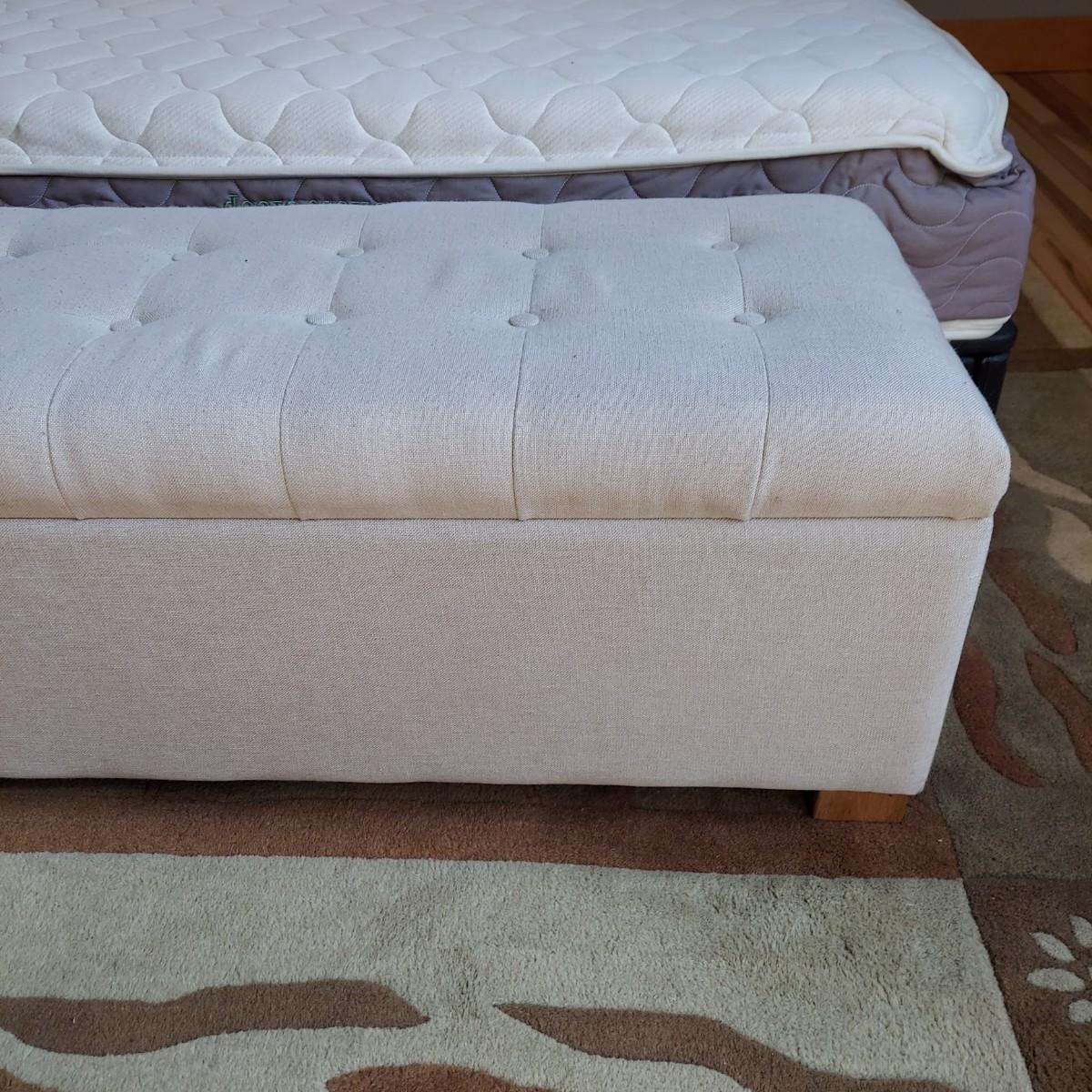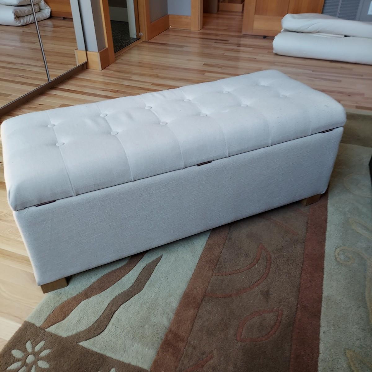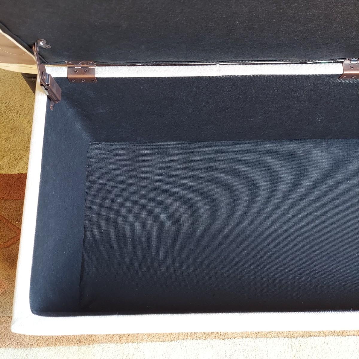 Beige upholstered storage bench ottoman. There is some overall wear. Please see photos and note item is from a pet owned home. Measures approximately 46 x 18 x 17"H. Local Pickup Only.