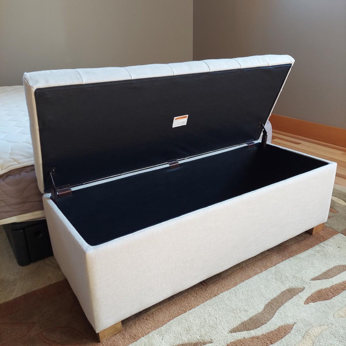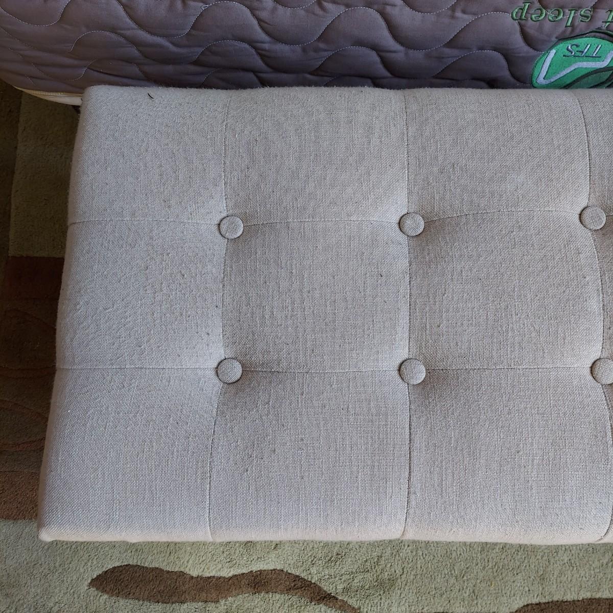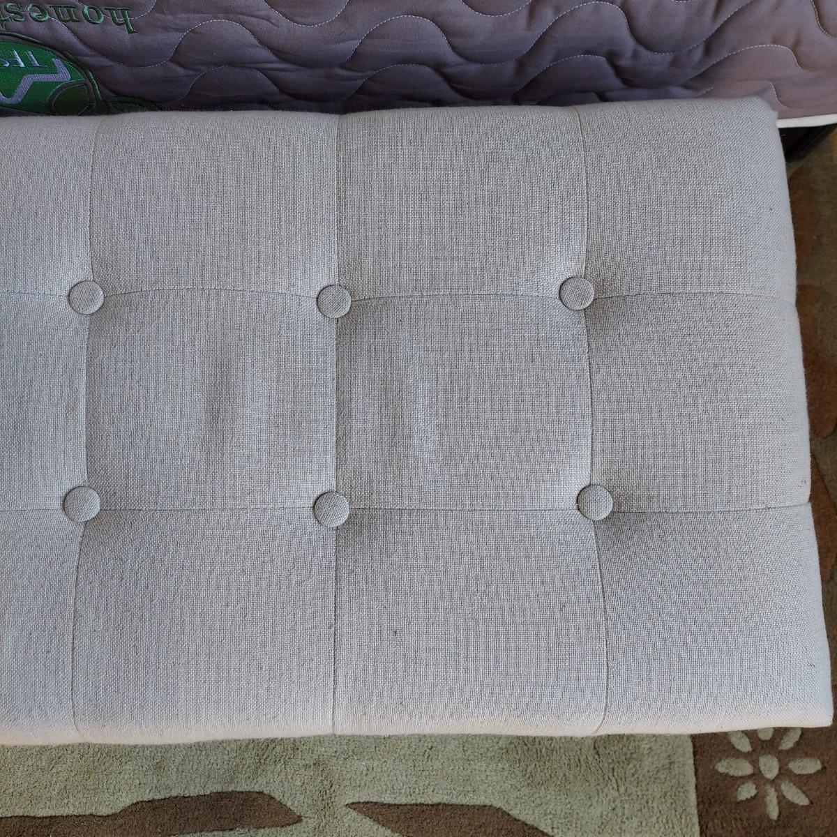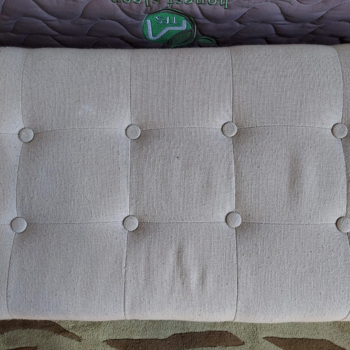 Beige upholstered storage bench ottoman. There is some overall wear. Please see photos and note item is from a pet owned home. Measures approximately 46 x 18 x 17"H. Local Pickup Only.