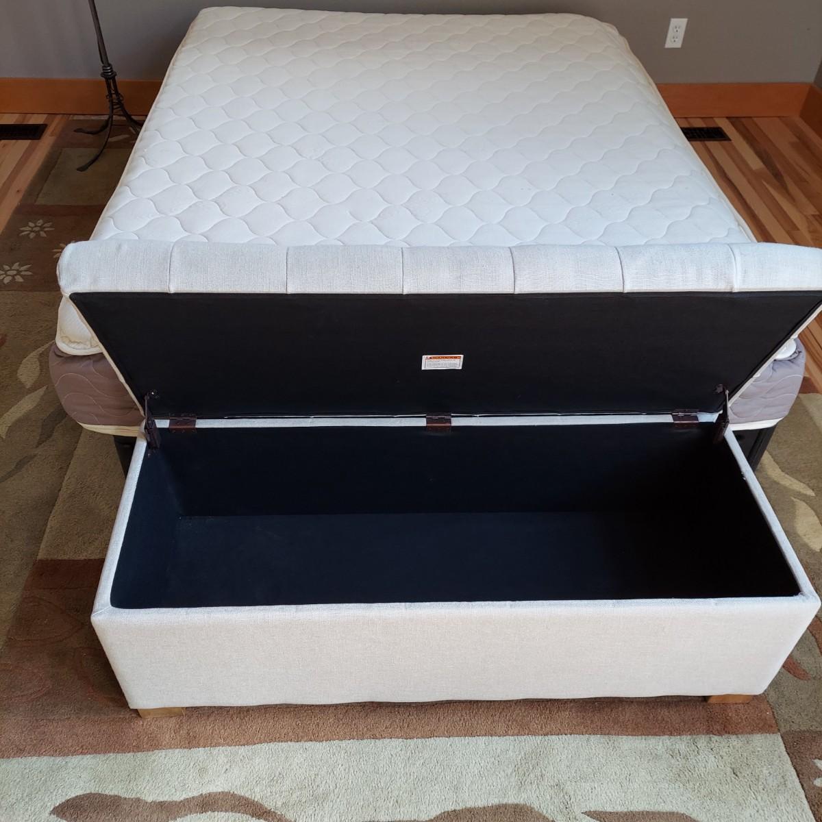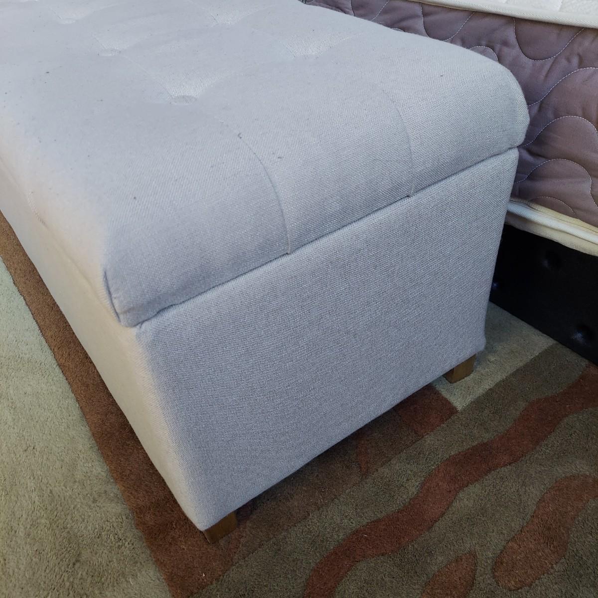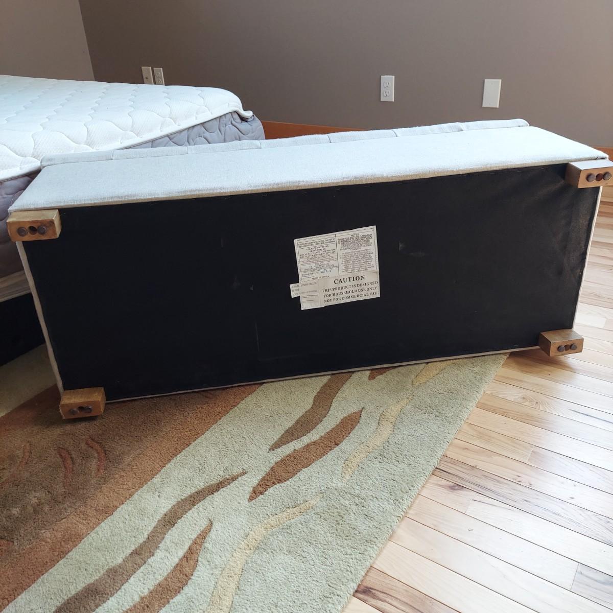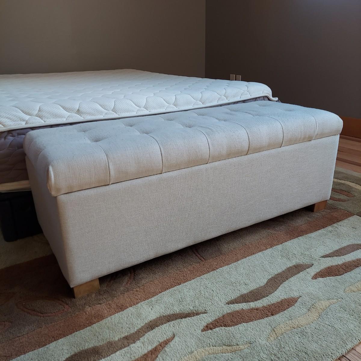 Beige upholstered storage bench ottoman. There is some overall wear. Please see photos and note item is from a pet owned home. Measures approximately 46 x 18 x 17"H. Local Pickup Only.