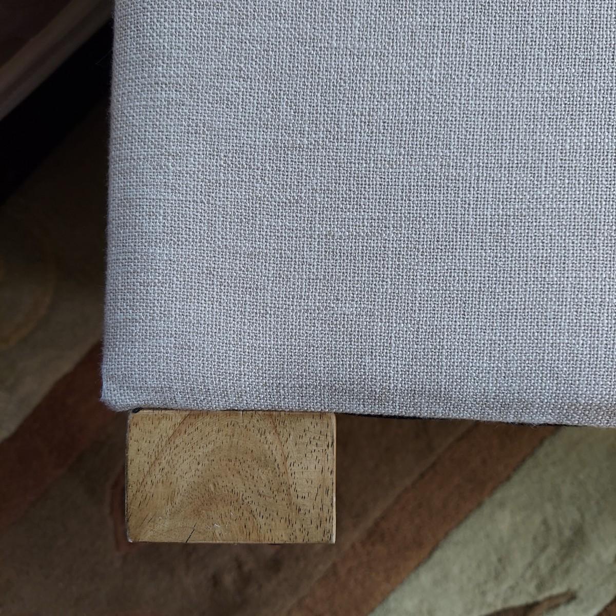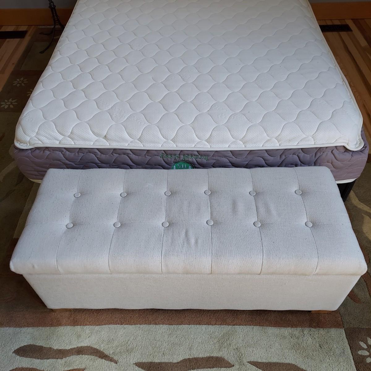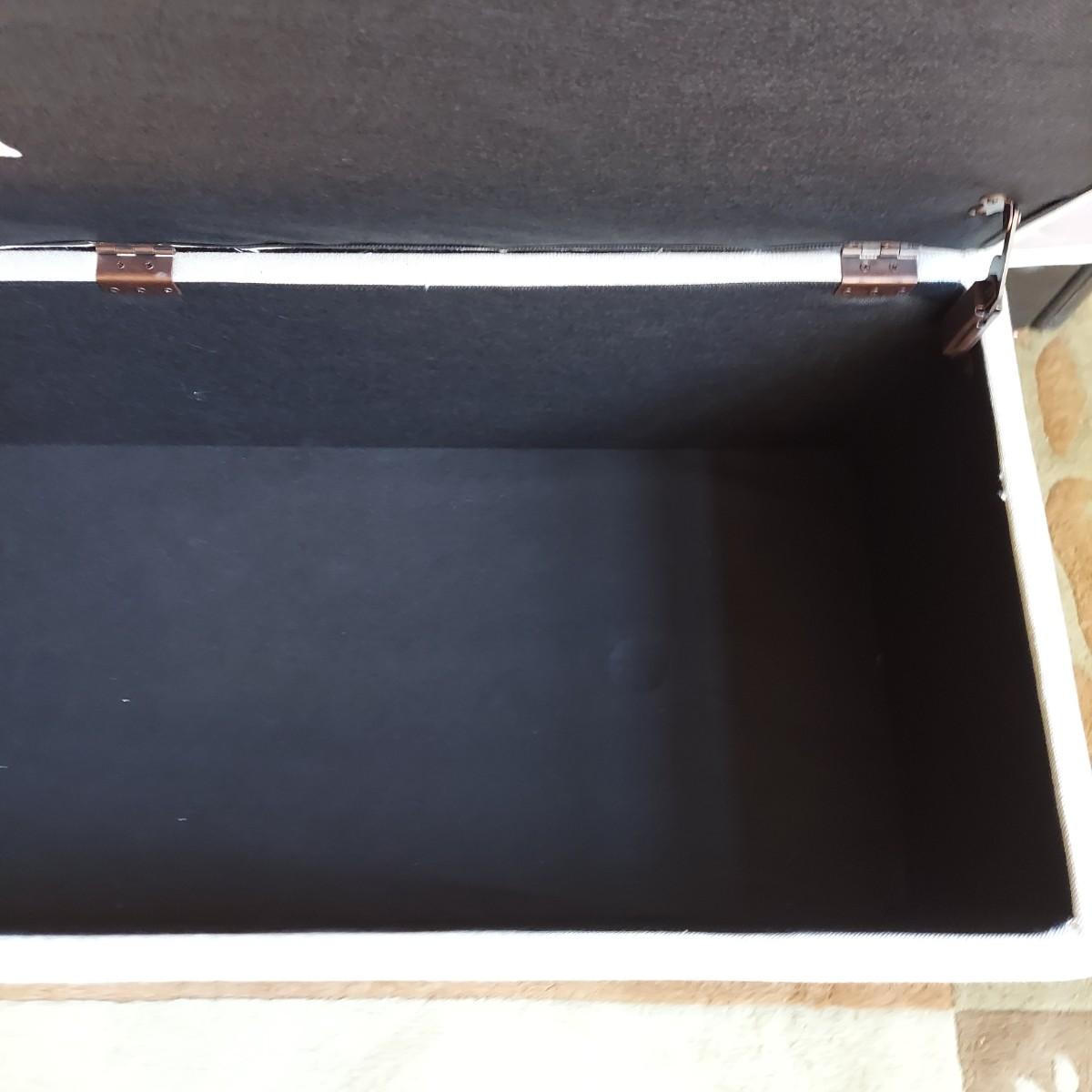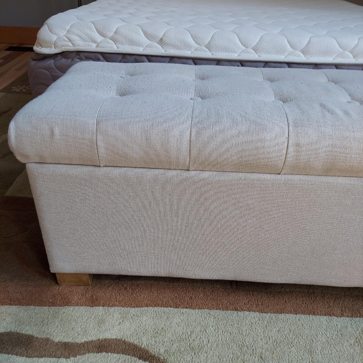 Beige upholstered storage bench ottoman. There is some overall wear. Please see photos and note item is from a pet owned home. Measures approximately 46 x 18 x 17"H. Local Pickup Only.