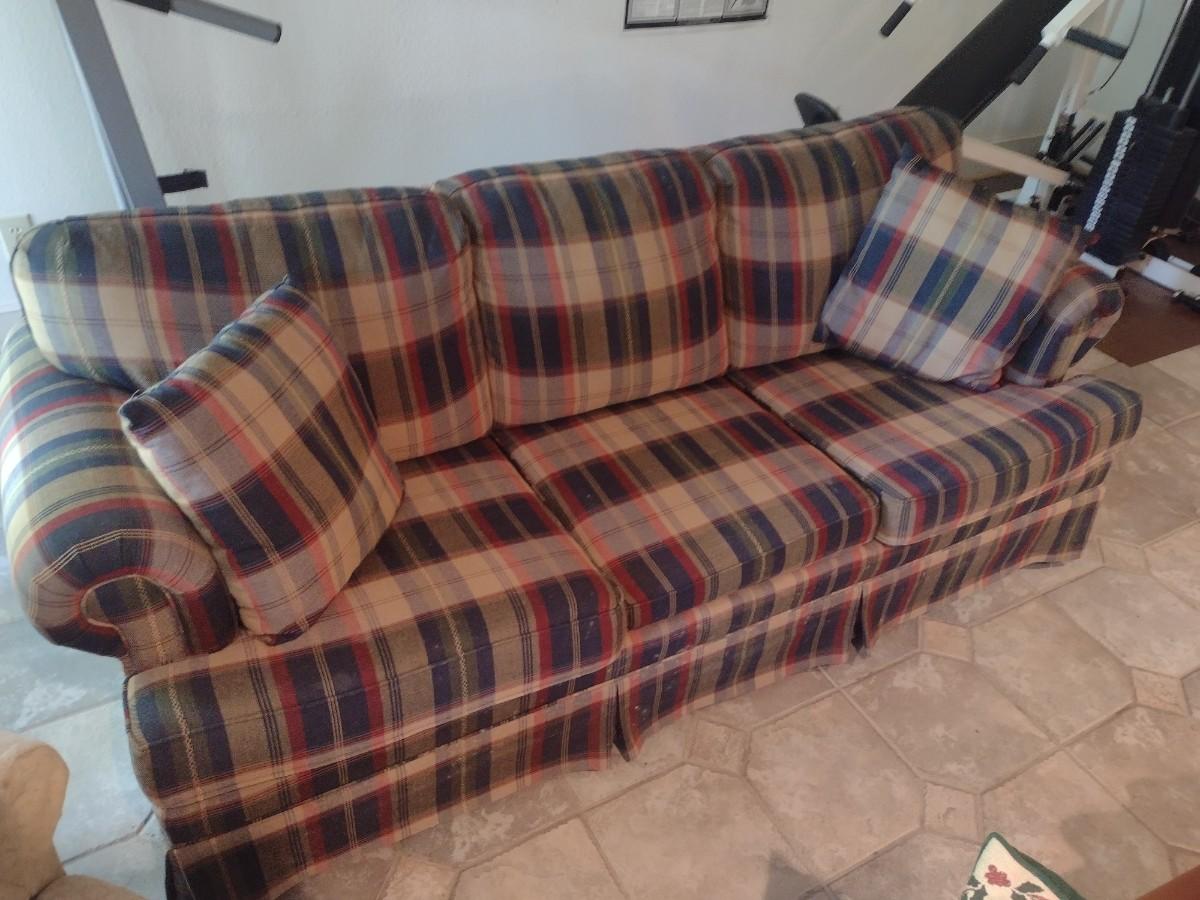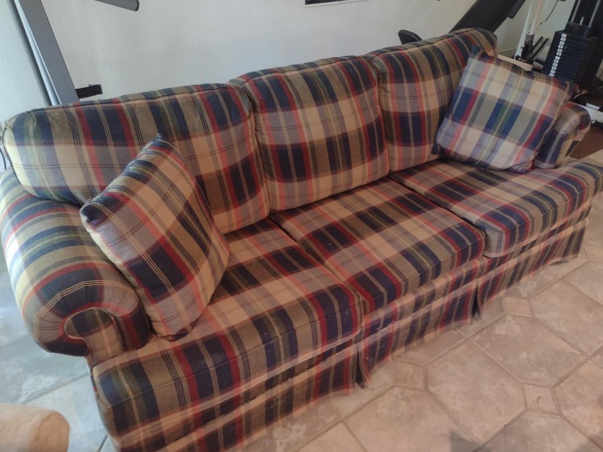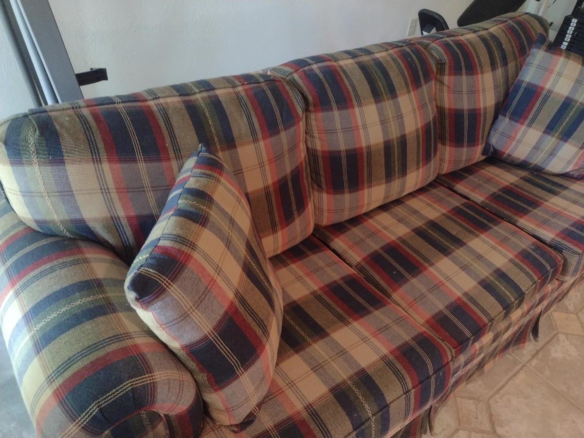 Upholstered Three Cushion Sofa/Sleeper. Lower-level item. Bring assistance to carry up the stairs to the main floor