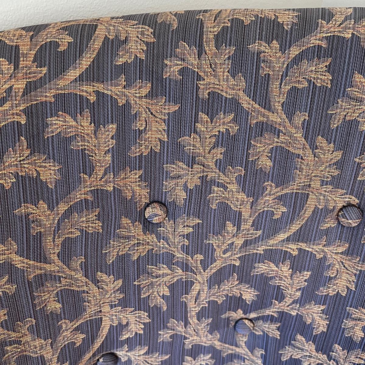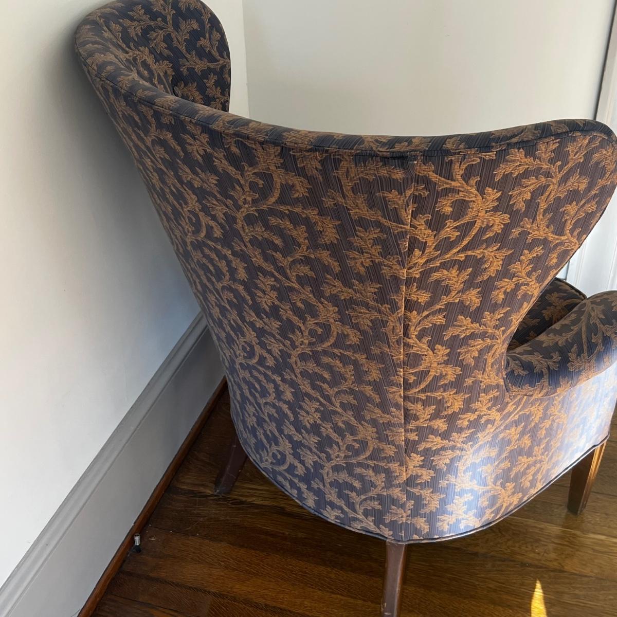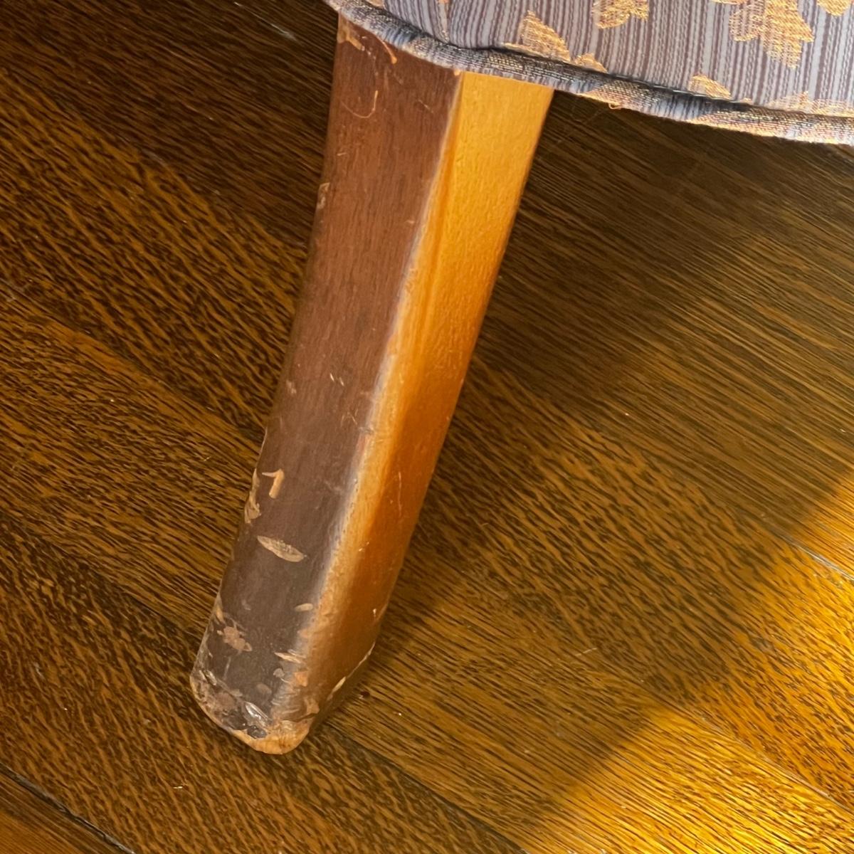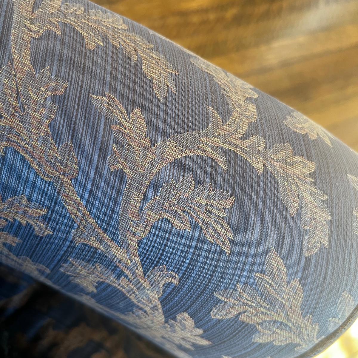 Beautiful periwinkle silk like upholstery has a pale gold vine design. No label found. The springs are bulging downwards as you will see from the last photo, however the chair is very comfortable and feels firm. The legs have knicks shown in photos.