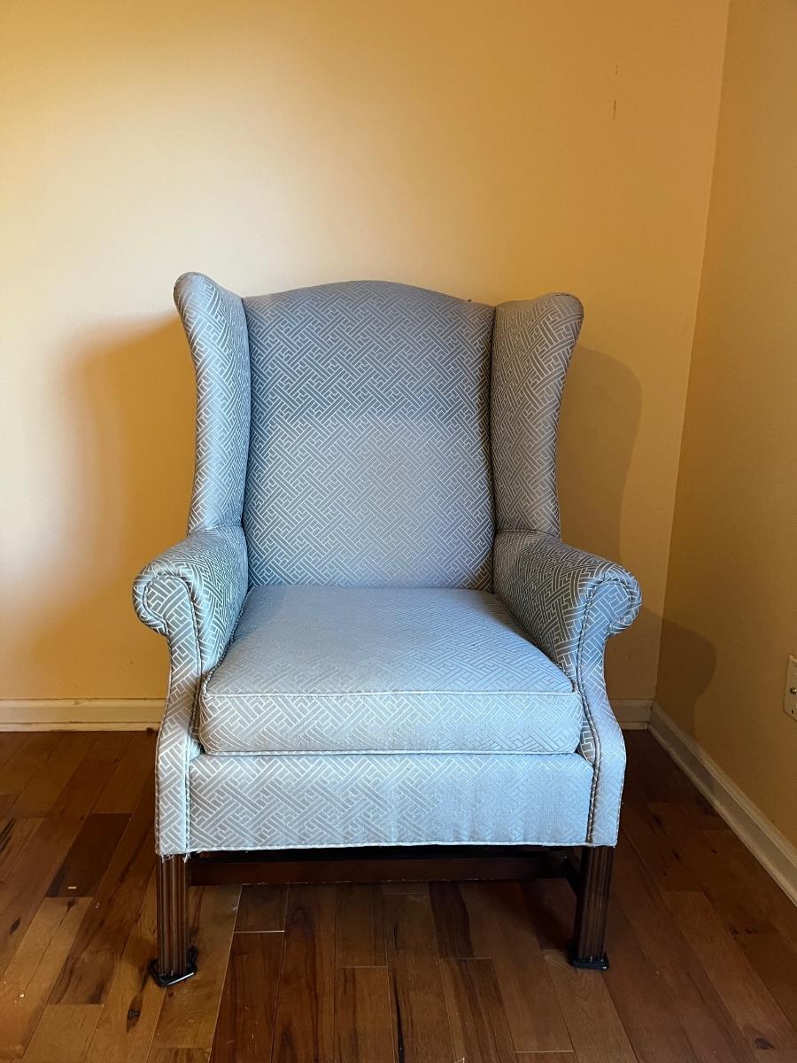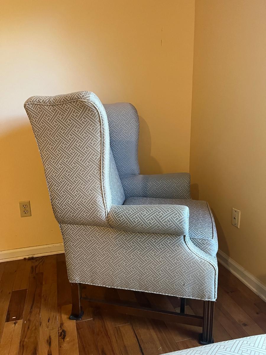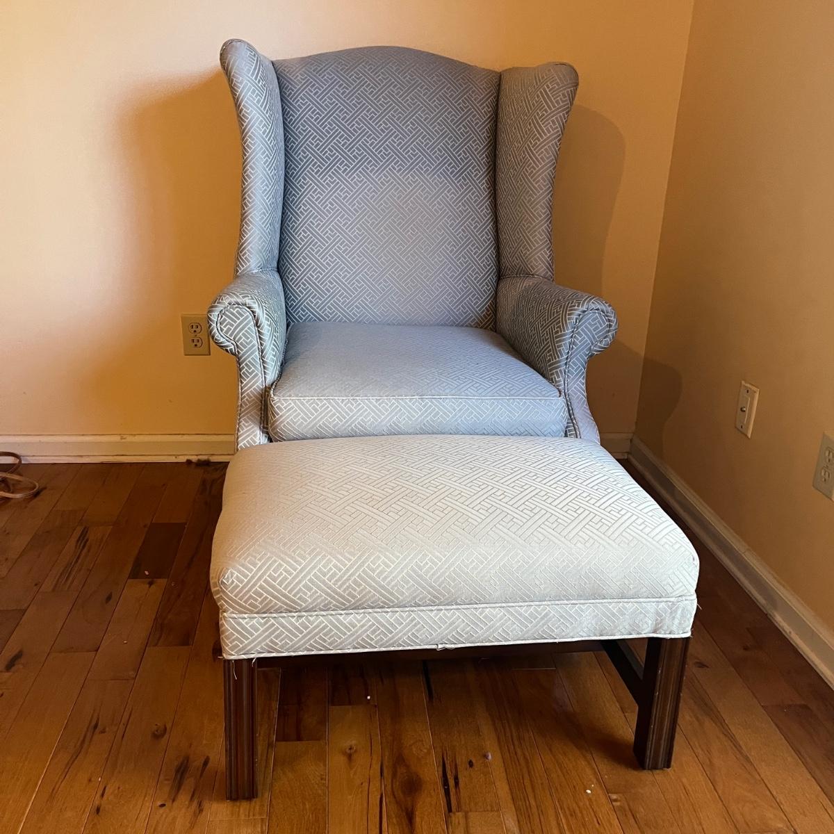 Lot includes an upholstered wingback chair with ottoman. Chair measures 31” x 32” x 43”H with a seat height of 18.5”. Chair has sun bleaching, see pictures; the original color is blue and has faded to more a blue/gray color.